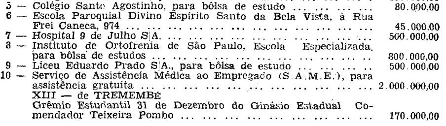 Artigo 2.º - Ficam retificados para Grêmio Politécnico, da Escola Politécnica da Universidade de São Paulo, para bôlsa de estudo (Casa do Politécnico), de São Paulo, Colégio Comercial Frederico Ozanan, para bôlsa de estudo, de São Paulo, Comissão Central de Esportes, de Rio Claro, para a Liga Bochófila de Rio Claro, Comissão Central de Esportes, de Rio Claro, para a Liga de Malha de Rio Claro, Escola Comercial "Dr. Clovis Bevilacqua", de Santo André, Hospital Nossa Senhora de Fátima Ltda., de São Paulo, e Hospital Nossa Senhora do Carmo S|A., de São Paulo, respectivamente, os nomes das entidades beneficiadas com os auxílios constantes dos n. 6 e 15 do item XXXIX da Relação n. 59; dos n. 69 e 70 do item XXIV da Relação n. 93; do n. 4 do item XXV e dos n. 137 e 138 do item XXX da Relação n. 101, tôdas do Artigo 1.° da Lei n. 8.099, de 7 de abril de 1964.