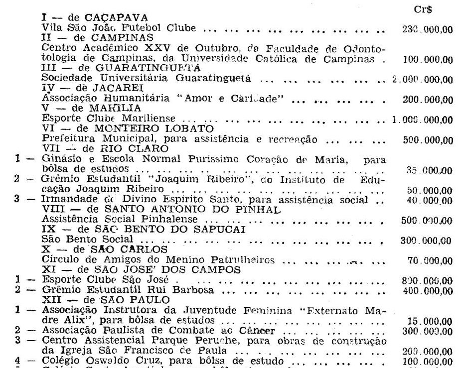 Artigo 2.º - Ficam retificados para Grêmio Politécnico, da Escola Politécnica da Universidade de São Paulo, para bôlsa de estudo (Casa do Politécnico), de São Paulo, Colégio Comercial Frederico Ozanan, para bôlsa de estudo, de São Paulo, Comissão Central de Esportes, de Rio Claro, para a Liga Bochófila de Rio Claro, Comissão Central de Esportes, de Rio Claro, para a Liga de Malha de Rio Claro, Escola Comercial "Dr. Clovis Bevilacqua", de Santo André, Hospital Nossa Senhora de Fátima Ltda., de São Paulo, e Hospital Nossa Senhora do Carmo S|A., de São Paulo, respectivamente, os nomes das entidades beneficiadas com os auxílios constantes dos n. 6 e 15 do item XXXIX da Relação n. 59; dos n. 69 e 70 do item XXIV da Relação n. 93; do n. 4 do item XXV e dos n. 137 e 138 do item XXX da Relação n. 101, tôdas do Artigo 1.° da Lei n. 8.099, de 7 de abril de 1964.