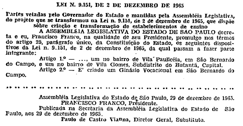 Artigo 1º - São criados Ginásios Estaduais nas seguintes localidades: um em Tarabaí (...vetado), um no Bairrro de Vila Paulicéia, em São Bernardo do Campo, e um no Bairro de Vila Gomes, Subdistrito do Butantã, Capital.
