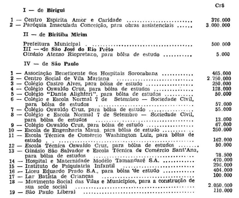 Artigo 1.º - São retificados para Colégio São Gabriel, de Osasco, Gazeta de Junqueirópolis, de Junqueirópolis, Serviço Social da Paróquia de São João Batista - Vila Mira -, para assistência social, de São Paulo, Serviço Social da Paróquia de São João Batista - Vila Mira - para parque infantil, de São Paulo Clube Adamus de Voleibol, para construção, de São Paulo, Órgao de Cooperação Escolar do Instituto de Educação Prof. Stélio Machado Loureiro, para a Caixa Escolar do Curso Primário Anexo de Birigui, Fundo de Pesquisas do Instituto de Cardiologia do Estado de São Paulo, de São Paulo, e Sociedade dos Parques Unidos de Novo Oratório, Santo Alberto e Capuava, de Santo André, respectivamente, os nomes das entidades beneficiadas com os auxílios constantes do item XIII da Relação n. 15; do n. 2 do item XX da Relação n. 29; dos n. 99 e 100 do item XXII da Relação n. 30; do n. 55 do item XVI da Relação n. 50; do n. 21 do item XI e do n. 12 do item XLVII da Relação n. 76; e do n. 72 do item VII de Relação n. 117, tôdas do artigo 1.º da Lei n. 8.099, de 7 de abril de 1964