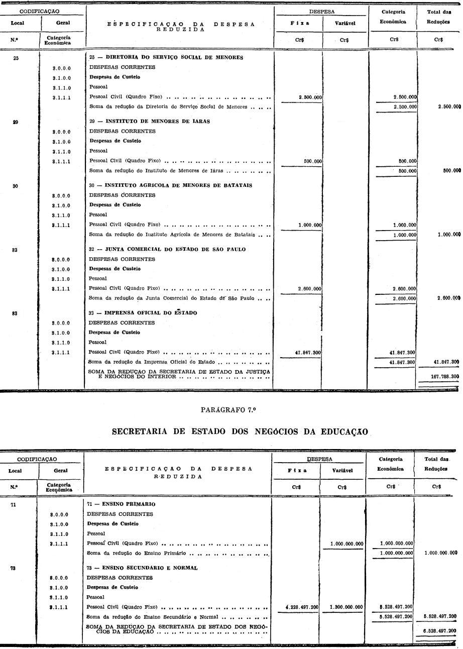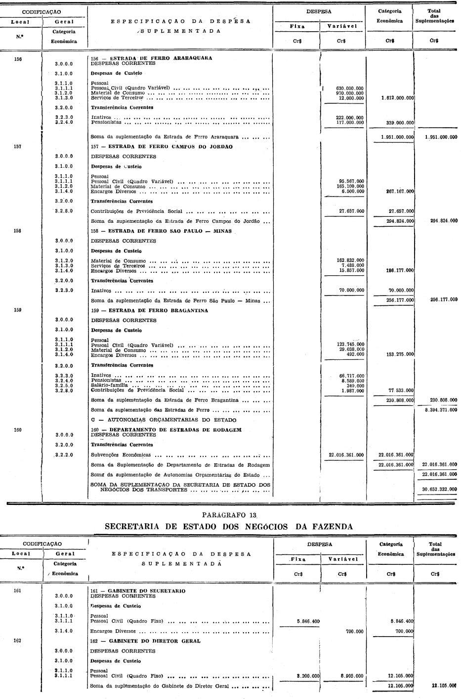 b) Cr$ 9.393.151.000 (NOVE BILHÕES, TREZENTOS E NOVENTA E TRÊS MILHÕES, CENTO E CINQUENTA E MIL CRUZEIROS), provenientes de excesso de arrecadação previsto no corrente exercício, referente às Estradas de Ferro da Administração direta do Estado, na importância de Cr$ 8.720.153.000 (OITO BILHÕES, SETECENTOS E VINTE MILHÕES, CENTO E CINQUENTA E TRÊS MIL CRUZEIROS), e Cr$ 670.000.000 (SEISCENTOS E SETENTA MILHÕES DE CRUZEIROS), do Serviço de Águas de Santos e Cubatão;