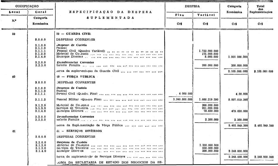 Artigo 1º - Ficam suplementadas, na importância de Cr$ 418.480.089.900 (QUATROCENTOS E DEZOITO BILHÕES, QUATROCENTOS E OITENTA MILHÕES, OITENTA E NOVE MIL E NOVECENTOS CRUZEIROS) as verbas do orçamento vigente abaixo discriminadas: