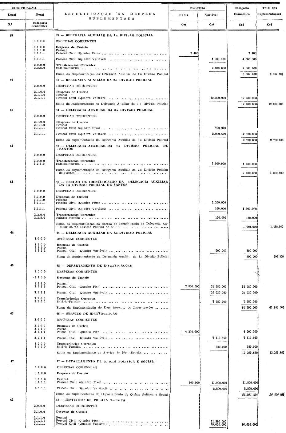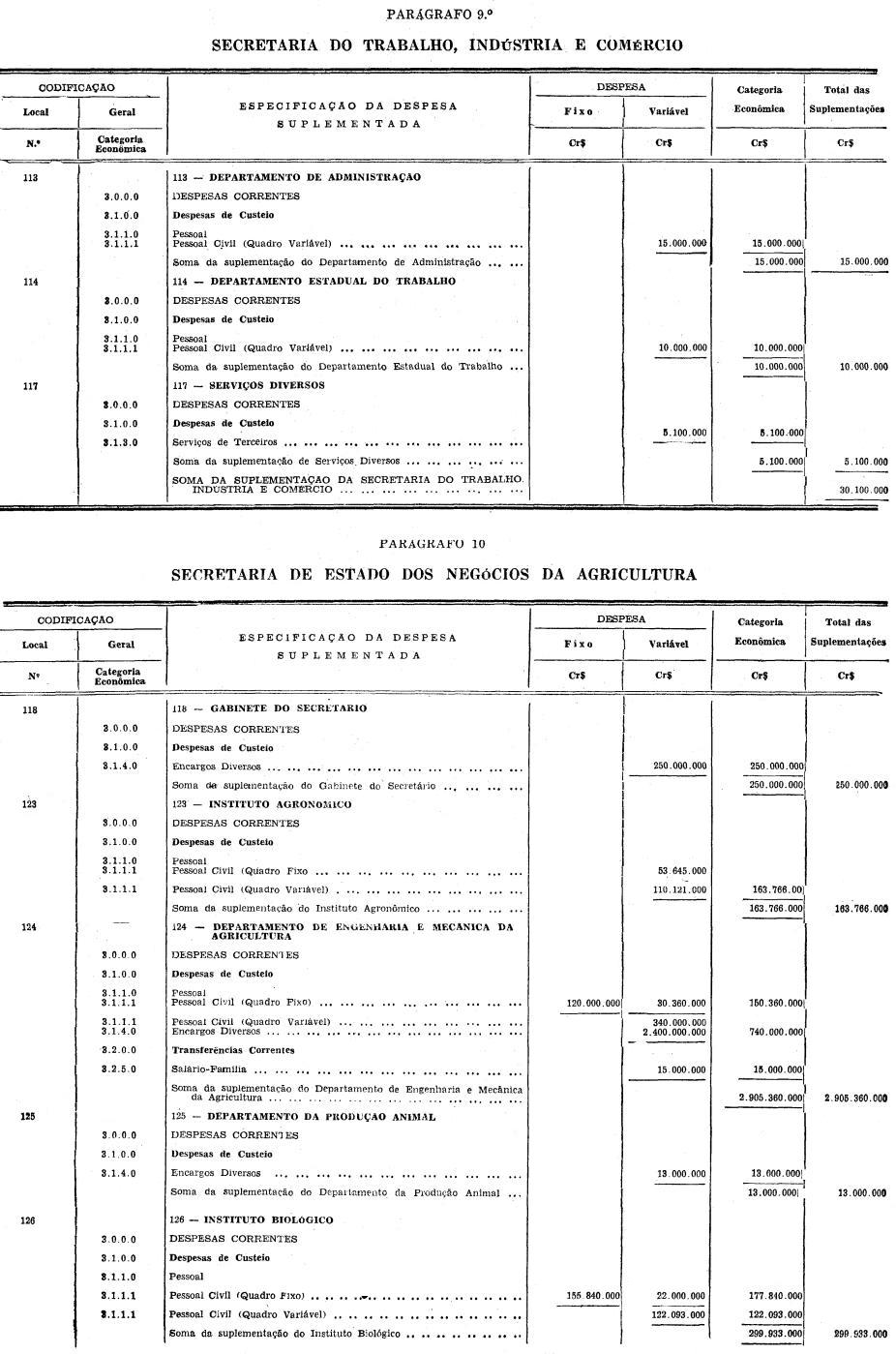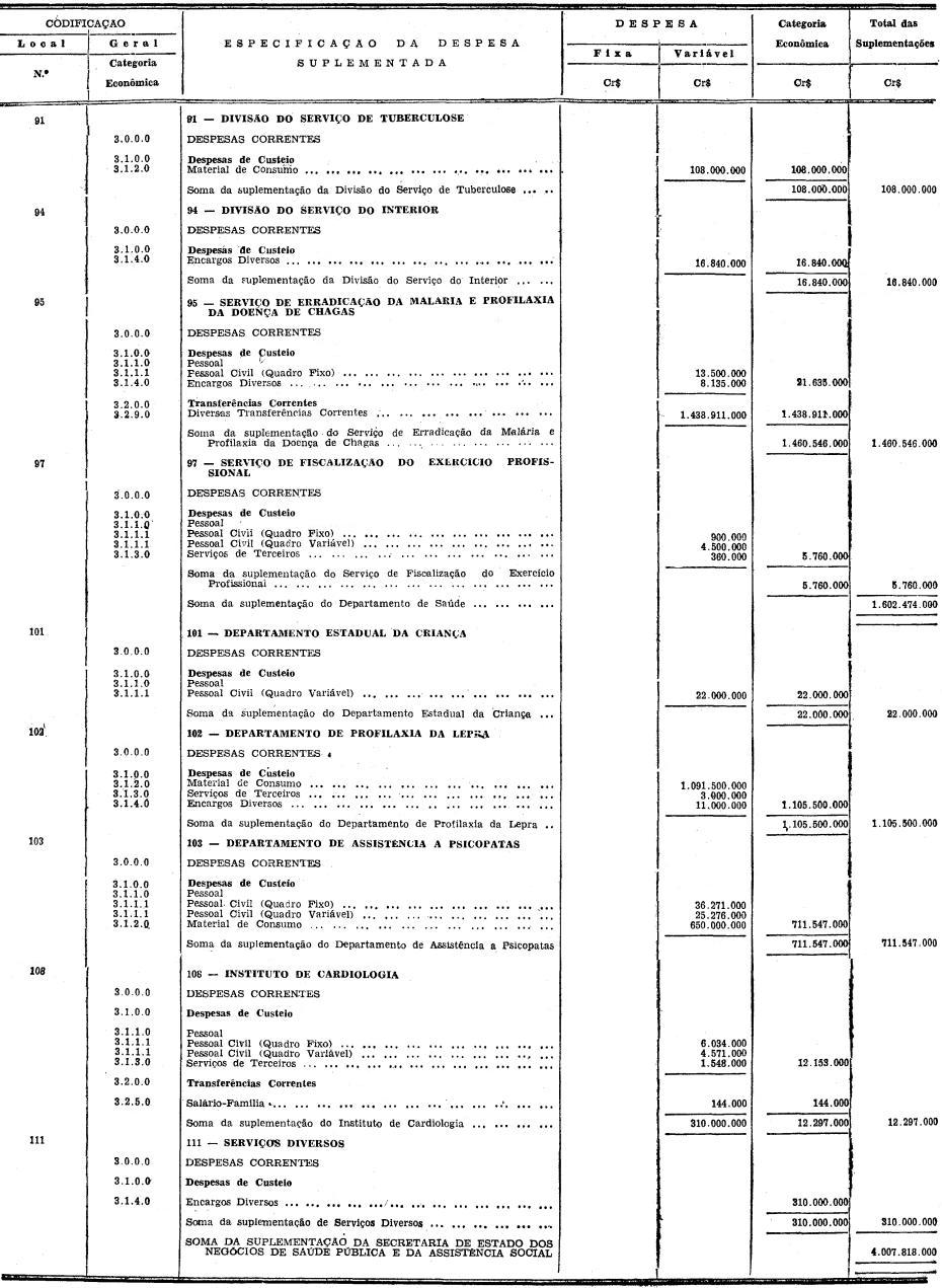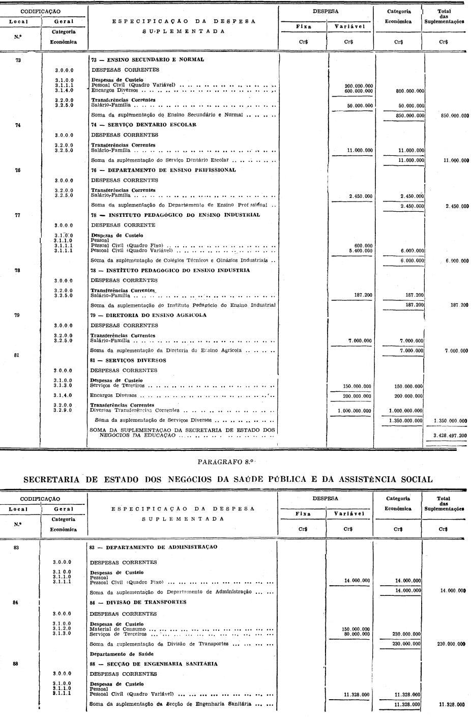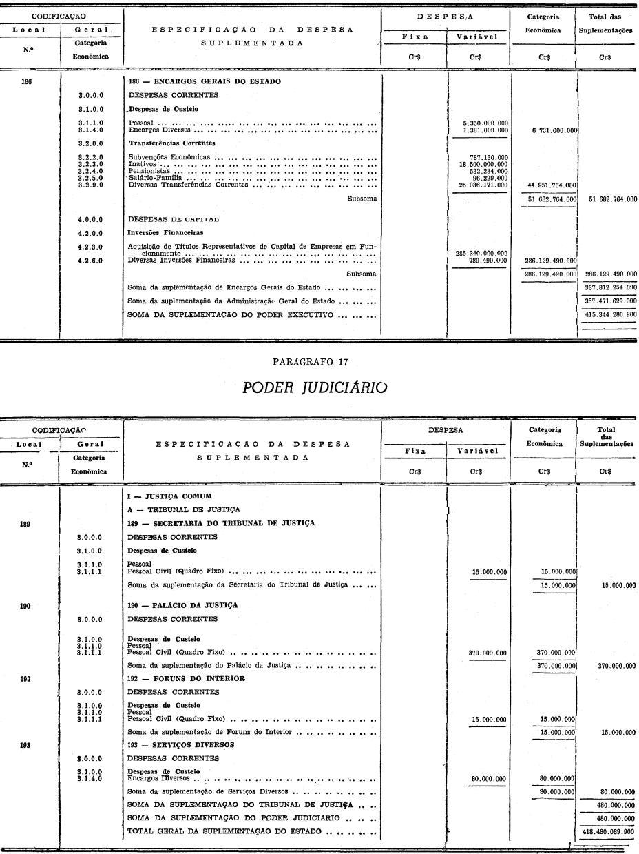 Artigo 1º - Ficam suplementadas, na importância de Cr$ 418.480.089.900 (QUATROCENTOS E DEZOITO BILHÕES, QUATROCENTOS E OITENTA MILHÕES, OITENTA E NOVE MIL E NOVECENTOS CRUZEIROS) as verbas do orçamento vigente abaixo discriminadas: