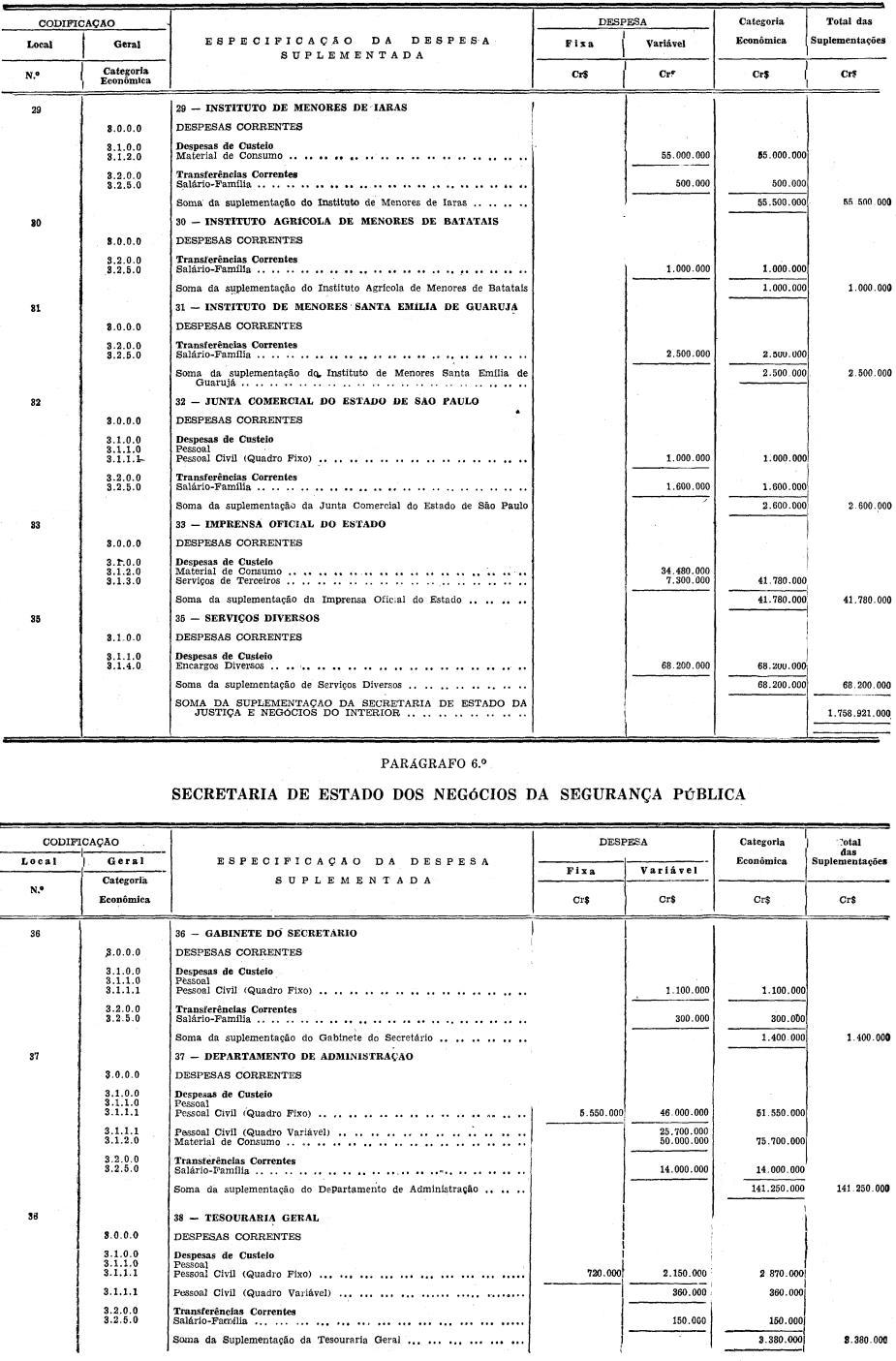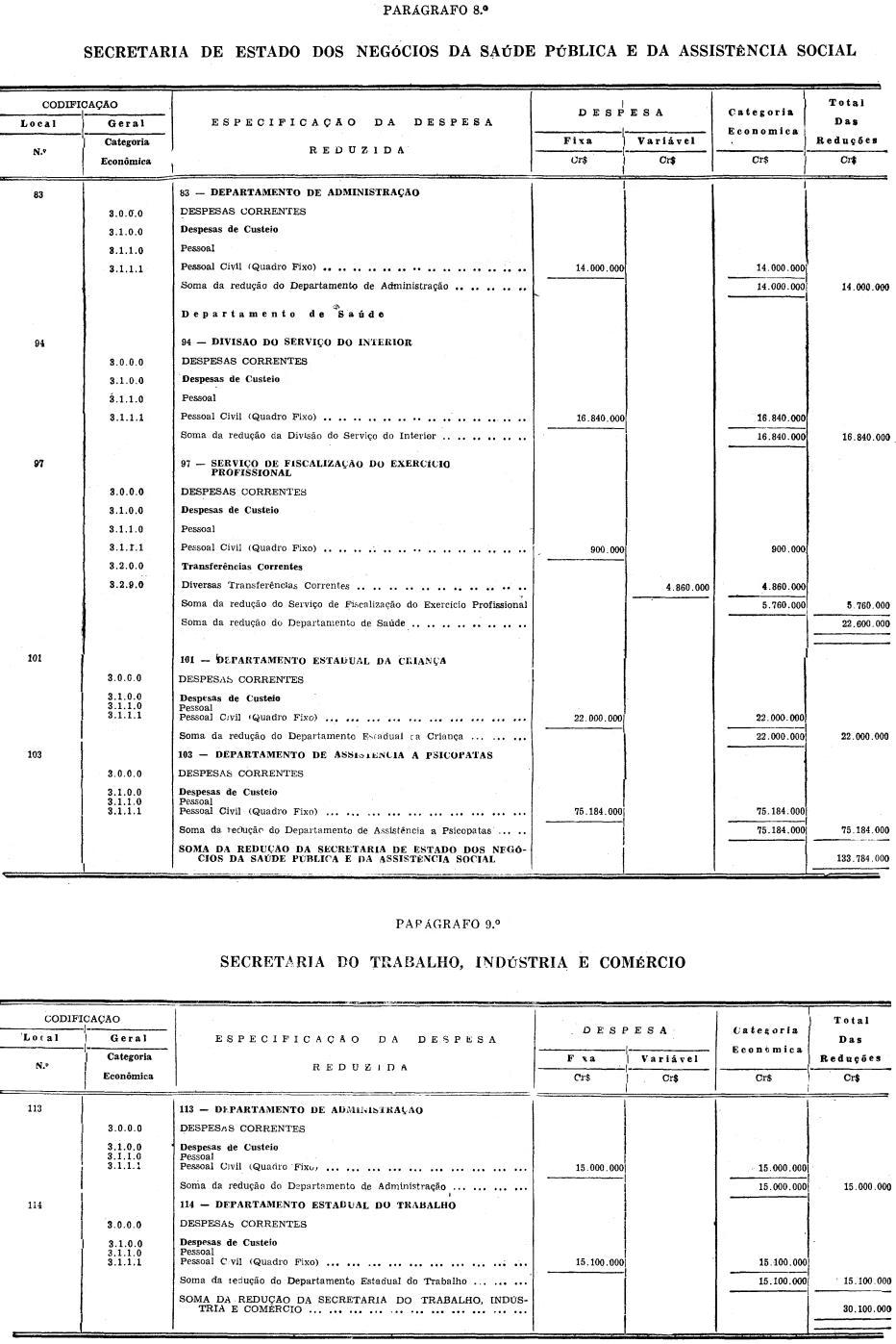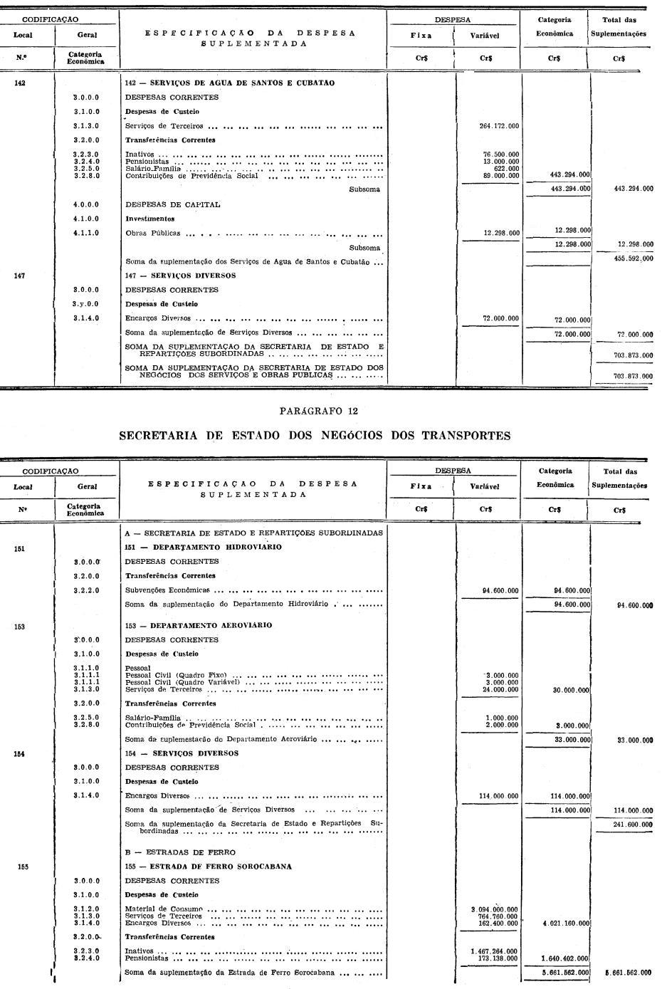 b) Cr$ 9.393.151.000 (NOVE BILHÕES, TREZENTOS E NOVENTA E TRÊS MILHÕES, CENTO E CINQUENTA E MIL CRUZEIROS), provenientes de excesso de arrecadação previsto no corrente exercício, referente às Estradas de Ferro da Administração direta do Estado, na importância de Cr$ 8.720.153.000 (OITO BILHÕES, SETECENTOS E VINTE MILHÕES, CENTO E CINQUENTA E TRÊS MIL CRUZEIROS), e Cr$ 670.000.000 (SEISCENTOS E SETENTA MILHÕES DE CRUZEIROS), do Serviço de Águas de Santos e Cubatão;