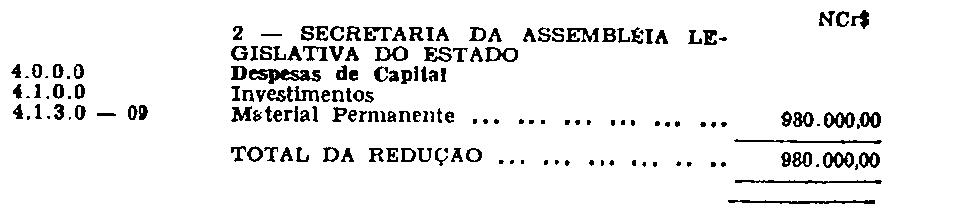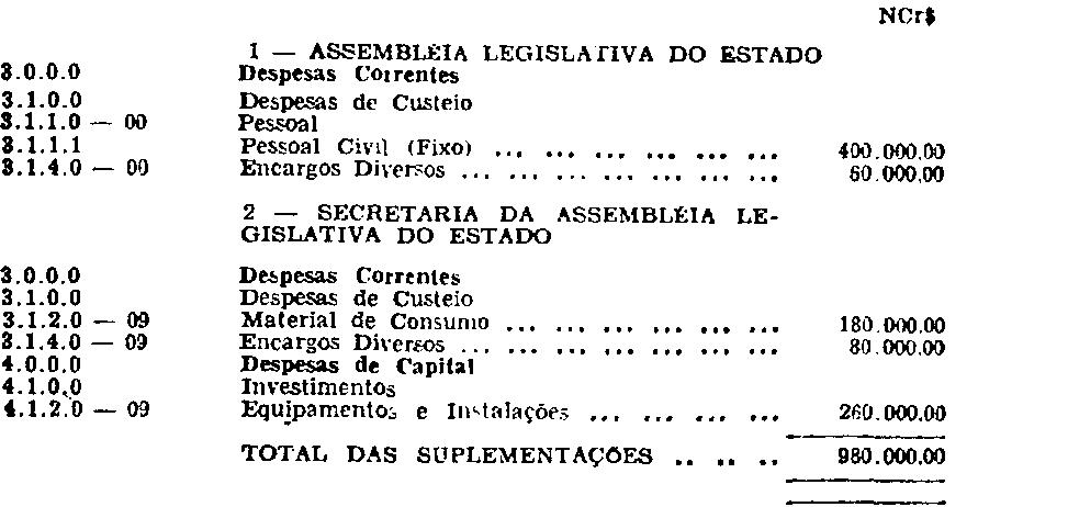 Artigo 1º - Fica o Poder Executivo autorizado a abrir na Secretaria da Fazenda, ao Poder Legislativo, um crédito na importância de NCr$ 980.000,00 (novecentos e oitenta mil cruzeiros novos). suplementar às dotações do Orçamento abaixo discriminadas: