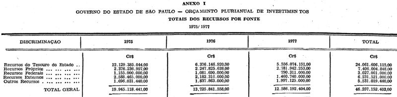 O GOVERNADOR DO ESTADO DE SÃO PAULO:Faço saber que, nos termos dos §§ 1° e 3° do artigo 24 da Constituição do Estado (Emenda n. 2), promulgo a seguinte lei:Artigo 1° - O Orçamento Plurianual de Investimentos, para o triênio de 1975 a 1977, estima recursos no valor de Cr$ 46.257.152.403,00 (quarenta e seis bilhões, duzentos e cinquenta e sete milhões, cento e cinquenta e dois mil, quatrocentos e três cruzeiros) e programa dispêndios de igual montante.Artigo 2° - Os recursos previstos para o financiamento do Orçamento Plurianual de Investimentos, para o triênio de 1975 a 1977, são distribuídos na forma do Anexo I, que é parte integrante desta lei.Artigo 3° - A programação das Despesas de Capital, por função, desdobra-se na forma do Anexo II, que integra esta lei.Artigo 4° - A distribuição dos recursos e a dos dispêndios fixados nos artigos 2° e 3° desta lei poderão ser realocadas pelo Poder Executivo, desde que não se alterem os valores totais estabelecidos para cada exercício.Artigo 5° - Fica o Poder Executivo autorizado a incluir no Orçamento Plurianual de Investimentos, para o triênio de 1975 a 1977, recursos provenientes de créditos suplementares a serem abertos nos termos dos artigos 7° e 43 da Lei federal n. 4.320, de 17 de março de 1964.Artigo 6° - Esta lei entrará em vigor em 1° de janeiro de 1975.Palácio dos Bandeirantes, 26 de novembro de 1974.LAUDO NATELWaldemar Mariz de Oliveira JúniorSecretário da JustiçaCarlos Antonio RoccaSecretário da FazendaRubens Araujo DiasSecretário da AgriculturaJosé MeichesSecretário dos Serviços e Obras PúblicasPaulo Salim MalufSecretário dos TransportesPaulo Gomes RomeoSecretário da EducaçãoAntonio Erasmo DiasSecretário da Segurança PúblicaMário Romeu de LuccaSecretário da Promoção SocialCiro AlbuquerqueSecretário do Trabalho e AdministraçãoCândido de Oliveira TrigoRespondendo pelo Expediente da Secretaria da SaúdeSérgio Baptista ZaccarelliSecretário de Economia e PlanejamentoHugo Lacorte VitaleSecretário do InteriorPedro de Magalhães PadilhaSecretário da CulturaEsportes e Turismo.Henri Couri AidarSecretário de Estado-Chefe da Casa CivilPublicada na Assessoria Técnico-Legislativa, aos 26 de novembro de 1974.Nelson Petersen da CostaDiretor Administrativo - Subst.