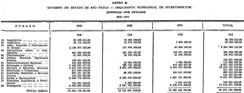 O GOVERNADOR DO ESTADO DE SÃO PAULO:Faço saber que, nos termos dos §§ 1° e 3° do artigo 24 da Constituição do Estado (Emenda n. 2), promulgo a seguinte lei:Artigo 1° - O Orçamento Plurianual de Investimentos, para o triênio de 1975 a 1977, estima recursos no valor de Cr$ 46.257.152.403,00 (quarenta e seis bilhões, duzentos e cinquenta e sete milhões, cento e cinquenta e dois mil, quatrocentos e três cruzeiros) e programa dispêndios de igual montante.Artigo 2° - Os recursos previstos para o financiamento do Orçamento Plurianual de Investimentos, para o triênio de 1975 a 1977, são distribuídos na forma do Anexo I, que é parte integrante desta lei.Artigo 3° - A programação das Despesas de Capital, por função, desdobra-se na forma do Anexo II, que integra esta lei.Artigo 4° - A distribuição dos recursos e a dos dispêndios fixados nos artigos 2° e 3° desta lei poderão ser realocadas pelo Poder Executivo, desde que não se alterem os valores totais estabelecidos para cada exercício.Artigo 5° - Fica o Poder Executivo autorizado a incluir no Orçamento Plurianual de Investimentos, para o triênio de 1975 a 1977, recursos provenientes de créditos suplementares a serem abertos nos termos dos artigos 7° e 43 da Lei federal n. 4.320, de 17 de março de 1964.Artigo 6° - Esta lei entrará em vigor em 1° de janeiro de 1975.Palácio dos Bandeirantes, 26 de novembro de 1974.LAUDO NATELWaldemar Mariz de Oliveira JúniorSecretário da JustiçaCarlos Antonio RoccaSecretário da FazendaRubens Araujo DiasSecretário da AgriculturaJosé MeichesSecretário dos Serviços e Obras PúblicasPaulo Salim MalufSecretário dos TransportesPaulo Gomes RomeoSecretário da EducaçãoAntonio Erasmo DiasSecretário da Segurança PúblicaMário Romeu de LuccaSecretário da Promoção SocialCiro AlbuquerqueSecretário do Trabalho e AdministraçãoCândido de Oliveira TrigoRespondendo pelo Expediente da Secretaria da SaúdeSérgio Baptista ZaccarelliSecretário de Economia e PlanejamentoHugo Lacorte VitaleSecretário do InteriorPedro de Magalhães PadilhaSecretário da CulturaEsportes e Turismo.Henri Couri AidarSecretário de Estado-Chefe da Casa CivilPublicada na Assessoria Técnico-Legislativa, aos 26 de novembro de 1974.Nelson Petersen da CostaDiretor Administrativo - Subst.