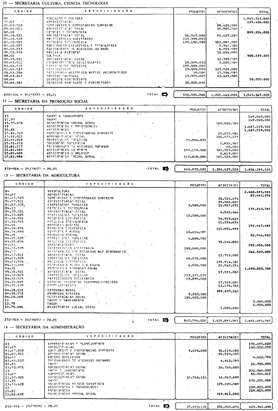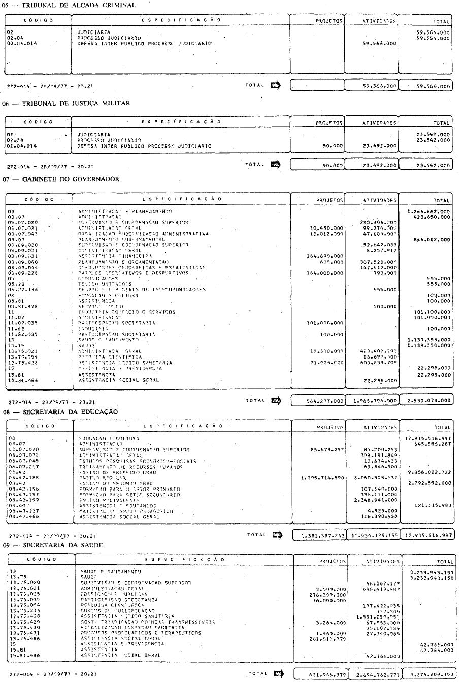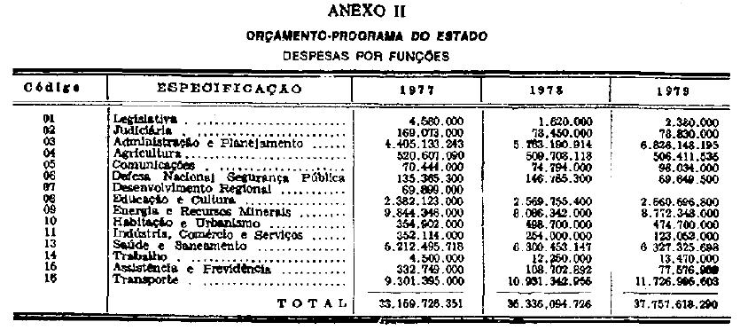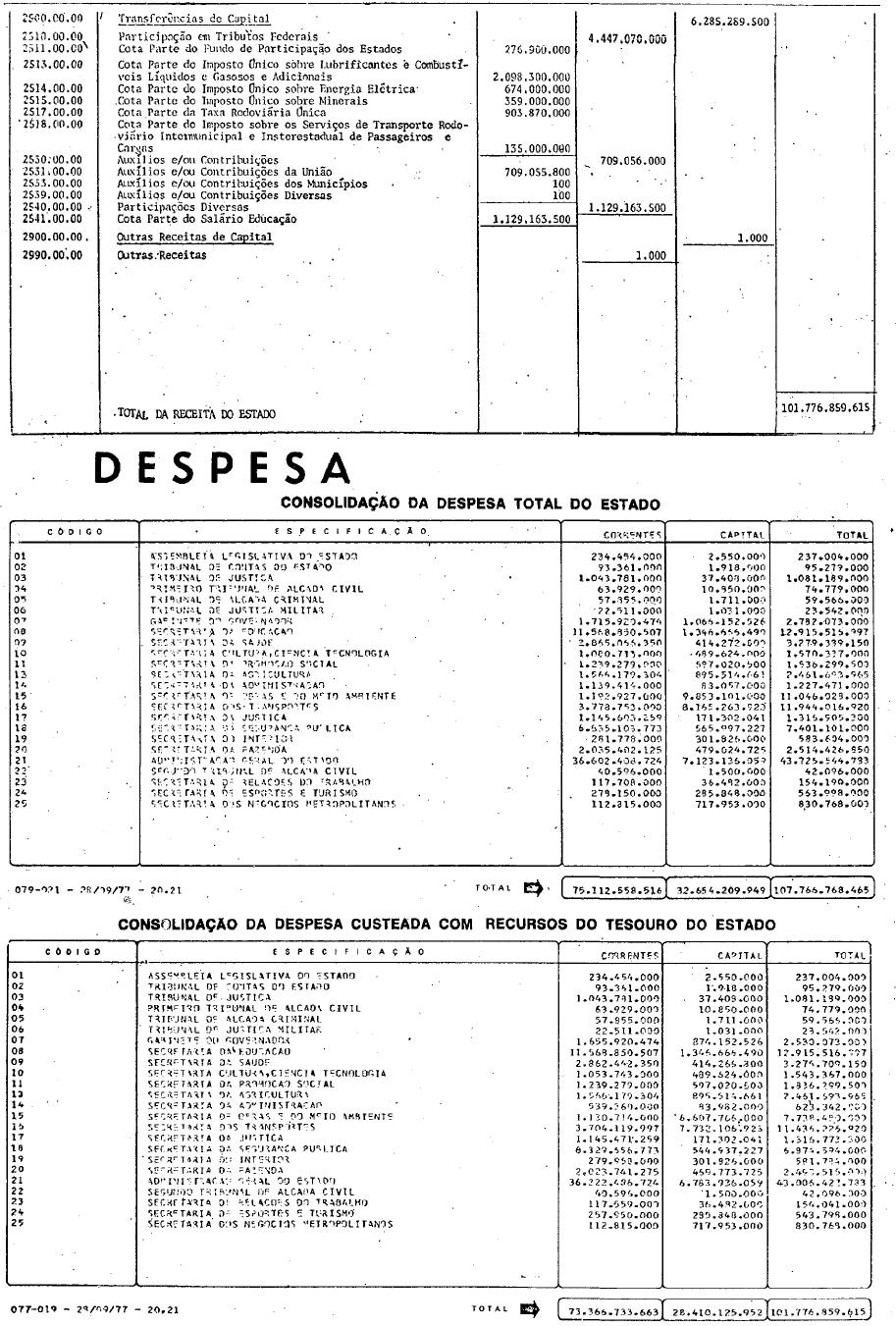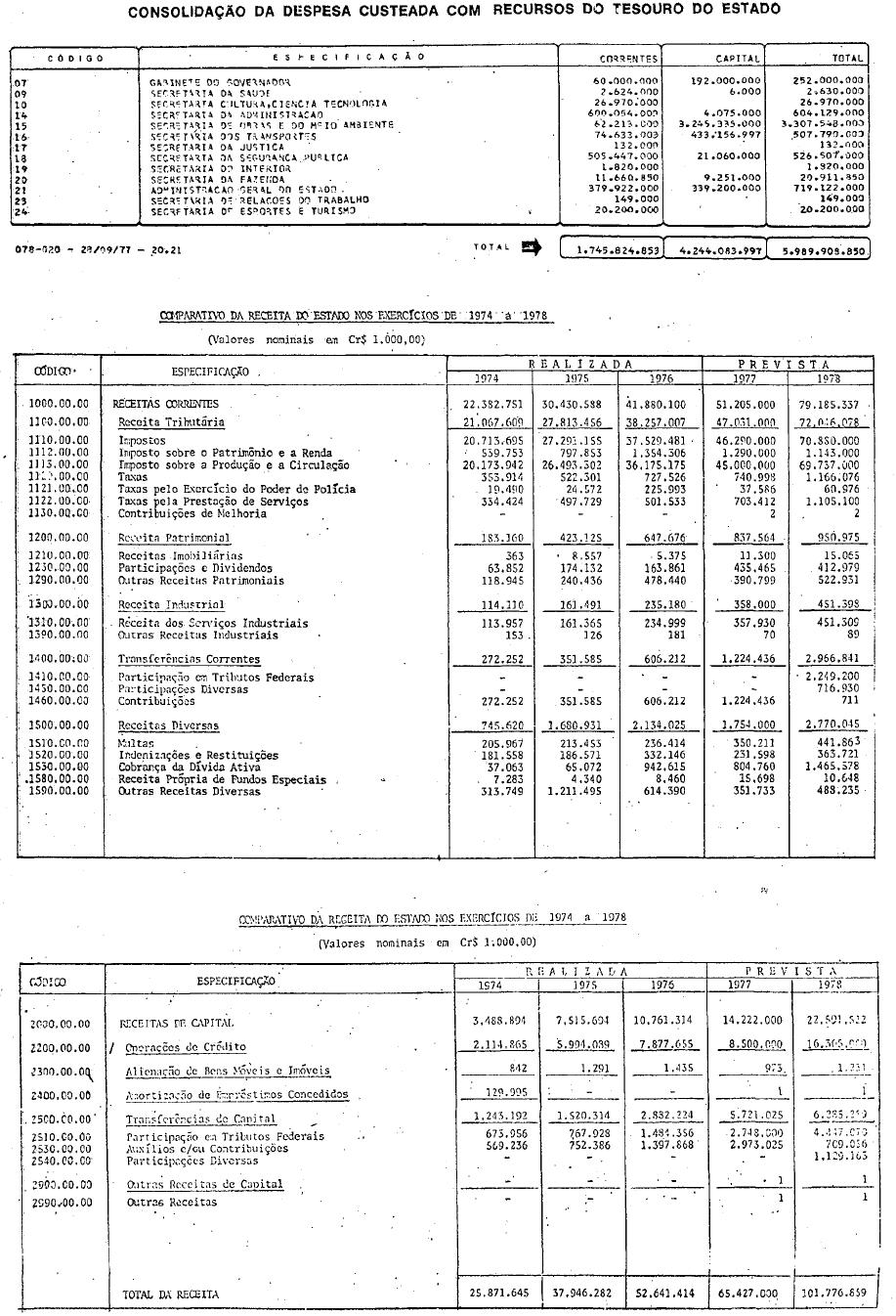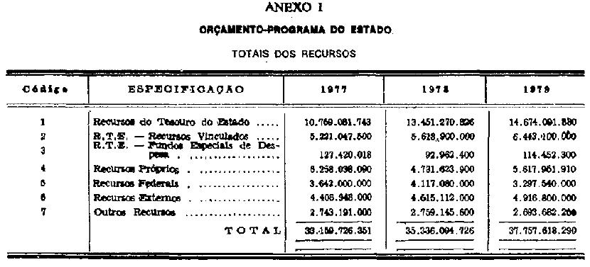 Artigo 1.º - O Orçamento-Programa do Estado para o exercício de 1978, discriminado nos quadros anexos desta lei, orça a Receita e fixa a Despesa em valores iguais a Cr$ 107.766.768.465,00 (cento e sete bilhões, setecentos e sessenta e seis milhões, setecentos e sessenta e oito mil e quatrocentos e sessenta e cinco cruzeiros).