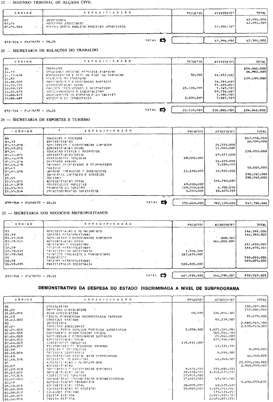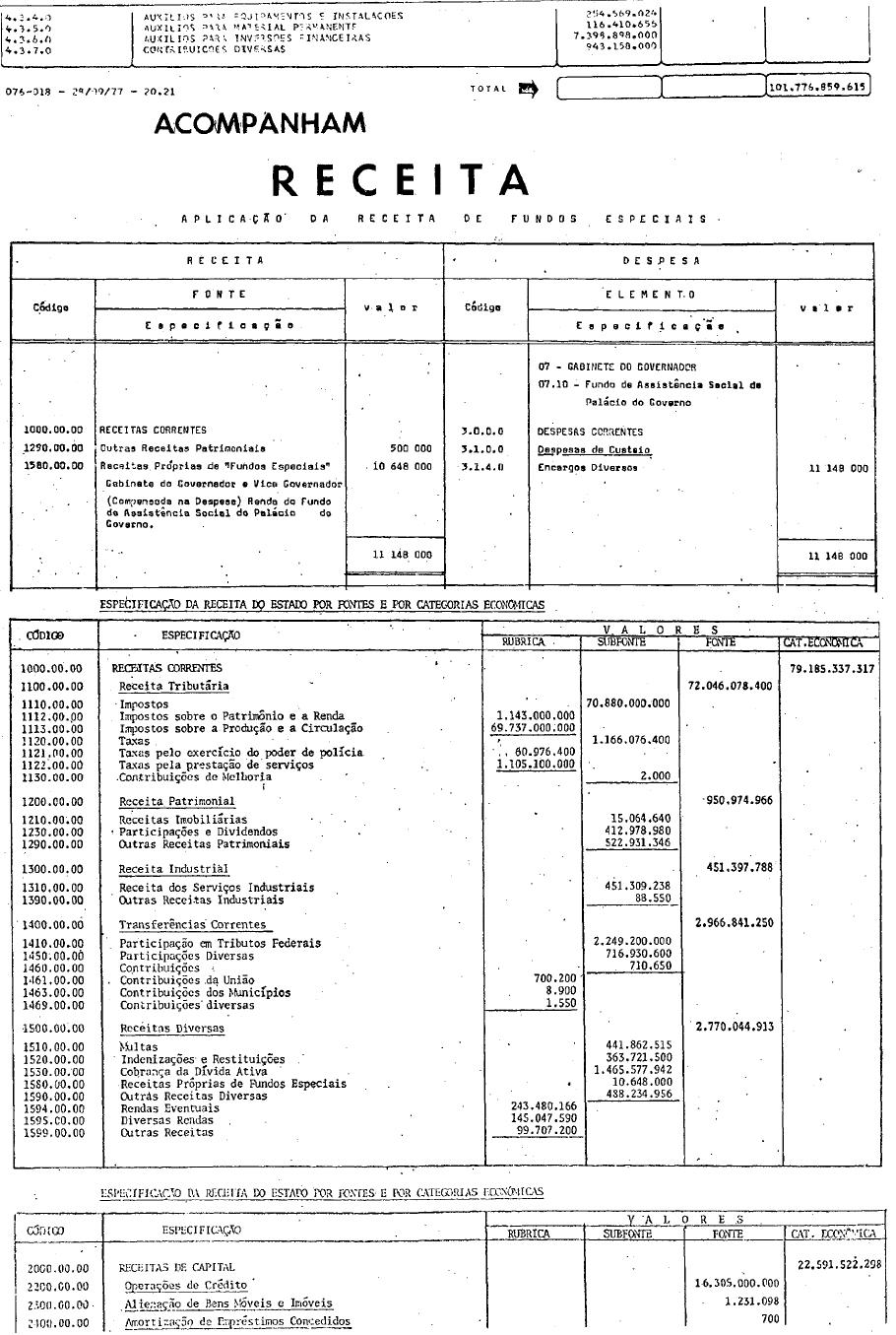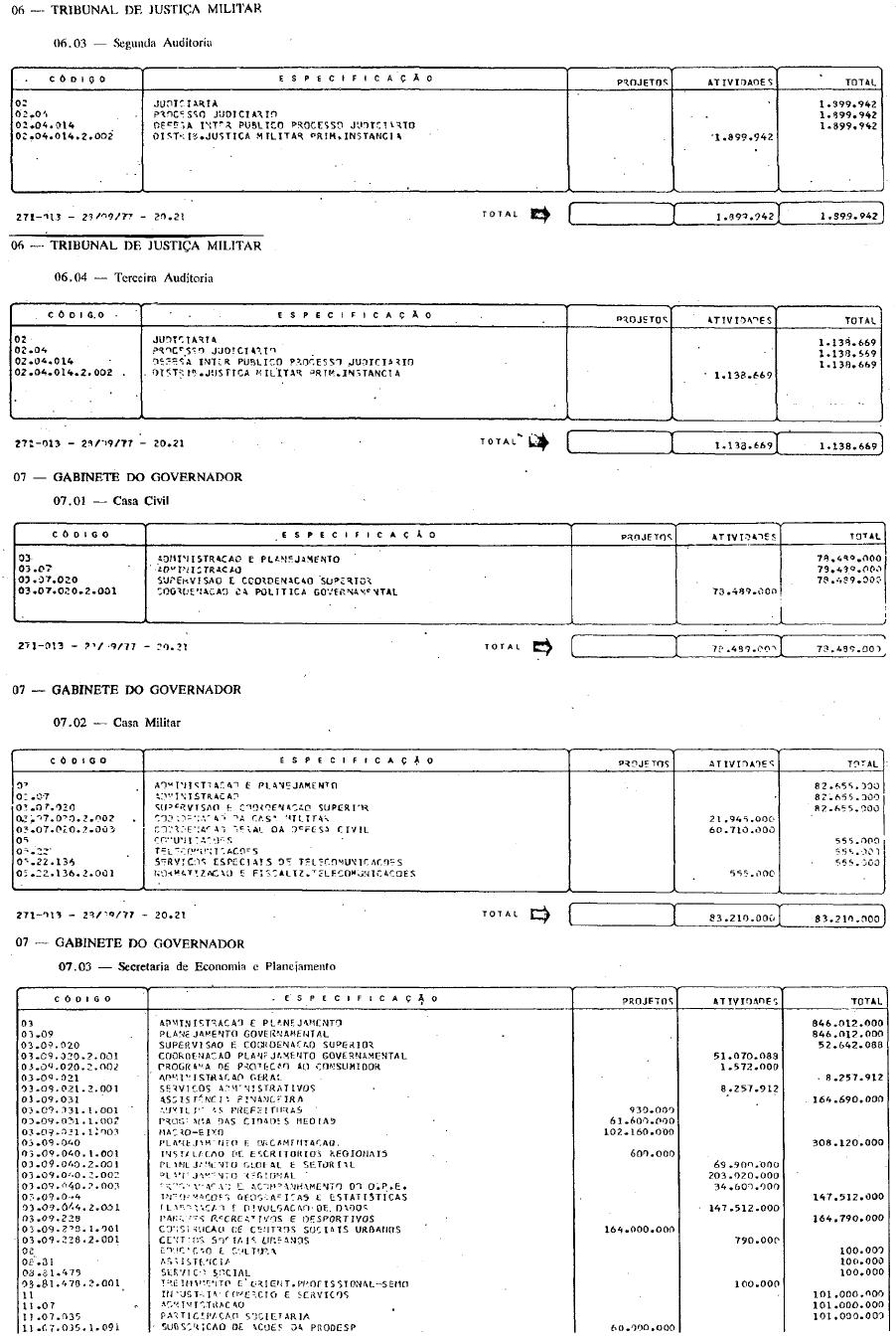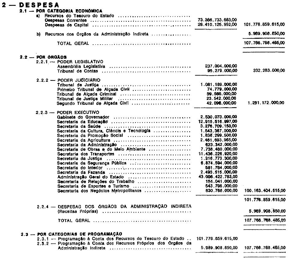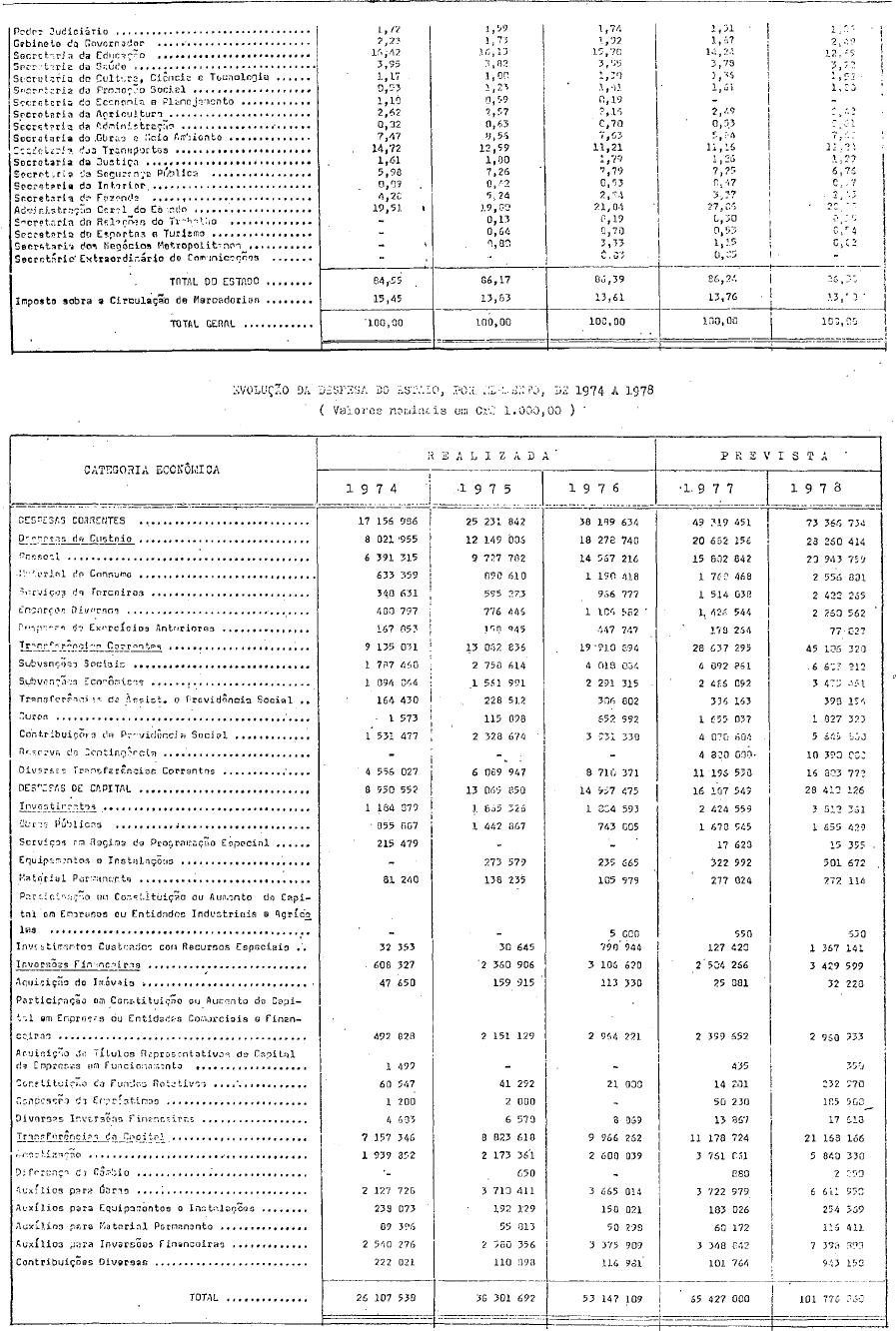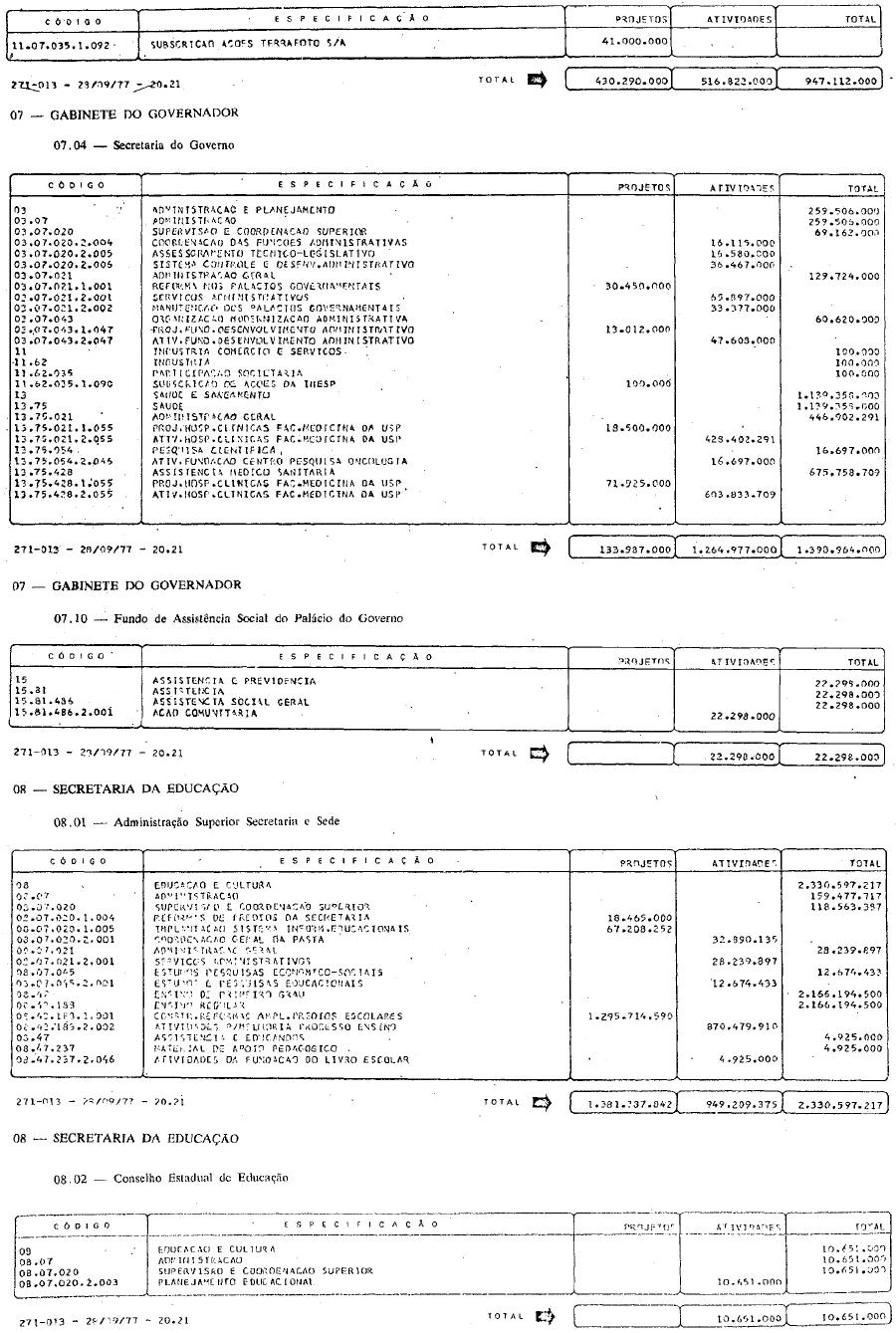 Artigo 1.º - O Orçamento-Programa do Estado para o exercício de 1978, discriminado nos quadros anexos desta lei, orça a Receita e fixa a Despesa em valores iguais a Cr$ 107.766.768.465,00 (cento e sete bilhões, setecentos e sessenta e seis milhões, setecentos e sessenta e oito mil e quatrocentos e sessenta e cinco cruzeiros).