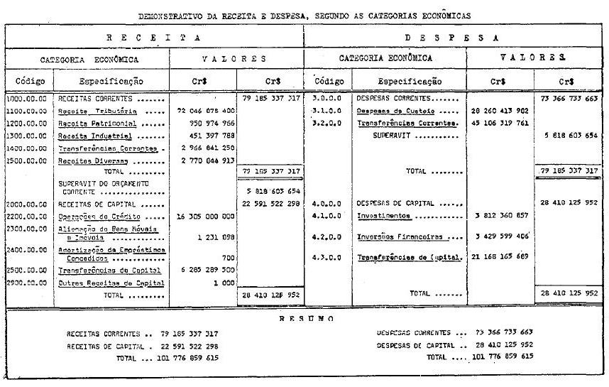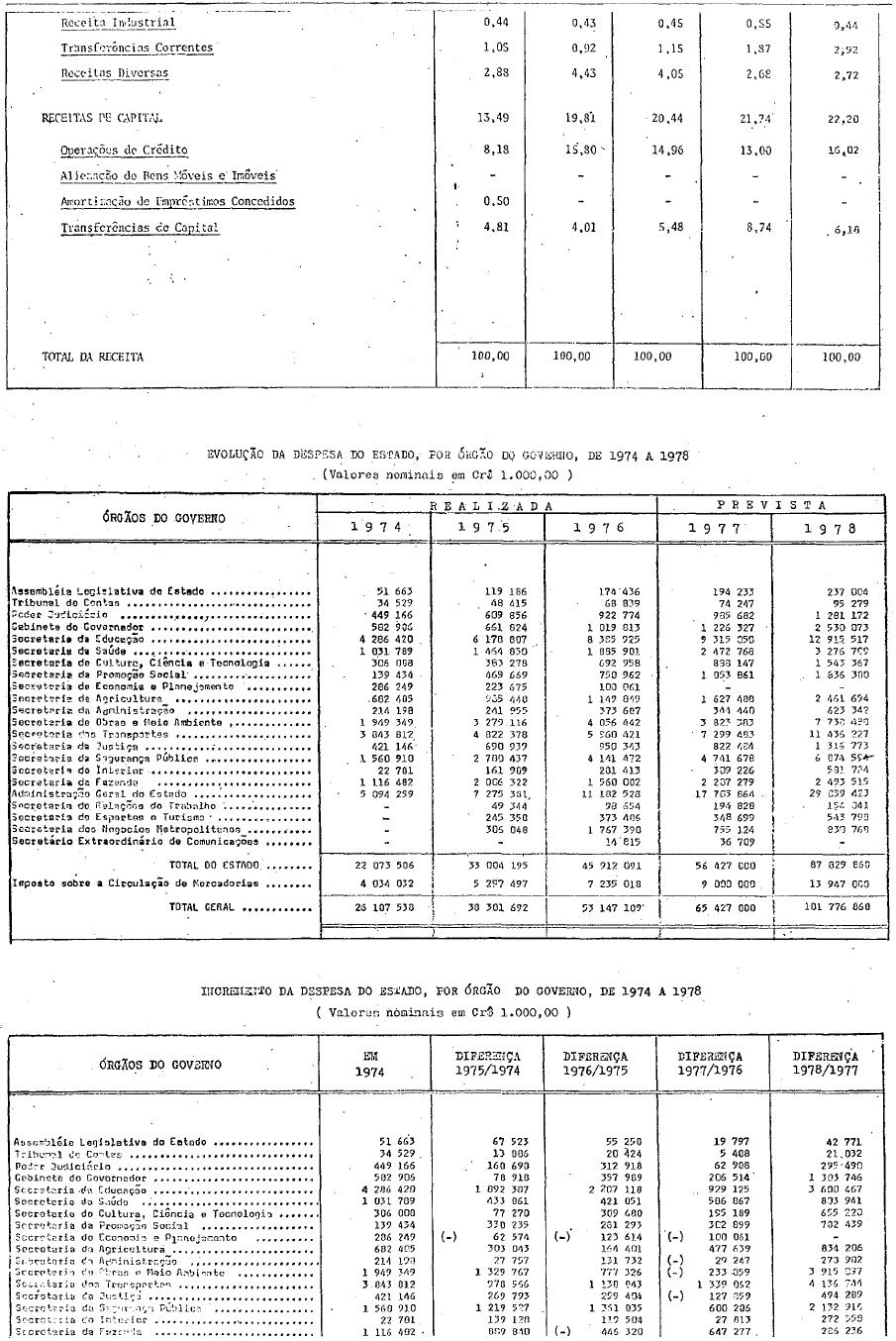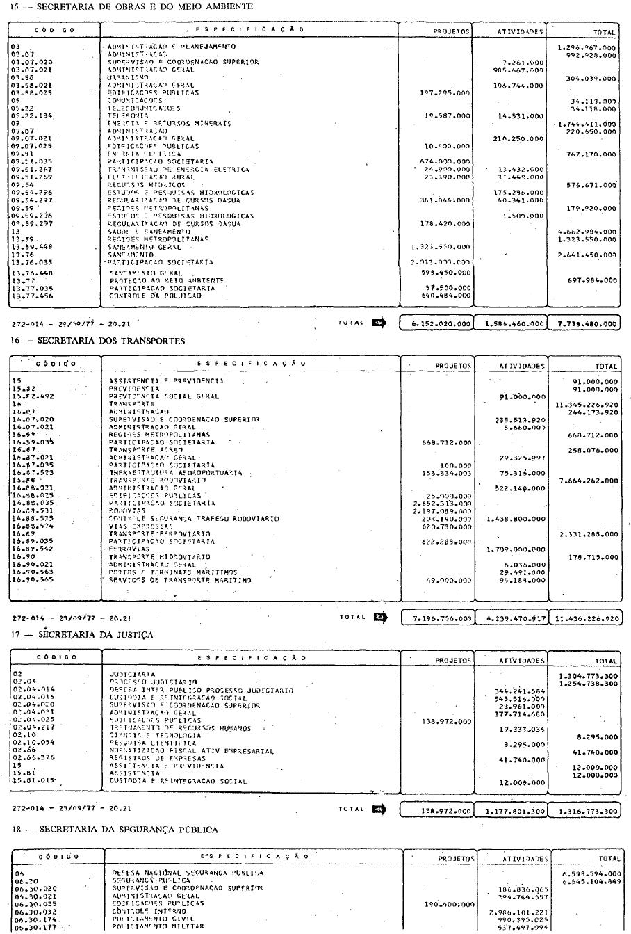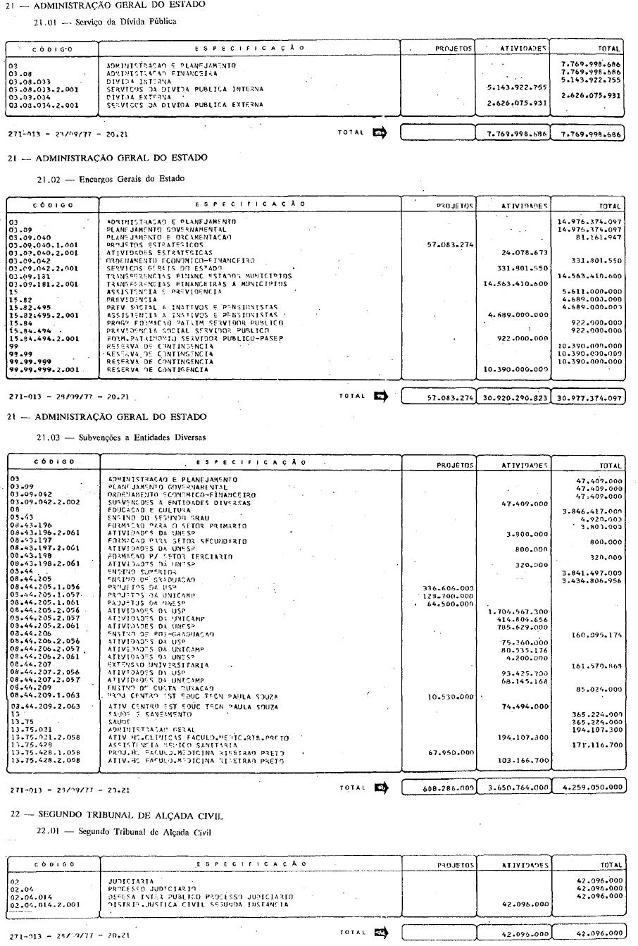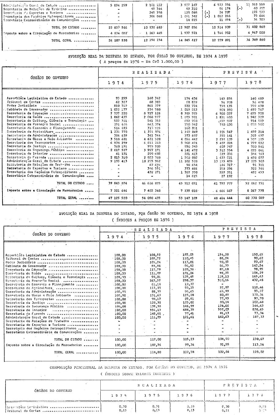 Artigo 1.º - O Orçamento-Programa do Estado para o exercício de 1978, discriminado nos quadros anexos desta lei, orça a Receita e fixa a Despesa em valores iguais a Cr$ 107.766.768.465,00 (cento e sete bilhões, setecentos e sessenta e seis milhões, setecentos e sessenta e oito mil e quatrocentos e sessenta e cinco cruzeiros).