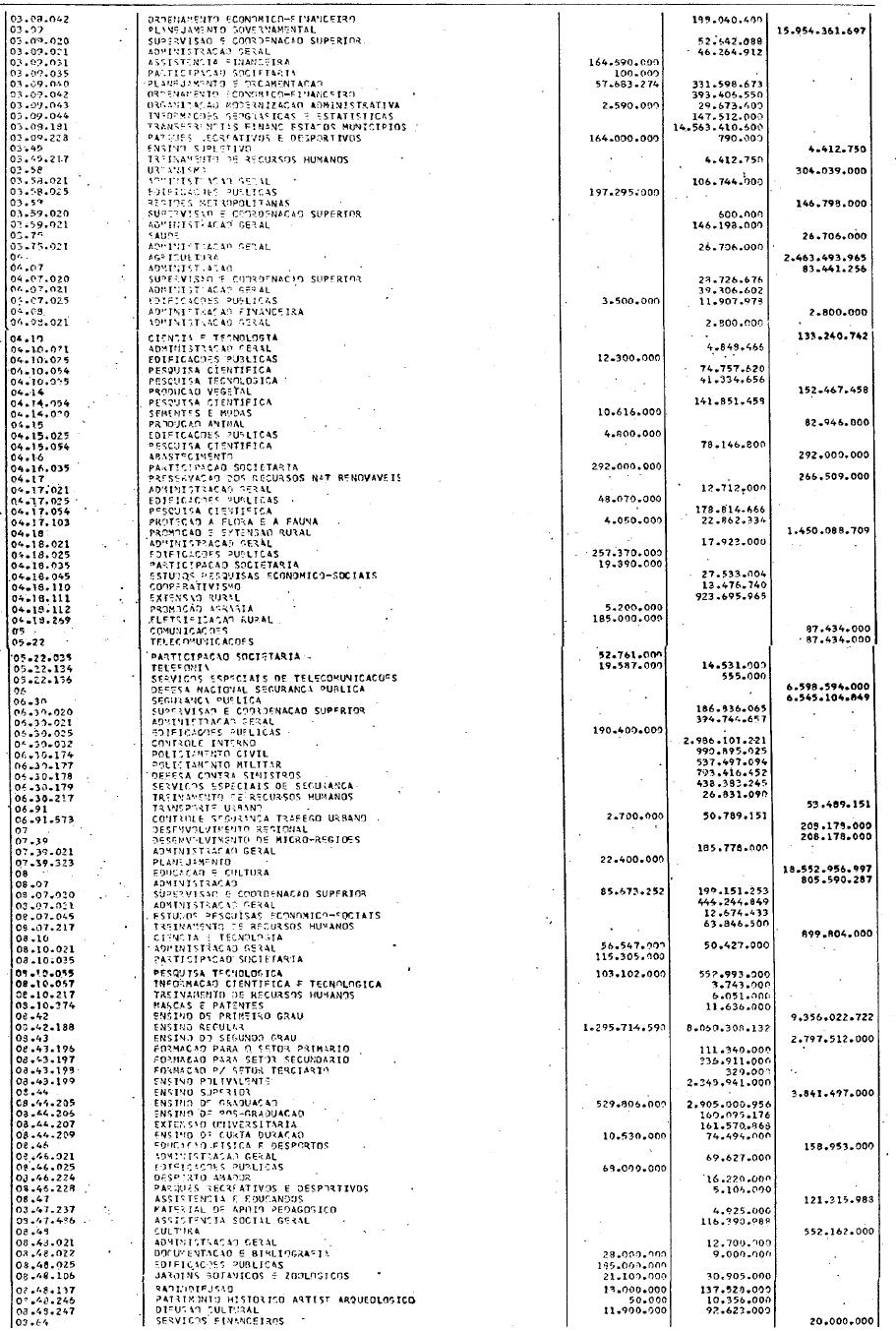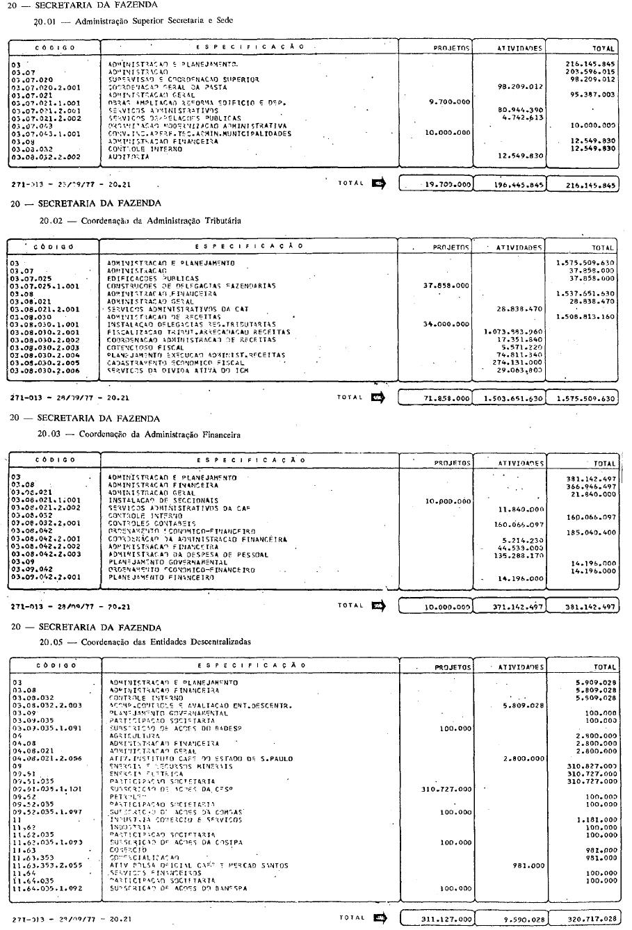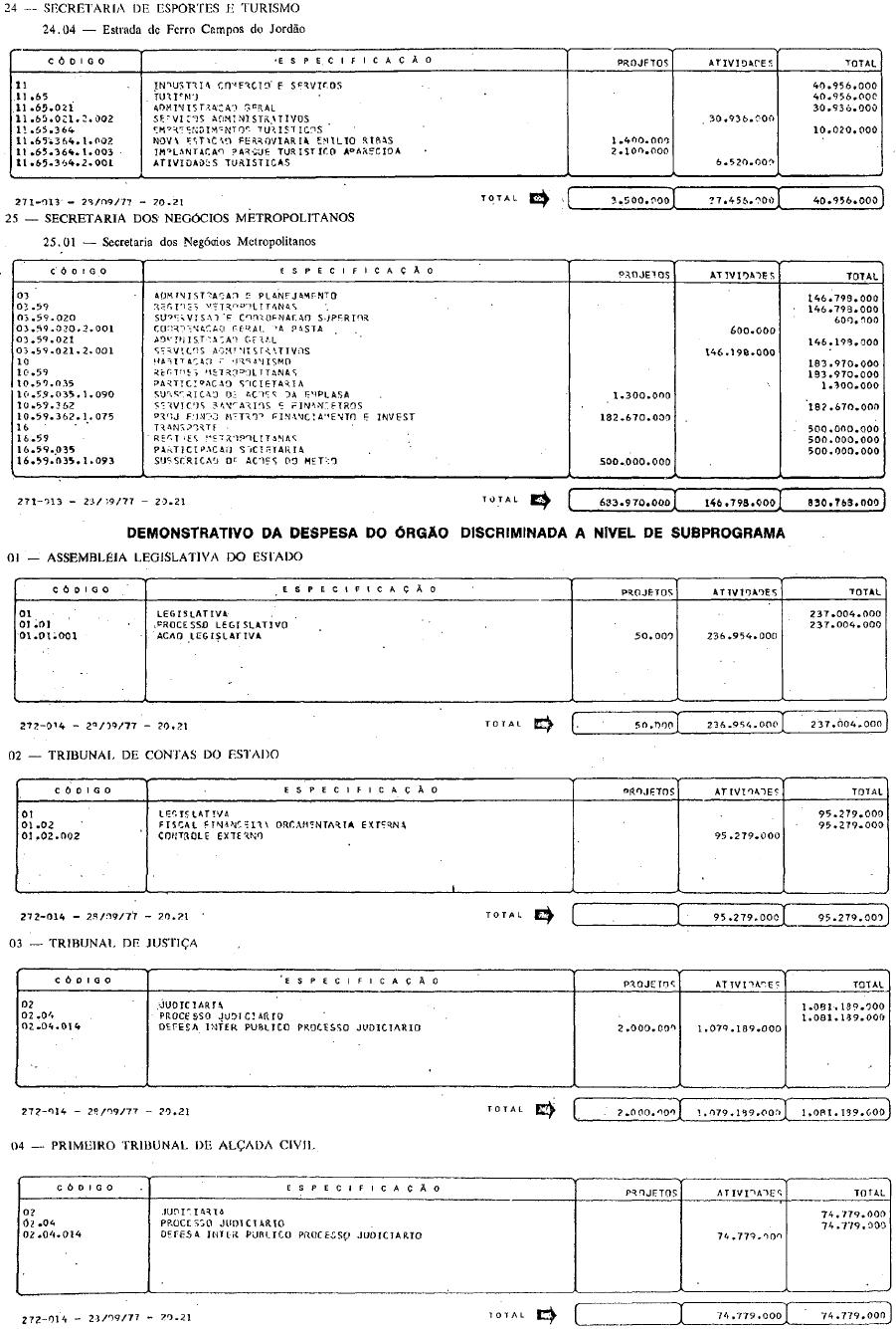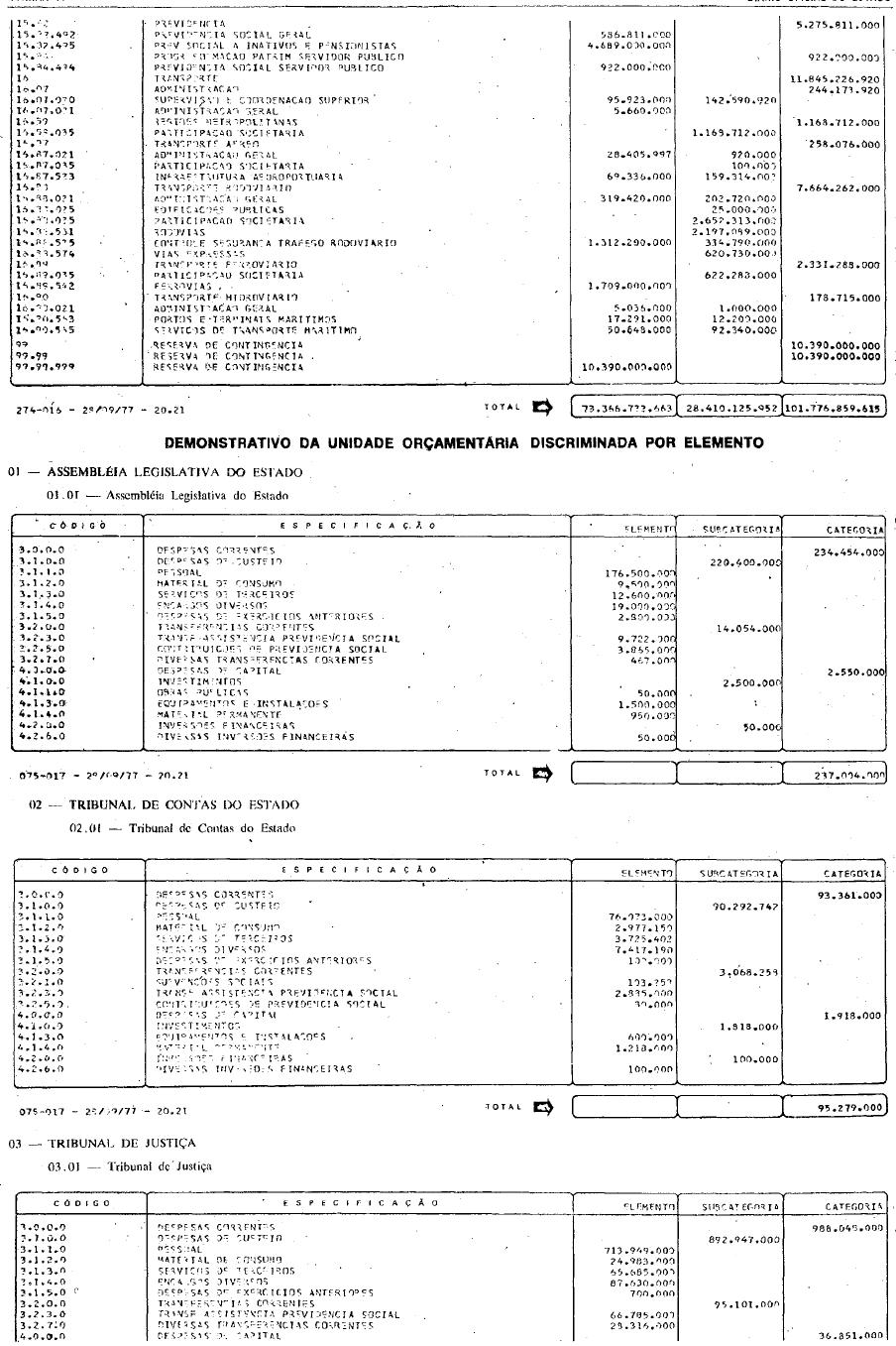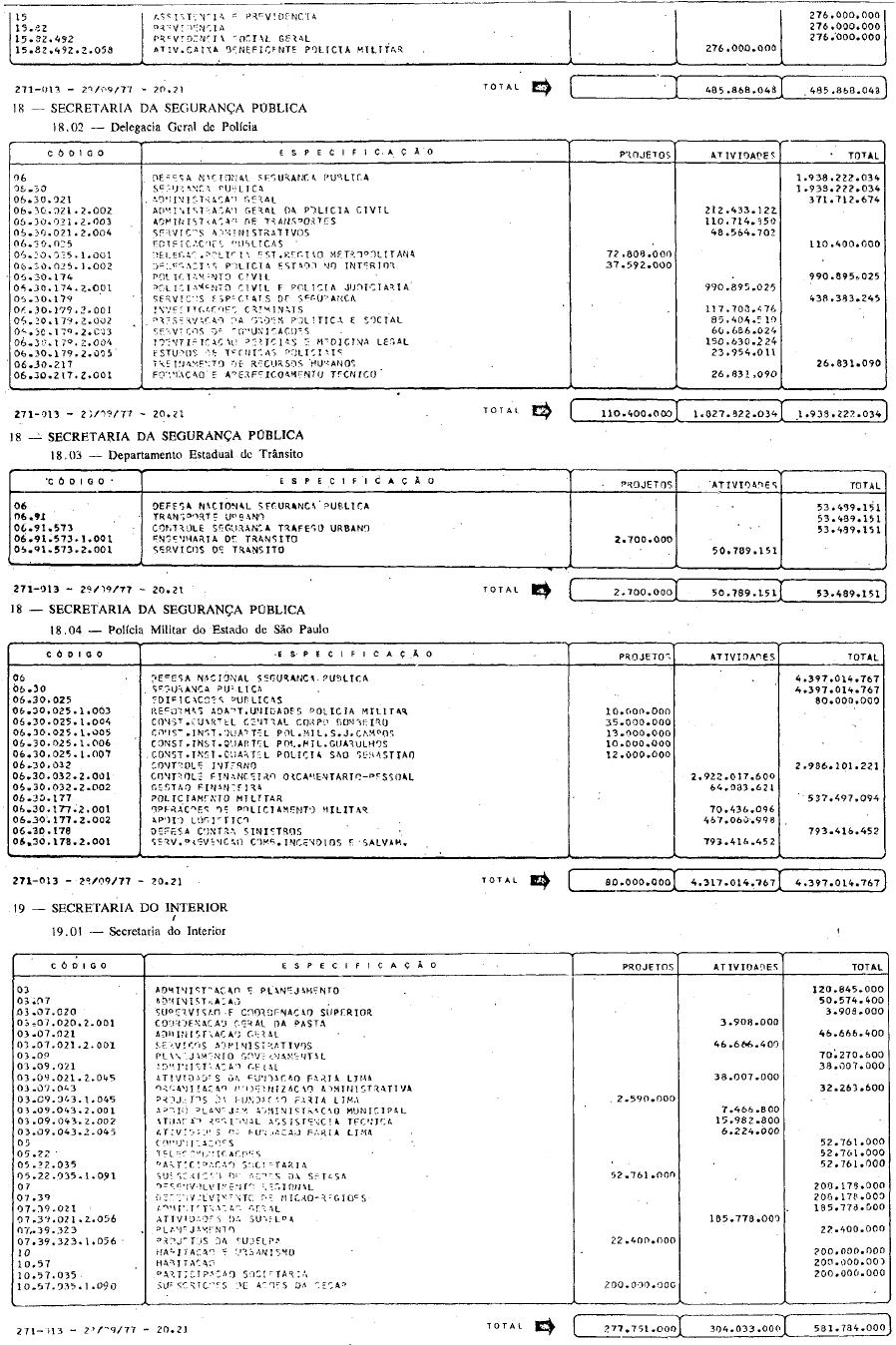 Artigo 1.º - O Orçamento-Programa do Estado para o exercício de 1978, discriminado nos quadros anexos desta lei, orça a Receita e fixa a Despesa em valores iguais a Cr$ 107.766.768.465,00 (cento e sete bilhões, setecentos e sessenta e seis milhões, setecentos e sessenta e oito mil e quatrocentos e sessenta e cinco cruzeiros).