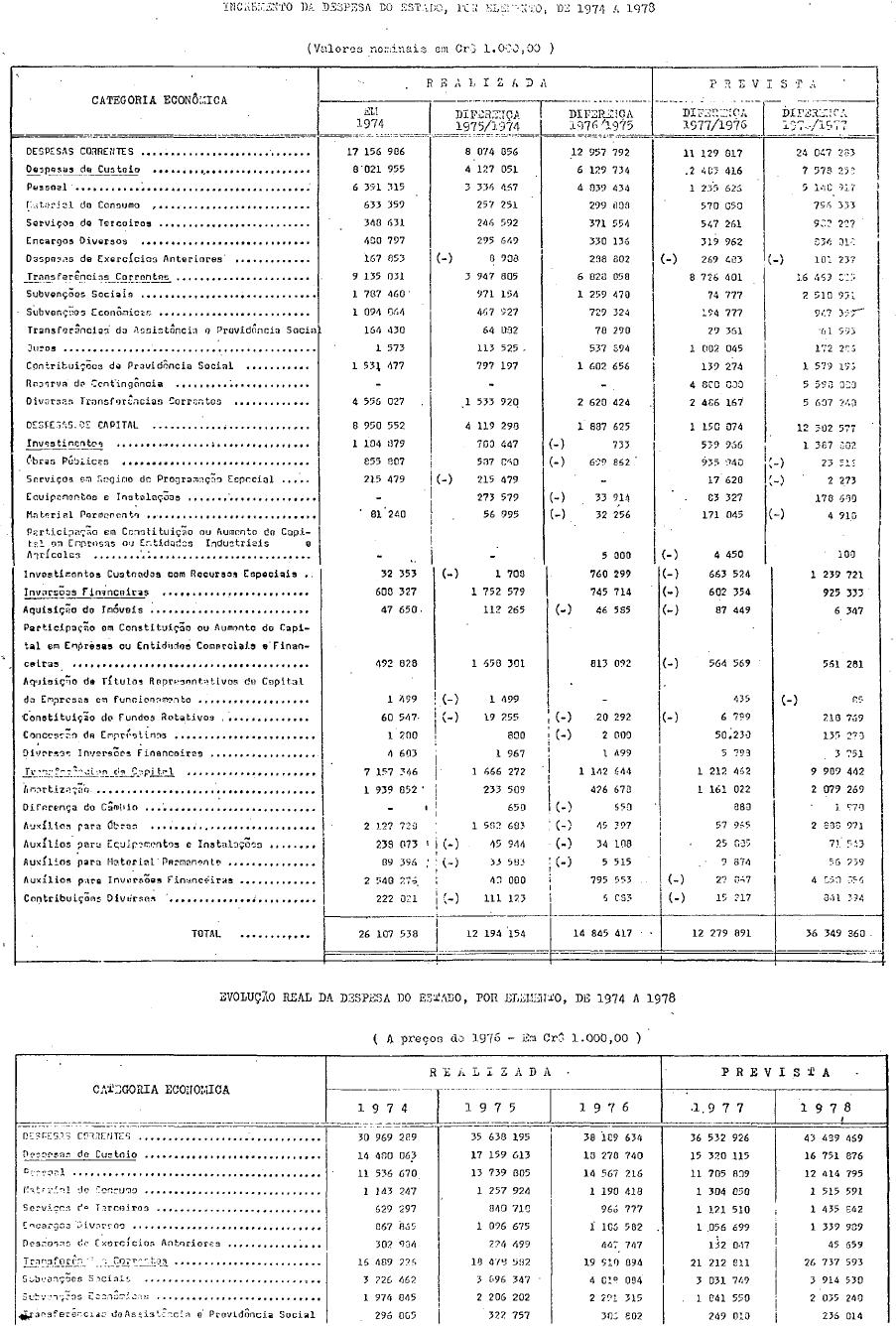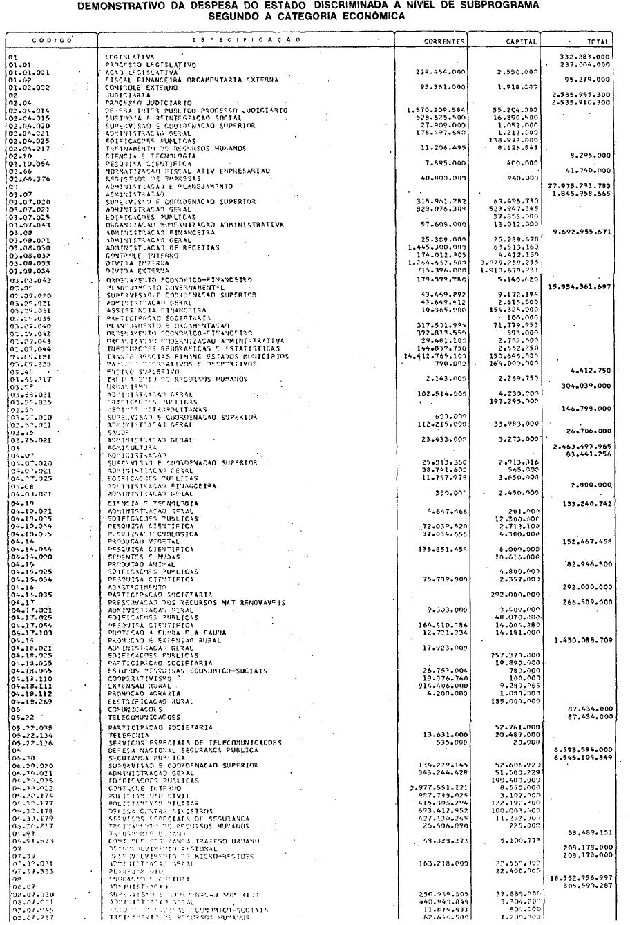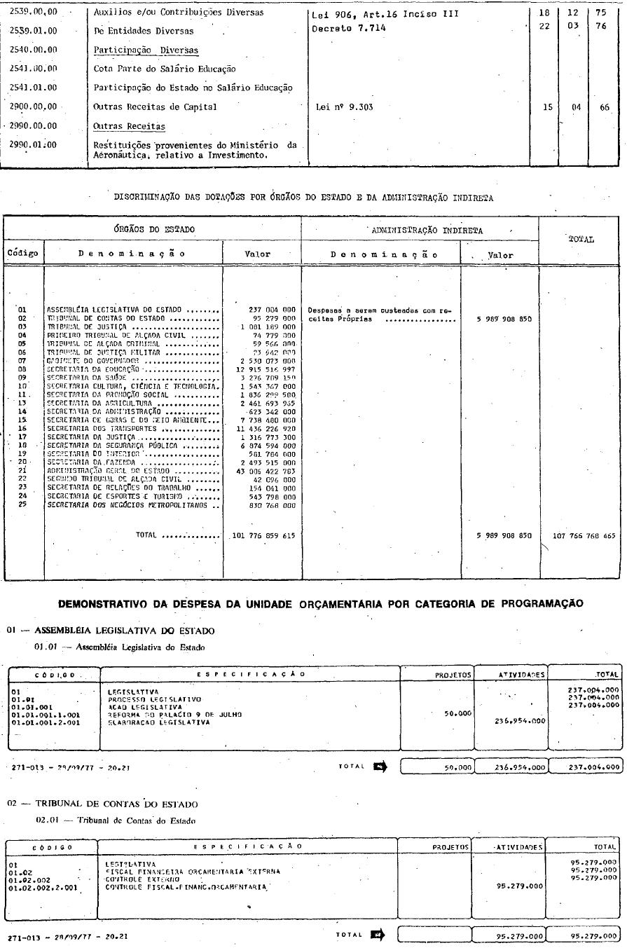 Artigo 1.º - O Orçamento-Programa do Estado para o exercício de 1978, discriminado nos quadros anexos desta lei, orça a Receita e fixa a Despesa em valores iguais a Cr$ 107.766.768.465,00 (cento e sete bilhões, setecentos e sessenta e seis milhões, setecentos e sessenta e oito mil e quatrocentos e sessenta e cinco cruzeiros).