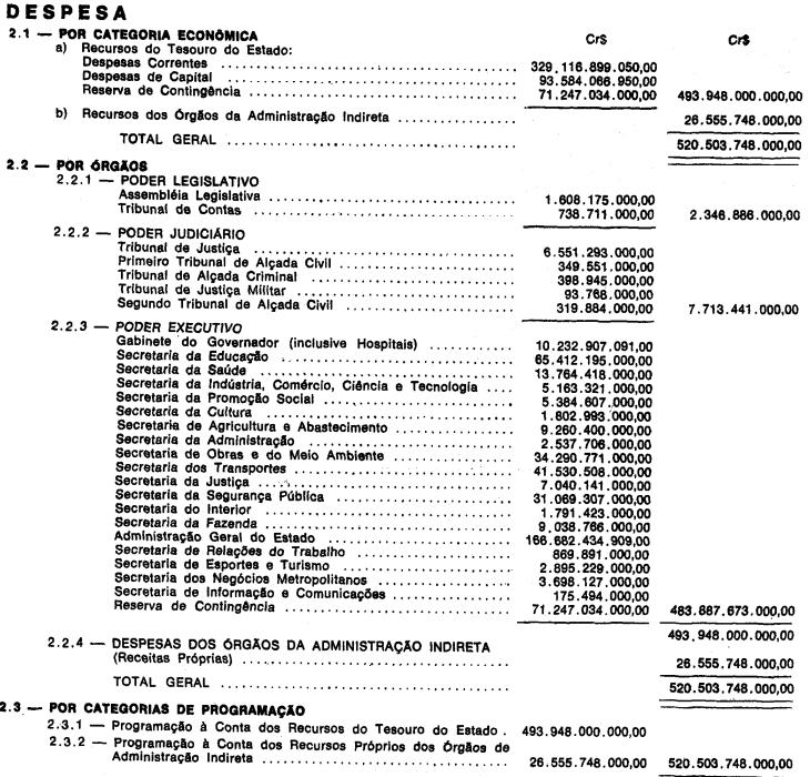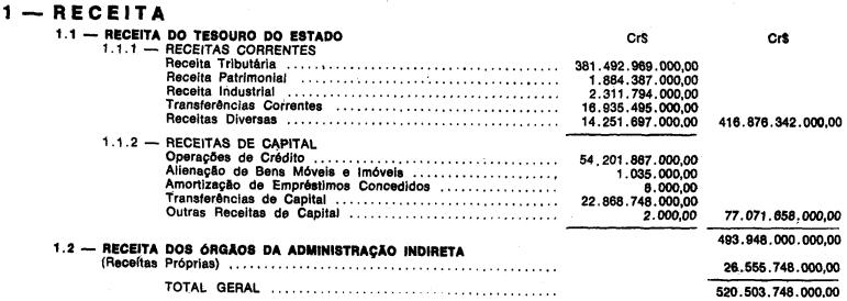 Artigo 1º - O Orçamento-Programa do Estado para o exercício de 1981, discriminado nos quadros de I a X, que integram esta lei e nos de XI a XXXII, que a acompanham, orça a Receita e fixa a Despesa em valores iguais a Cr$ 520.503.748.000,00 (quinhentos e vinte bilhões, quinhentos e três milhões, setecentos e quarenta e oito mil cruzeiros).