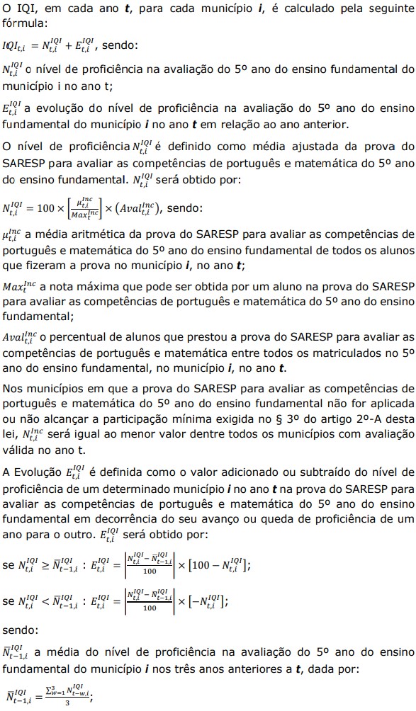 - Inciso I com redação dada pela Lei n° 17.348, de 12/03/2021, com efeitos para cálculo do índice de participação dos Municípios a partir do ano-base subsequente ao de sua publicação.