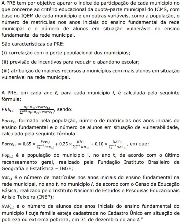 § 10 - A Participação no Rateio da Cota-Parte da Educação - PRE, referida no inciso X deste artigo, é o indicador composto pelo Índice de Qualidade da Educação Municipal - IQEM, a que se refere o artigo 2°-A desta lei, pela população do município, pelo nível socioeconômico dos educandos e pelo número de matrículas da rede municipal, conforme metodologia e fórmula de cálculo previstas no Anexo Único desta lei. (NR)