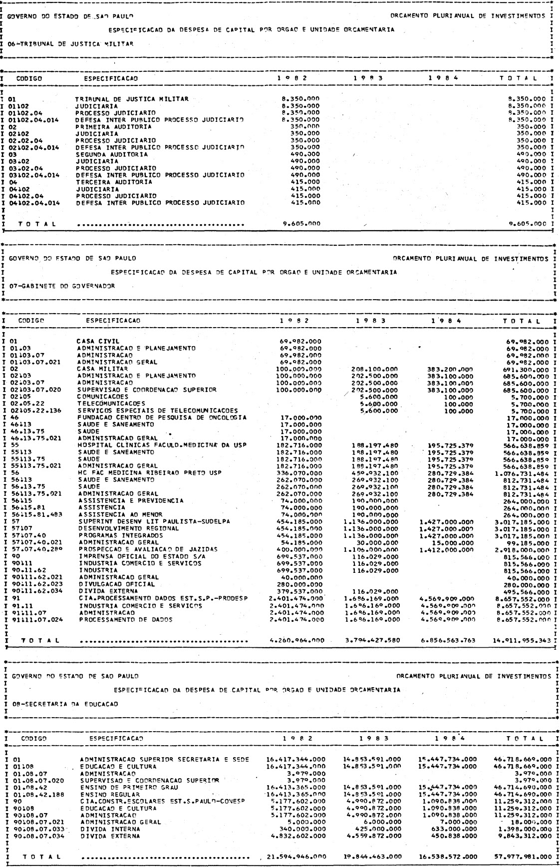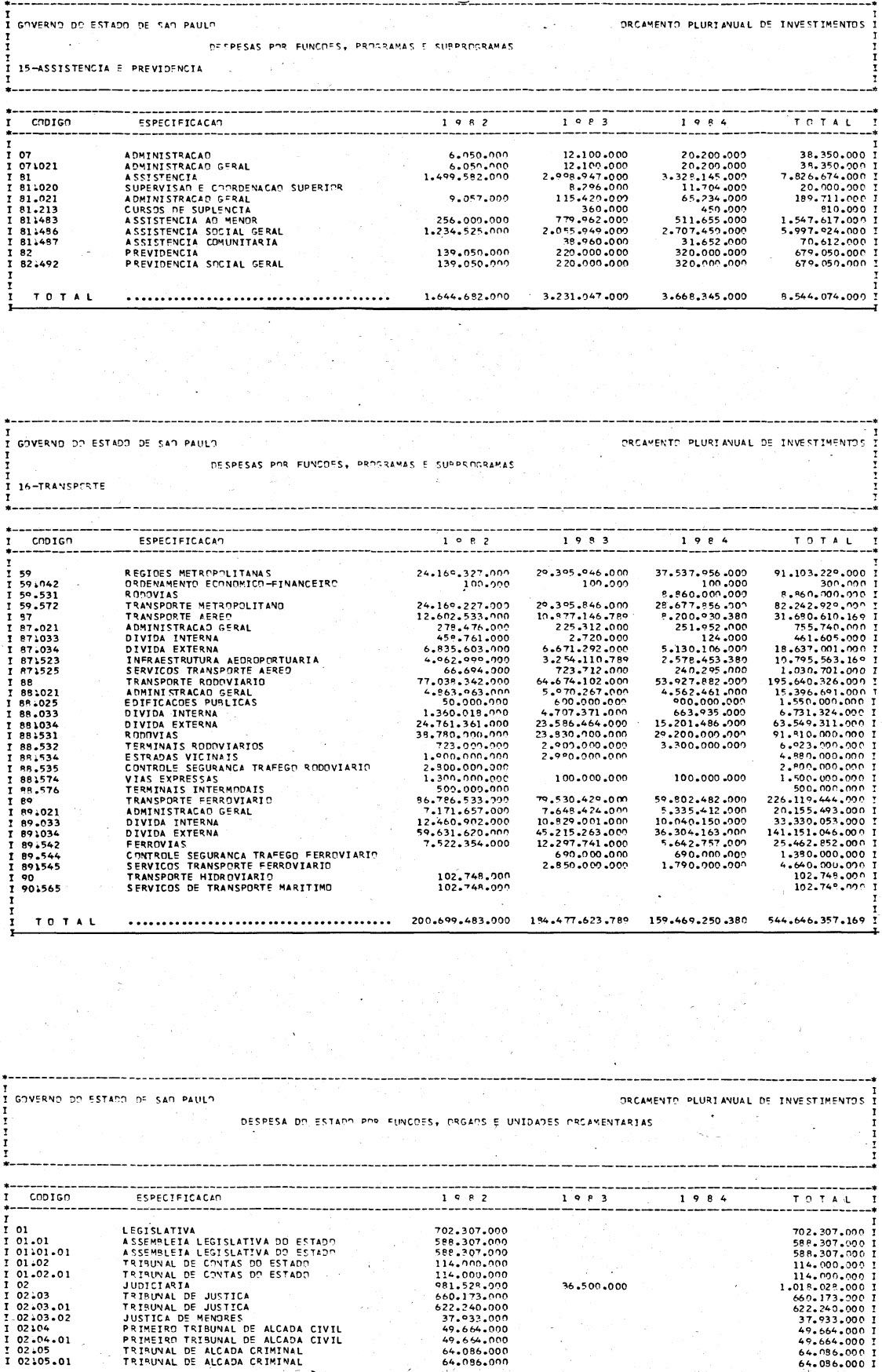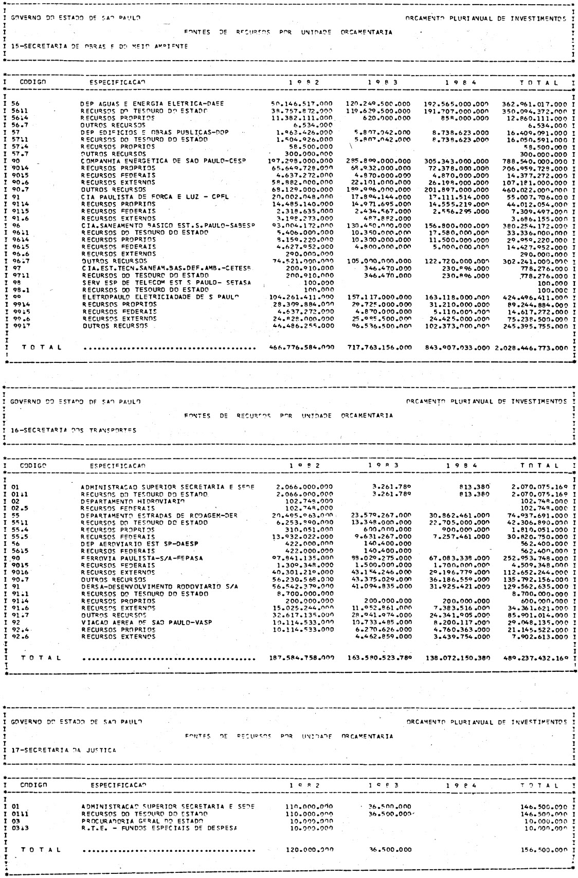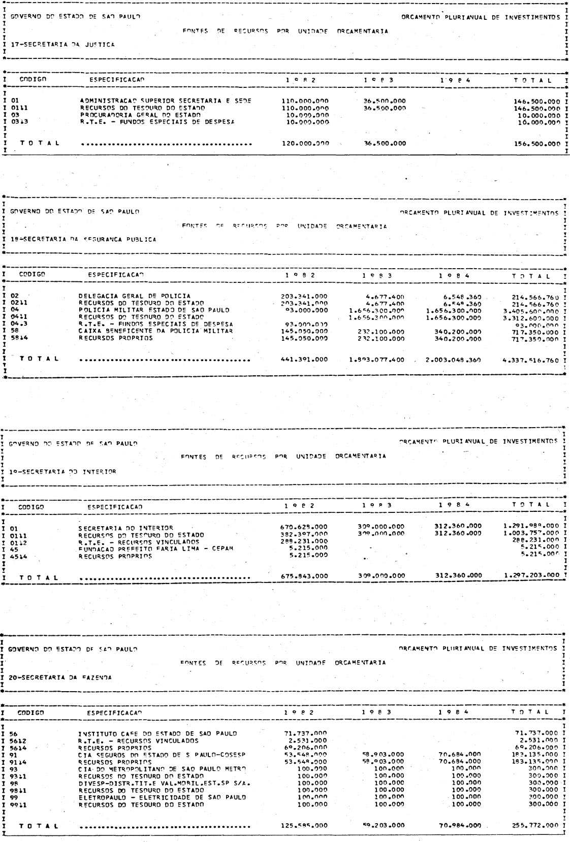 Artigo 1º - Os recursos do Orçamento Plurianual de Investimentos, para o triênio de 1982 a 1984, são estimados em CrS 3.084.601.771.347,00 (três trilhões, oitenta e quatro bilhões. seiscentos e um milhões, setecentos e setenta e um mil e trezentos e quarenta e sete cruzeiros) e, em igual montante, no mesmo período, os dispêndios.