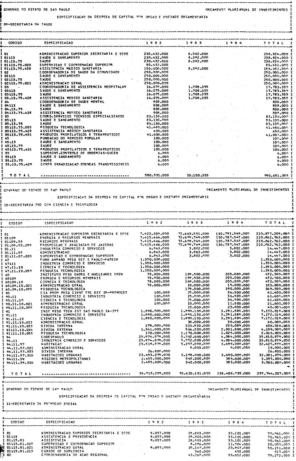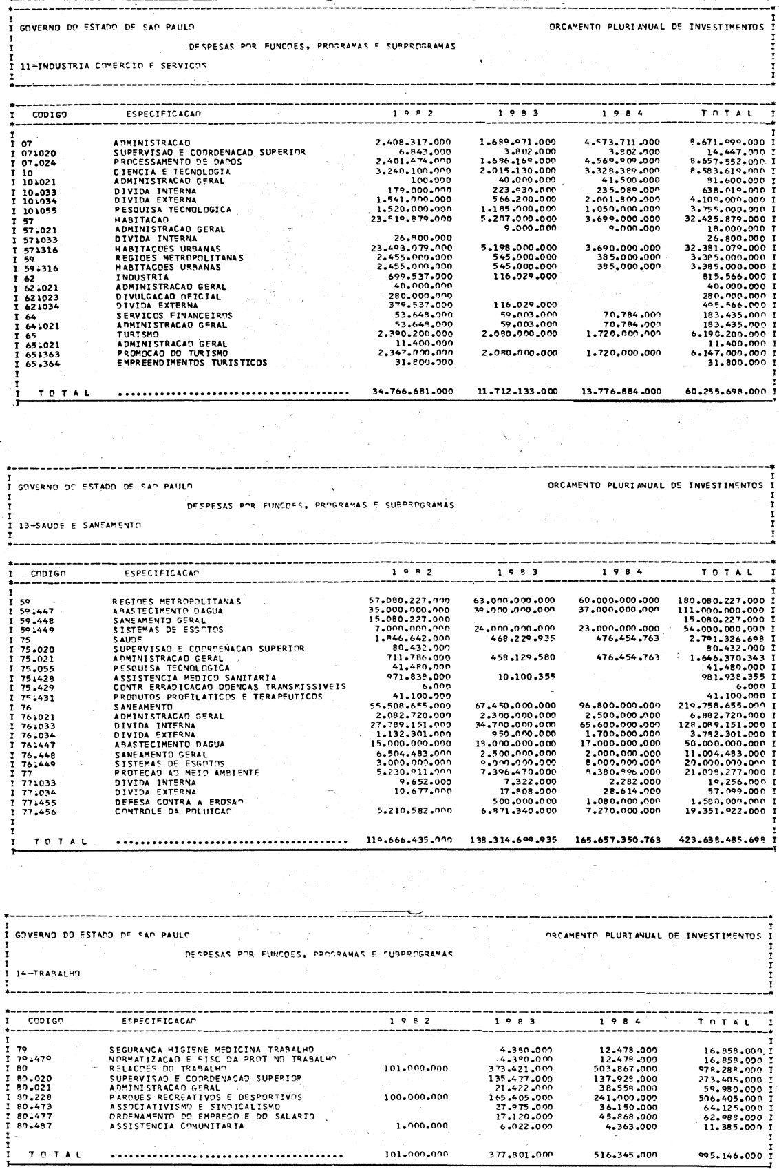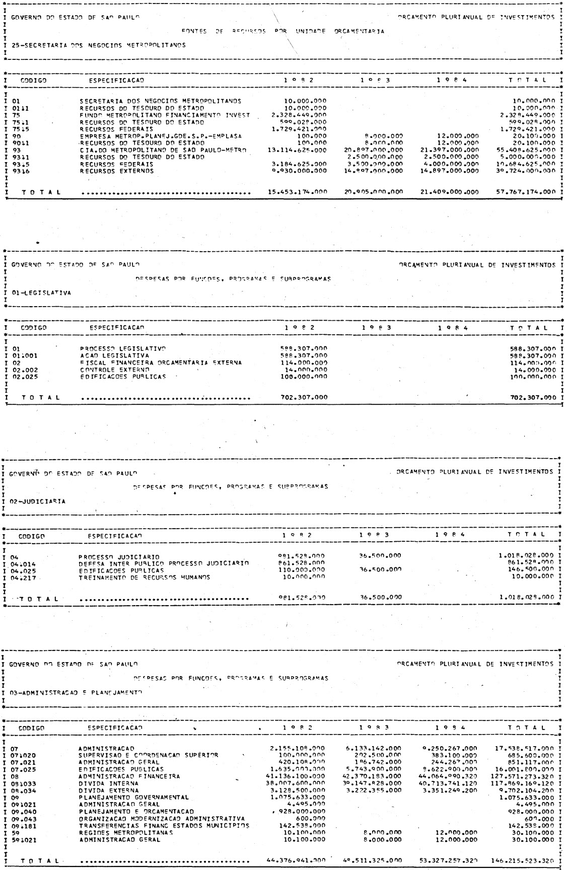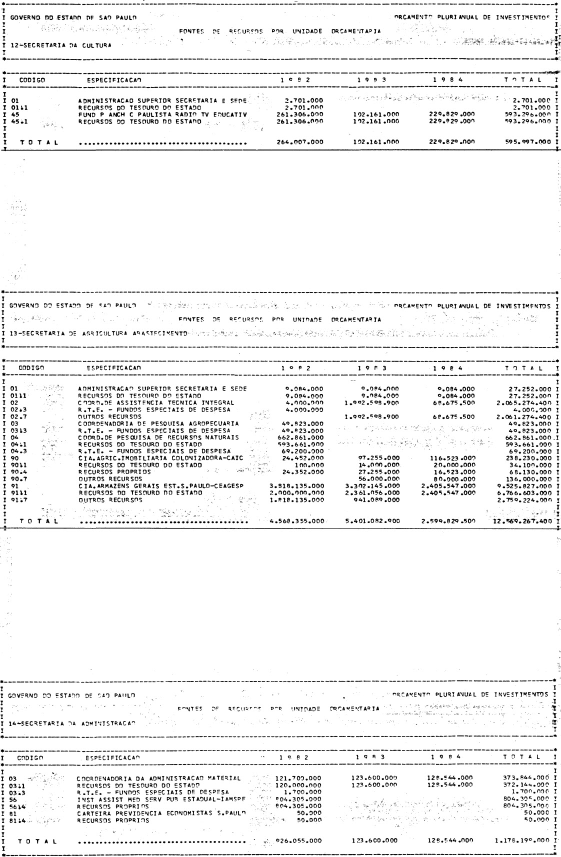 Artigo 1º - Os recursos do Orçamento Plurianual de Investimentos, para o triênio de 1982 a 1984, são estimados em CrS 3.084.601.771.347,00 (três trilhões, oitenta e quatro bilhões. seiscentos e um milhões, setecentos e setenta e um mil e trezentos e quarenta e sete cruzeiros) e, em igual montante, no mesmo período, os dispêndios.