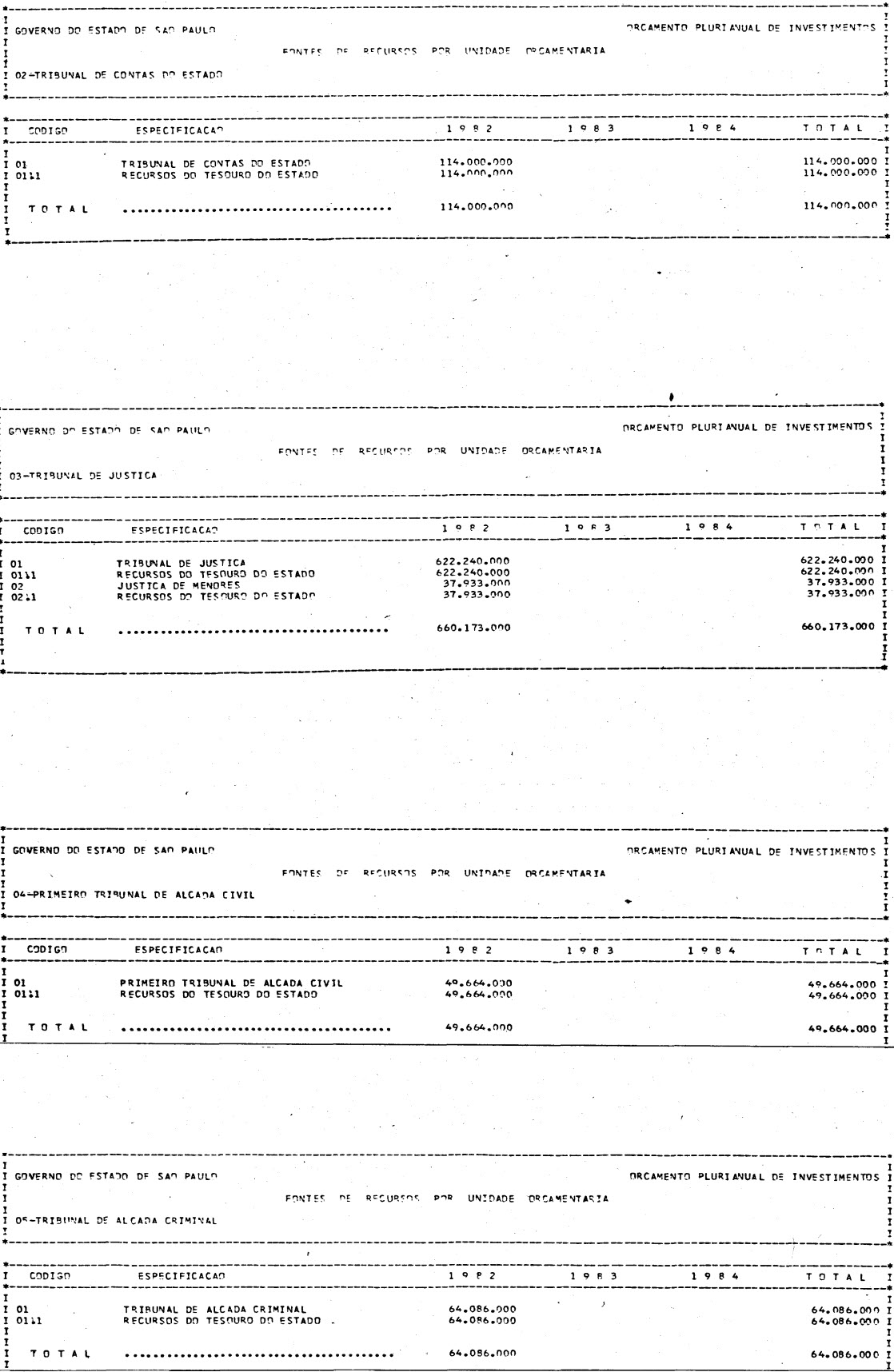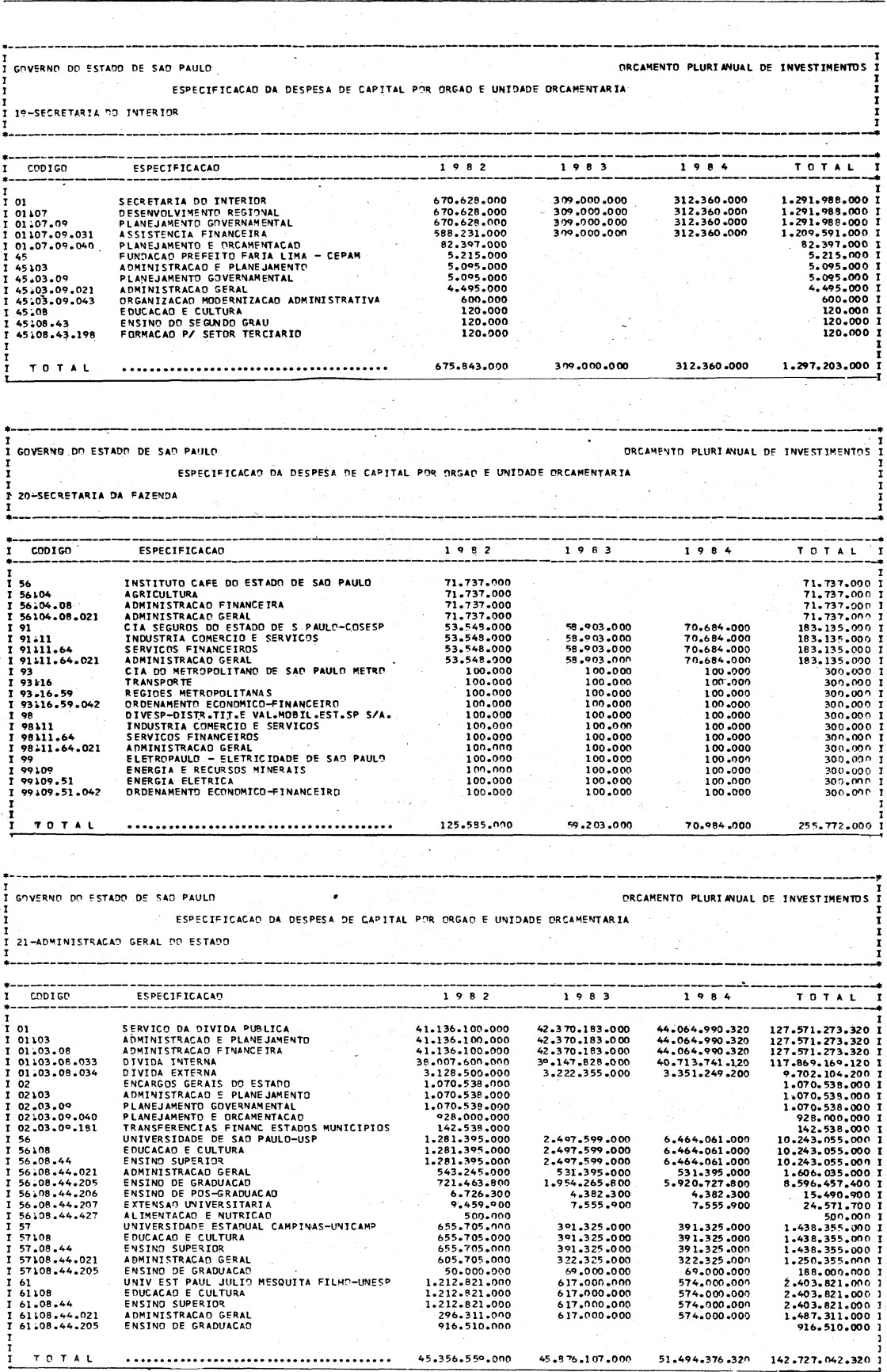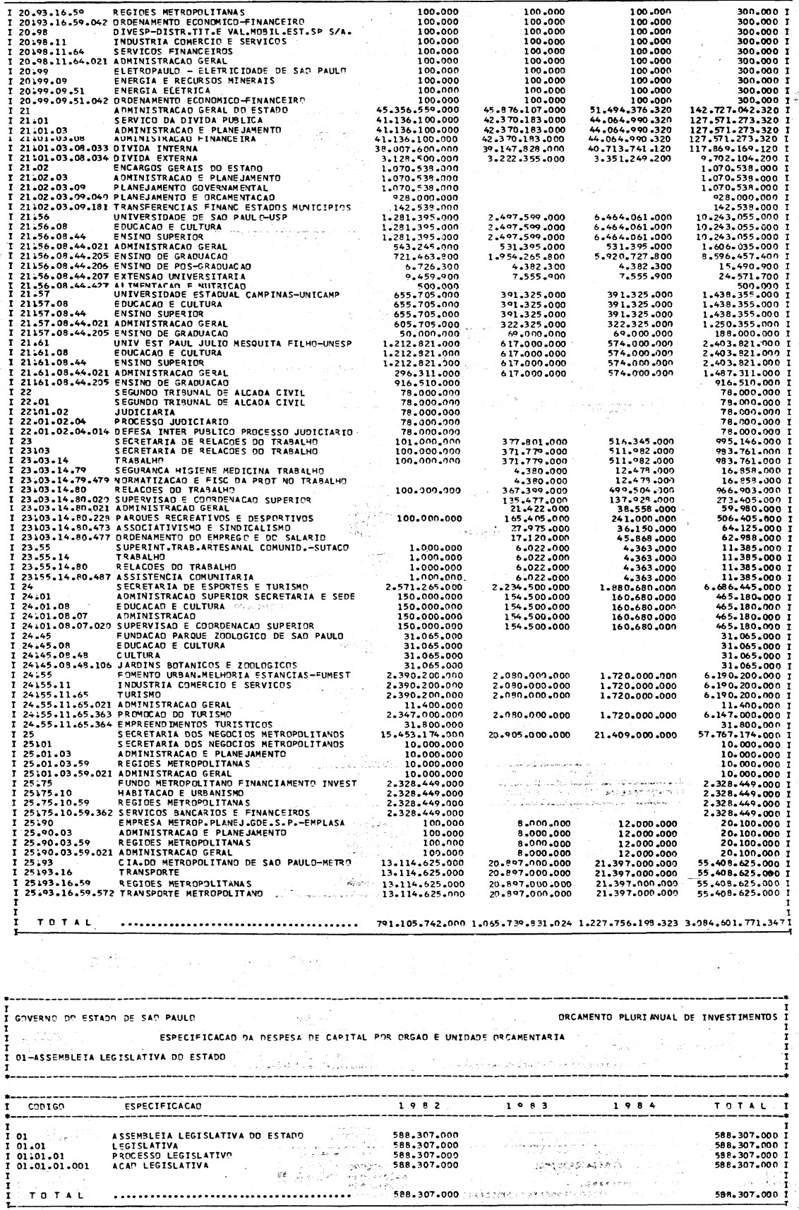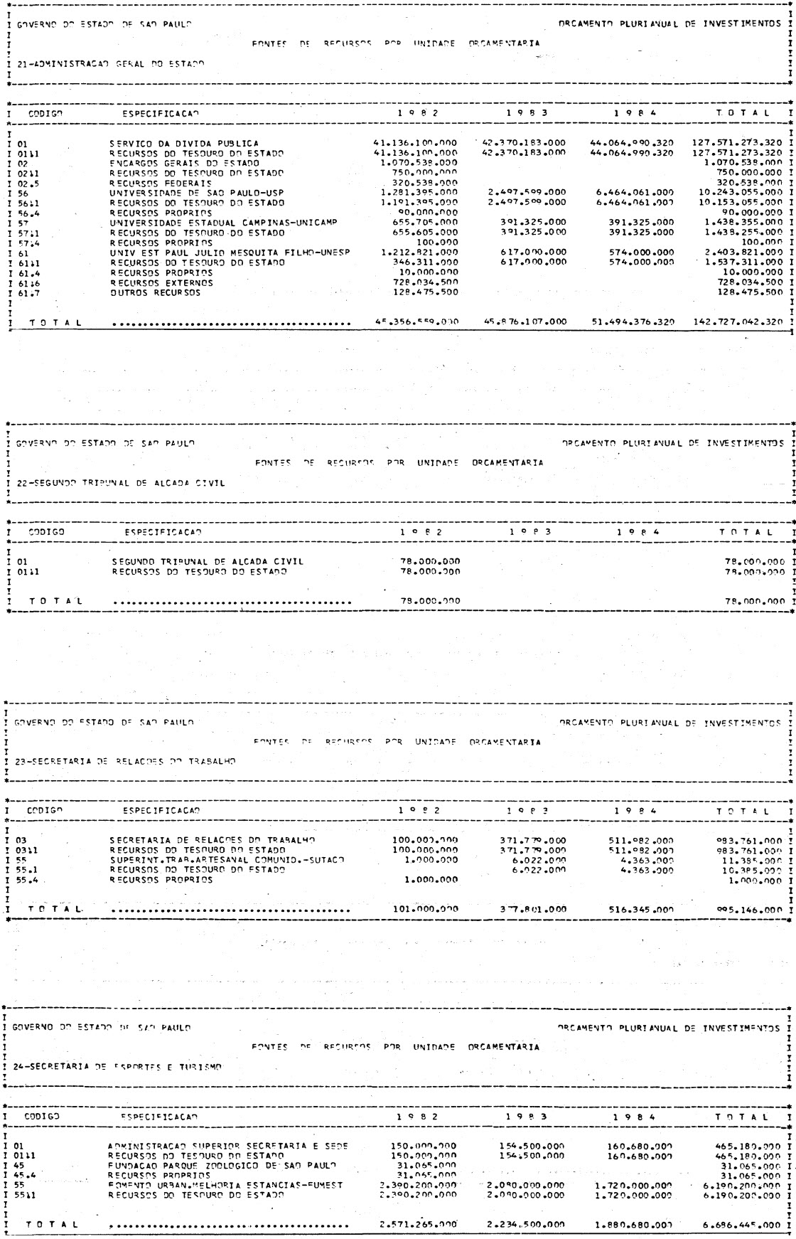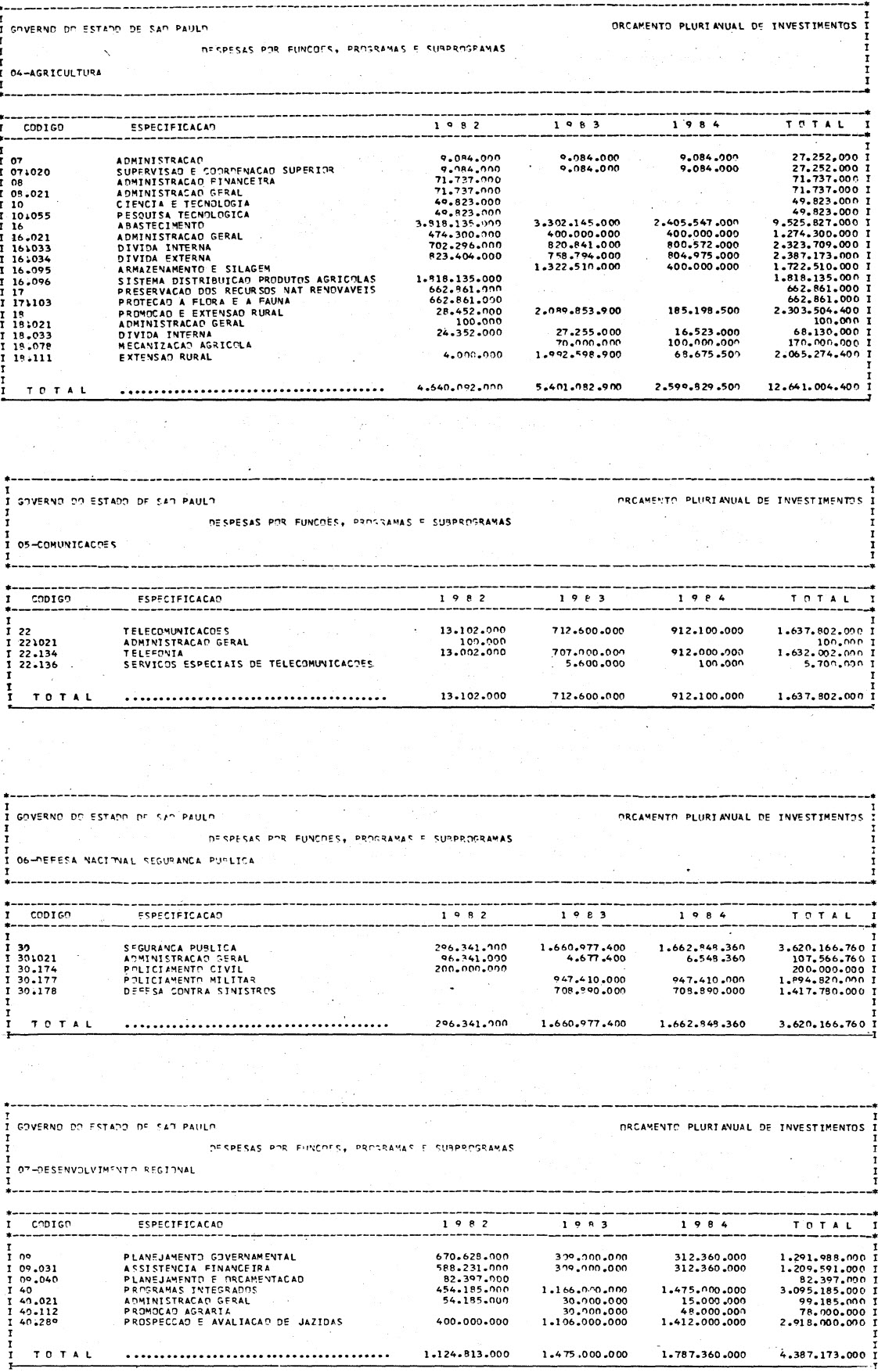 Artigo 1º - Os recursos do Orçamento Plurianual de Investimentos, para o triênio de 1982 a 1984, são estimados em CrS 3.084.601.771.347,00 (três trilhões, oitenta e quatro bilhões. seiscentos e um milhões, setecentos e setenta e um mil e trezentos e quarenta e sete cruzeiros) e, em igual montante, no mesmo período, os dispêndios.