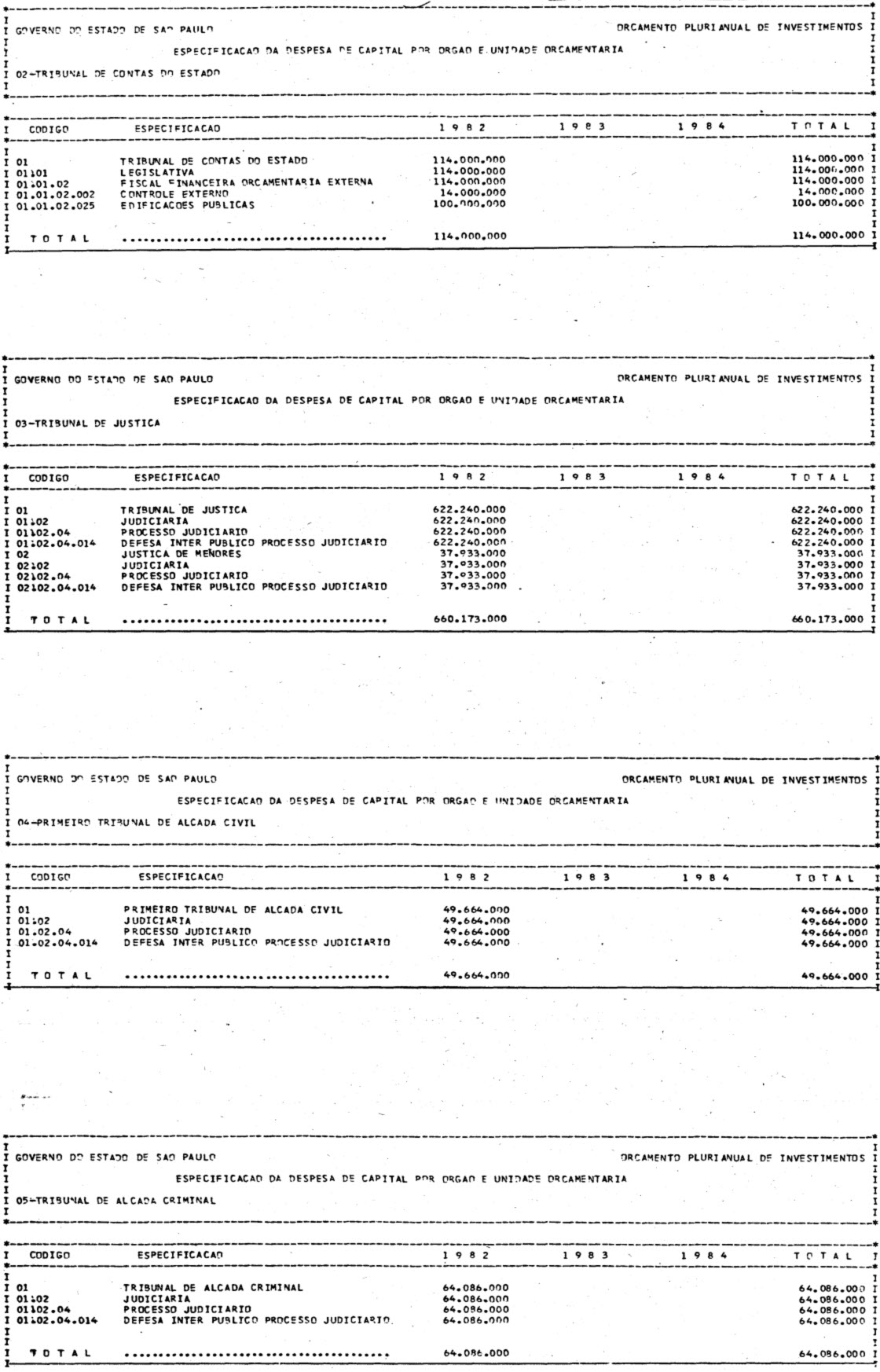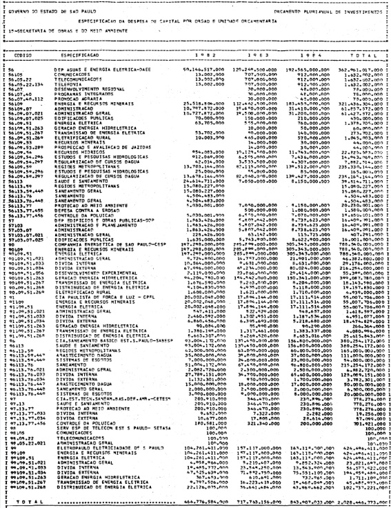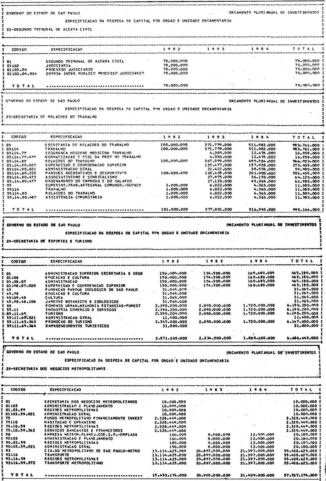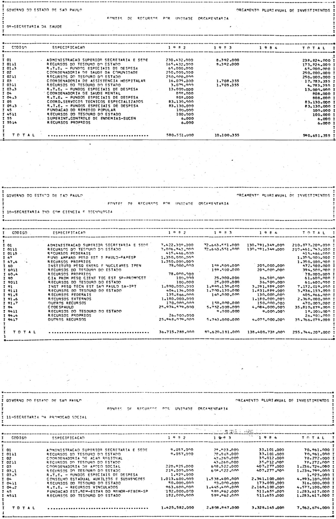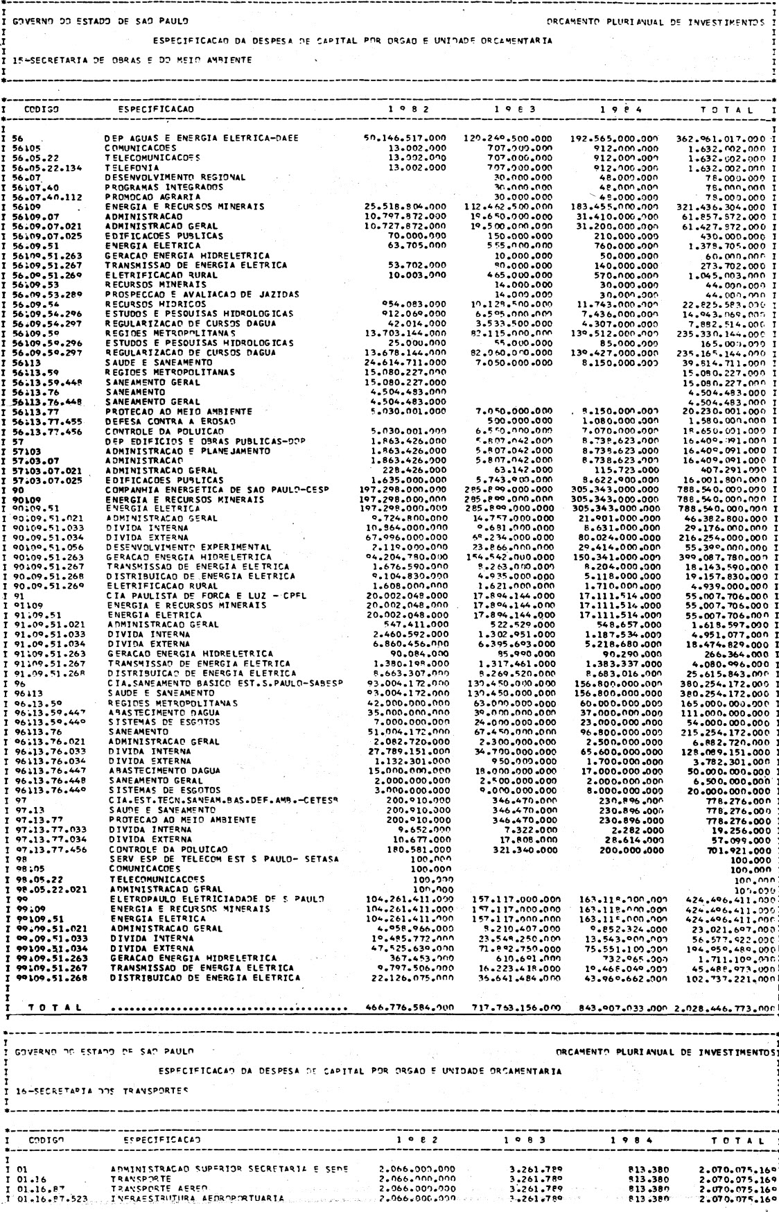 Artigo 1º - Os recursos do Orçamento Plurianual de Investimentos, para o triênio de 1982 a 1984, são estimados em CrS 3.084.601.771.347,00 (três trilhões, oitenta e quatro bilhões. seiscentos e um milhões, setecentos e setenta e um mil e trezentos e quarenta e sete cruzeiros) e, em igual montante, no mesmo período, os dispêndios.