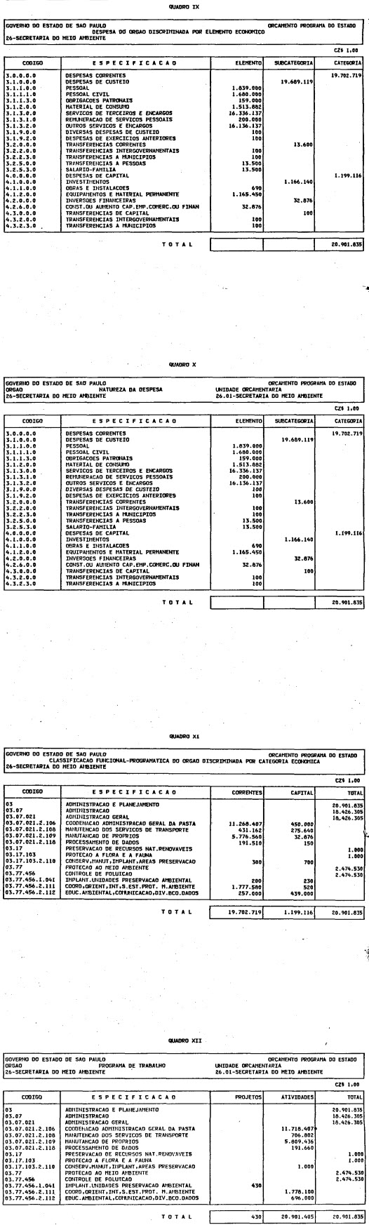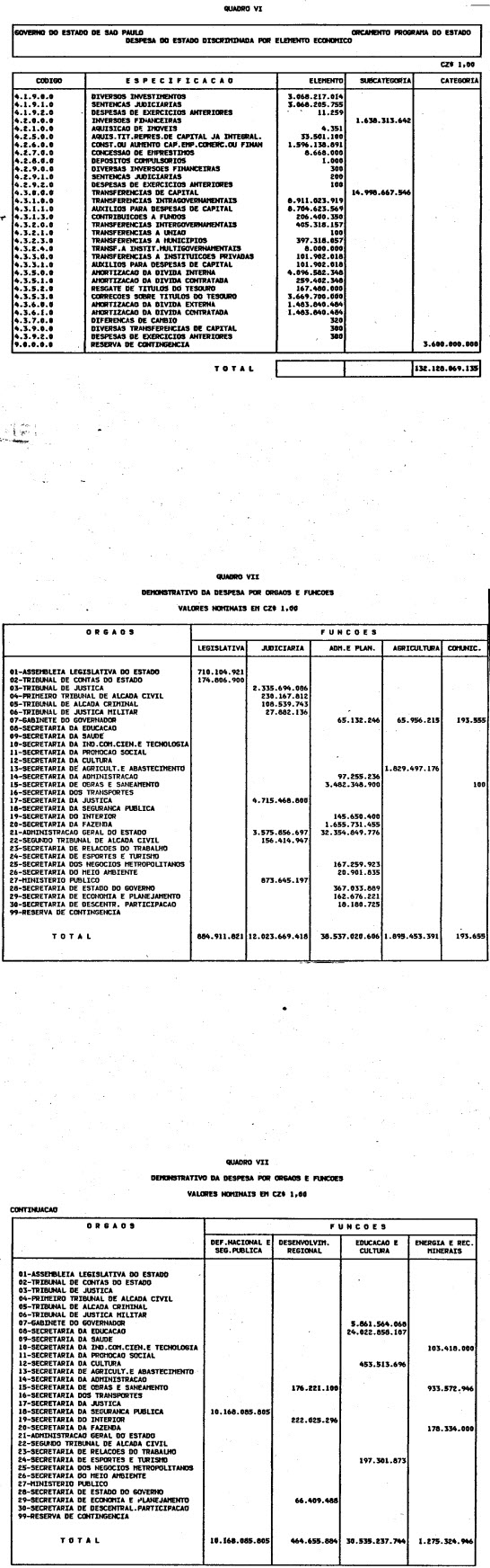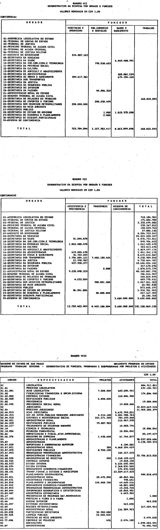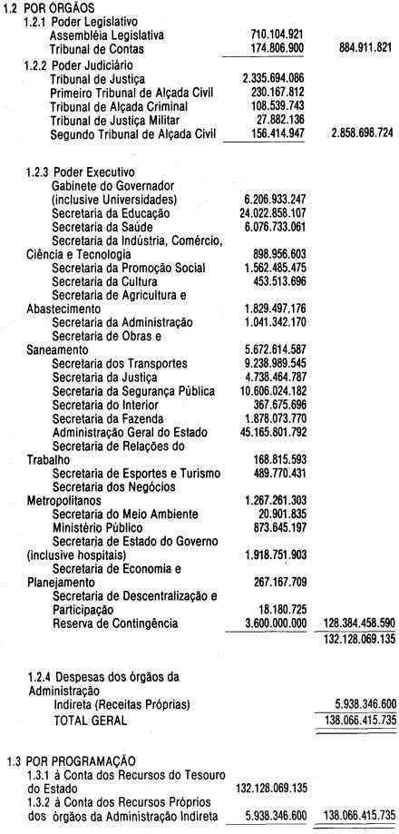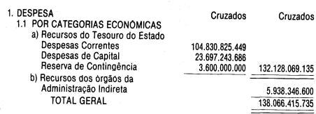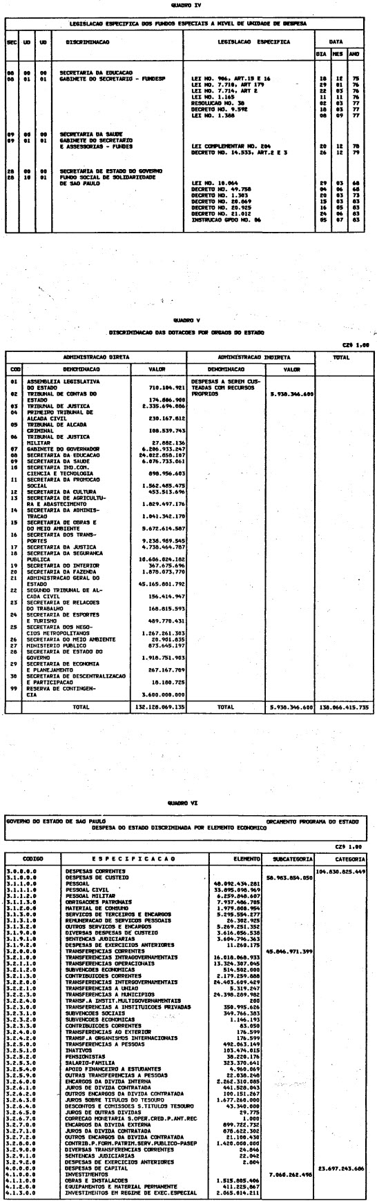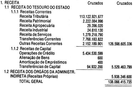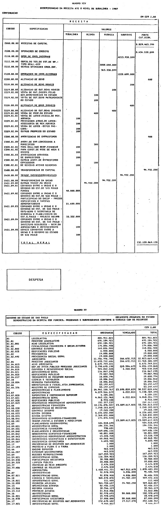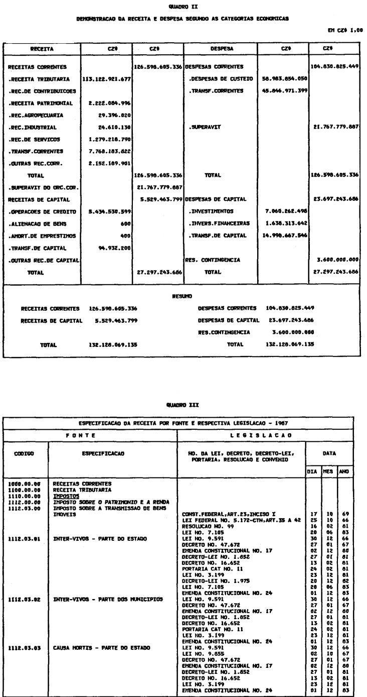 Artigo 1º - O Orçamento-Programa do Estado, para o exercício de 1987, discriminado nas tabelas explicativas que compreendem os quadros I a XII que integram esta lei e os de XIII a XXVII que a acompanham, orça a Receita e fixa a Despesa em valores iguais a Cz$ 138.066.415.735 (cento e trinta e oito bilhões, sessenta e seis milhões, quatrocentos e quinze mil, setecentos e trinta e cinco cruzados).