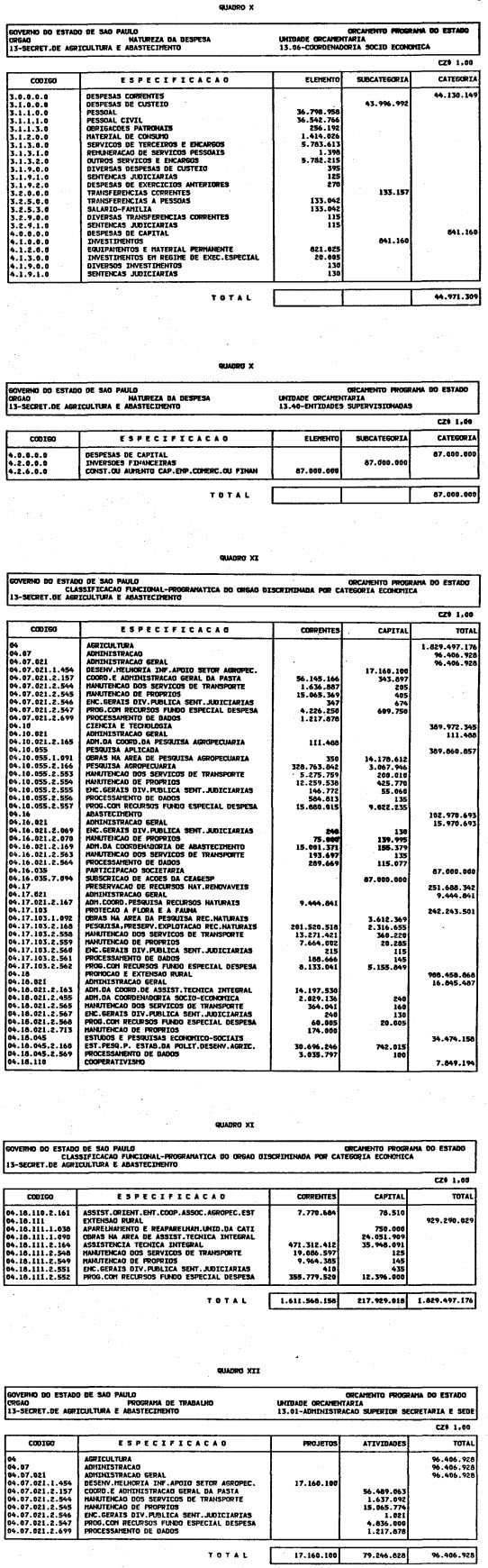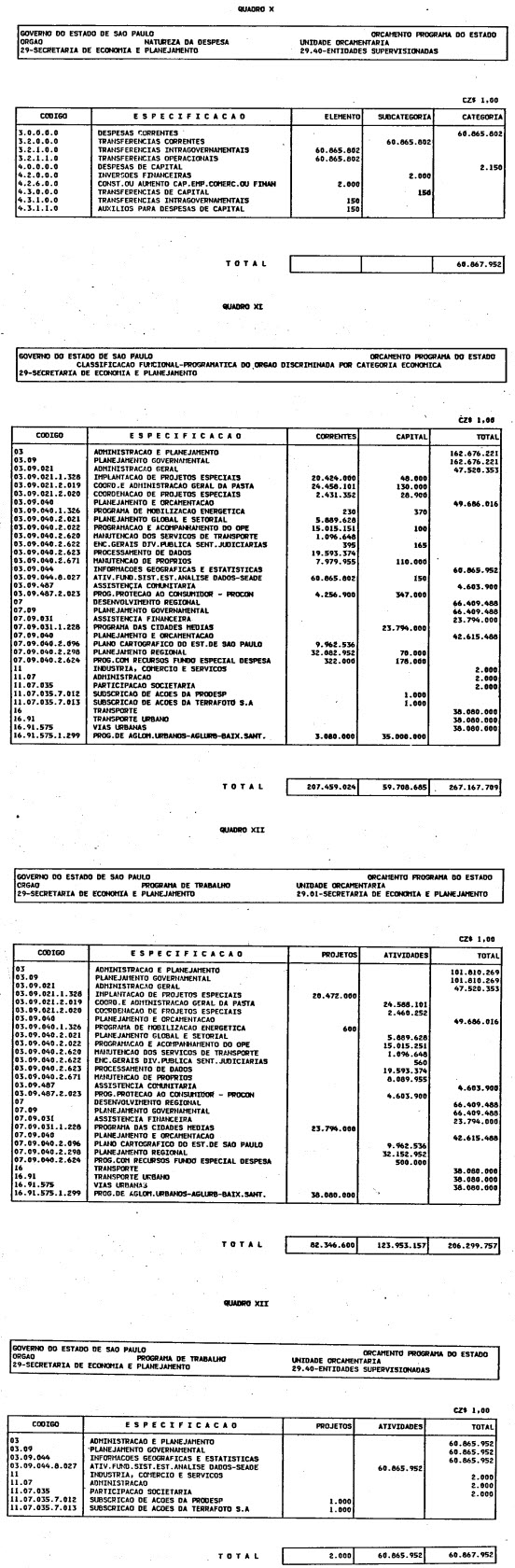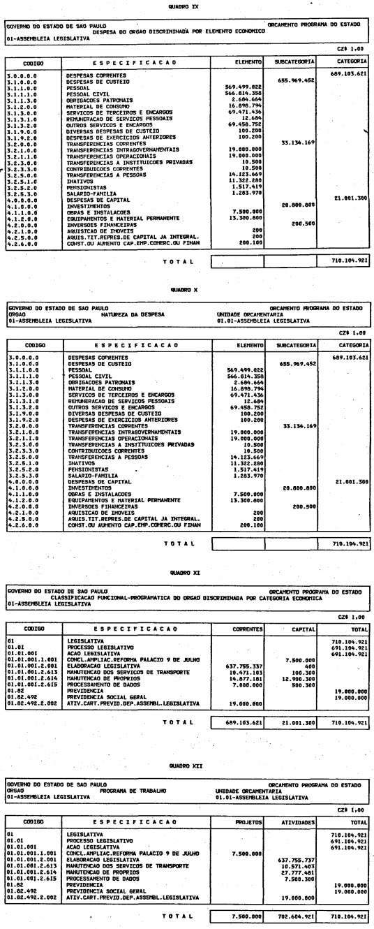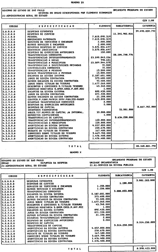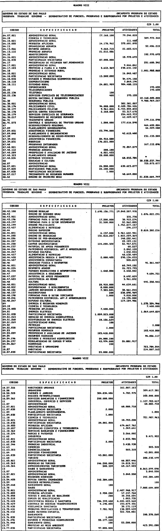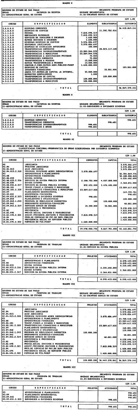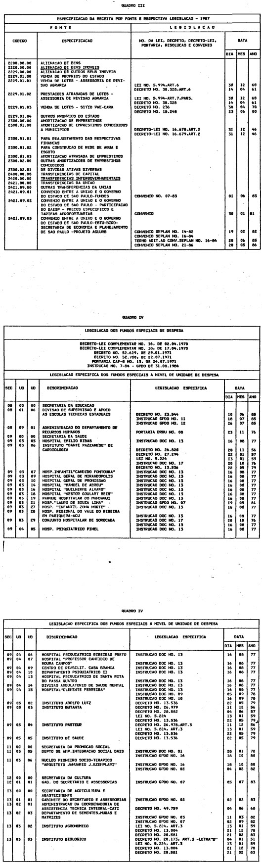 Artigo 1º - O Orçamento-Programa do Estado, para o exercício de 1987, discriminado nas tabelas explicativas que compreendem os quadros I a XII que integram esta lei e os de XIII a XXVII que a acompanham, orça a Receita e fixa a Despesa em valores iguais a Cz$ 138.066.415.735 (cento e trinta e oito bilhões, sessenta e seis milhões, quatrocentos e quinze mil, setecentos e trinta e cinco cruzados).