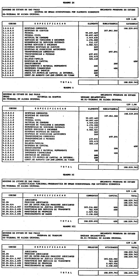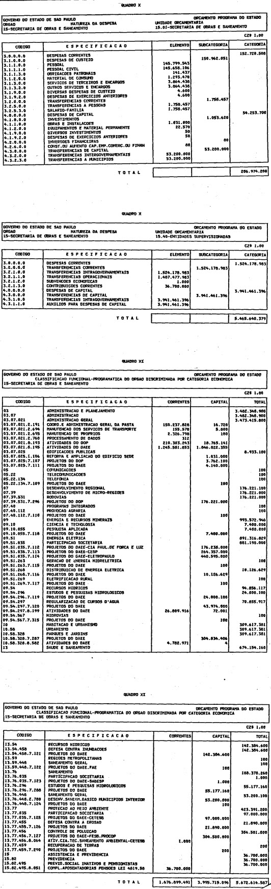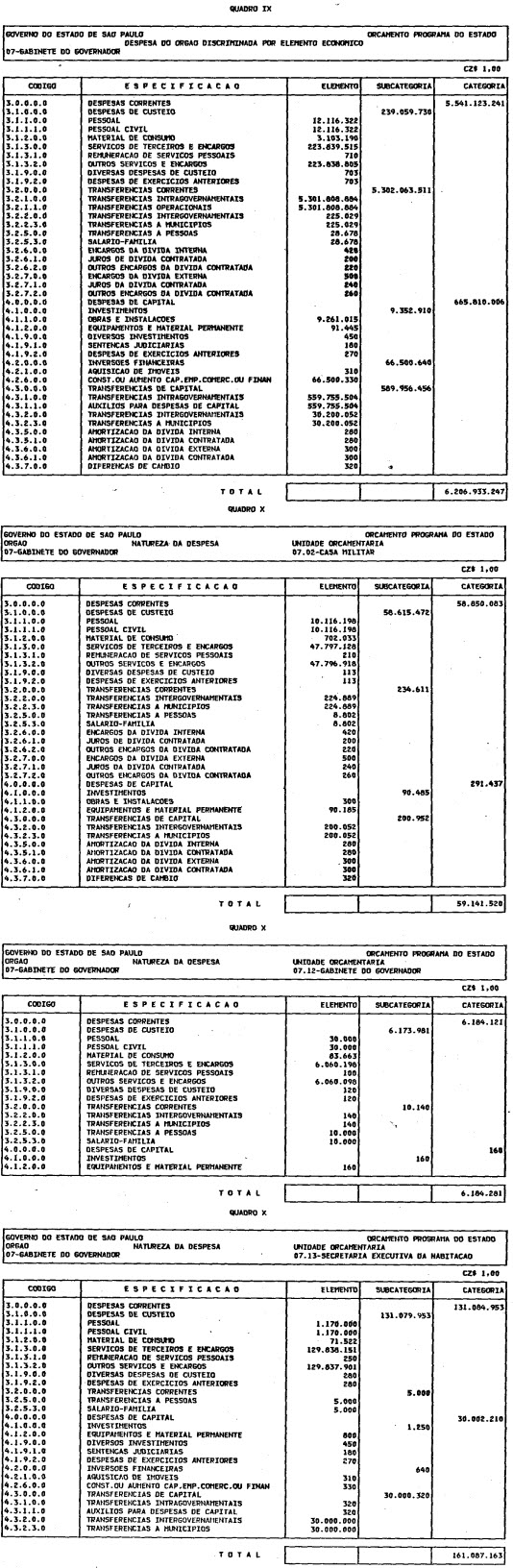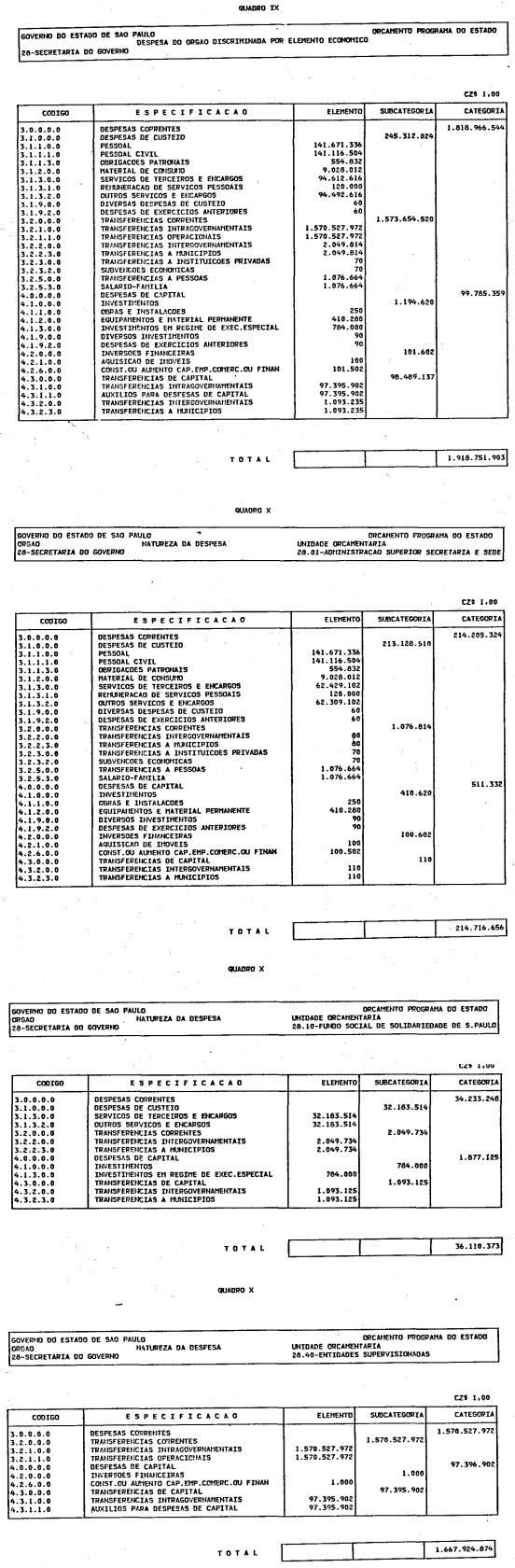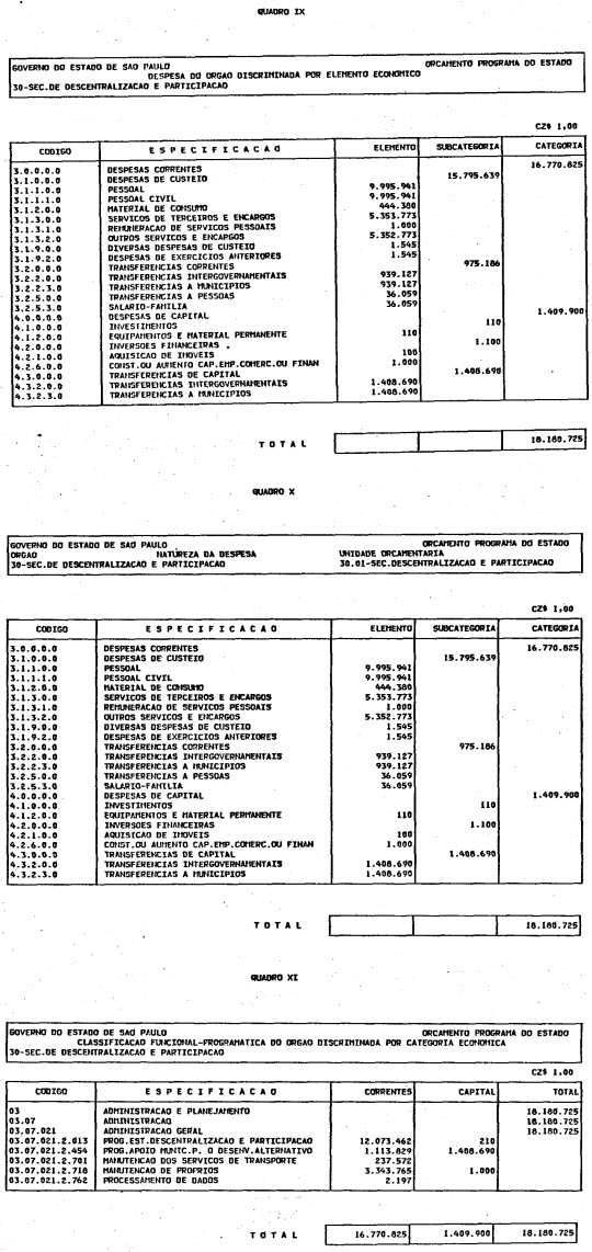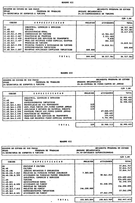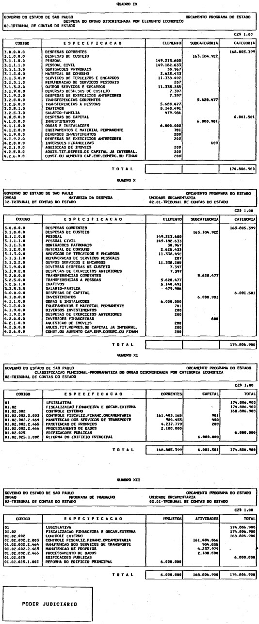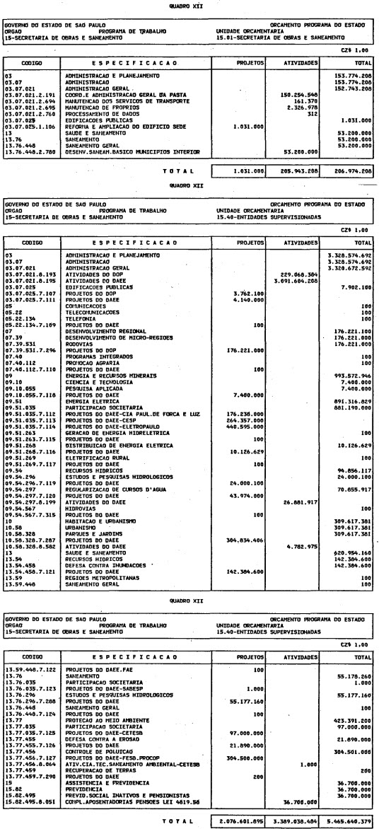 Artigo 1º - O Orçamento-Programa do Estado, para o exercício de 1987, discriminado nas tabelas explicativas que compreendem os quadros I a XII que integram esta lei e os de XIII a XXVII que a acompanham, orça a Receita e fixa a Despesa em valores iguais a Cz$ 138.066.415.735 (cento e trinta e oito bilhões, sessenta e seis milhões, quatrocentos e quinze mil, setecentos e trinta e cinco cruzados).