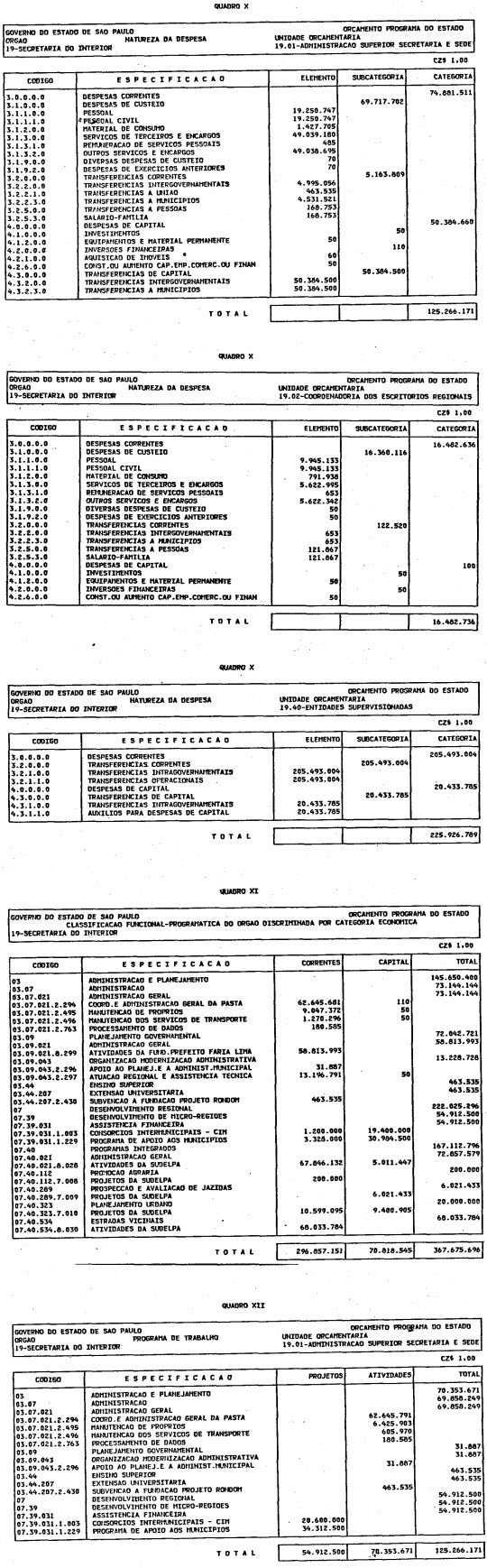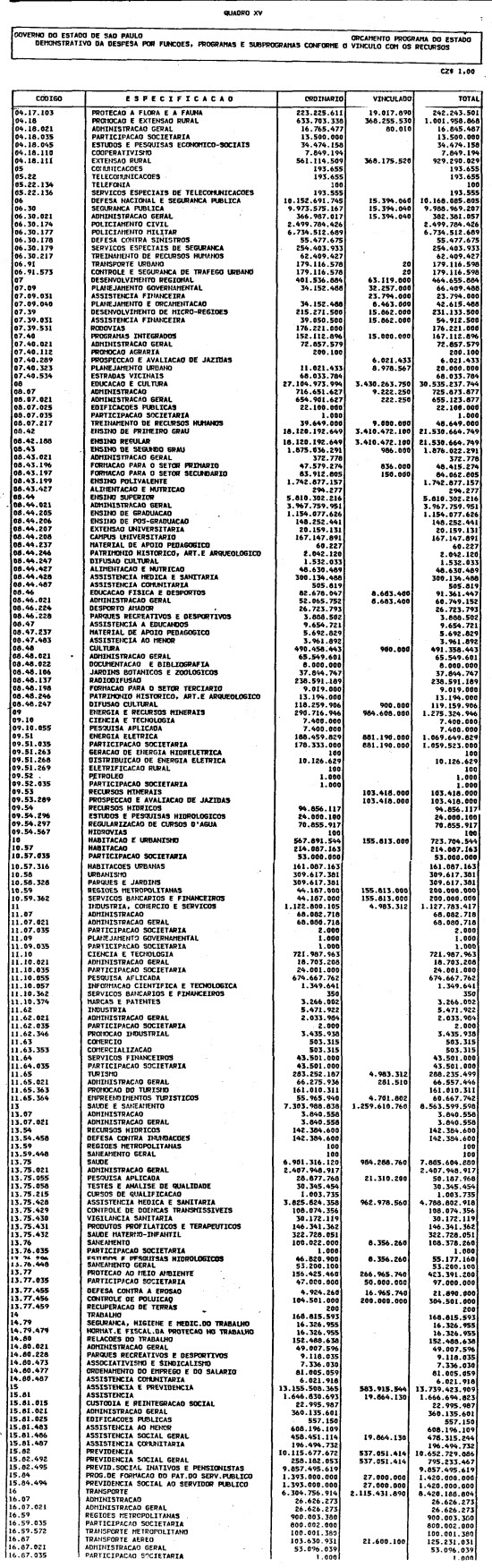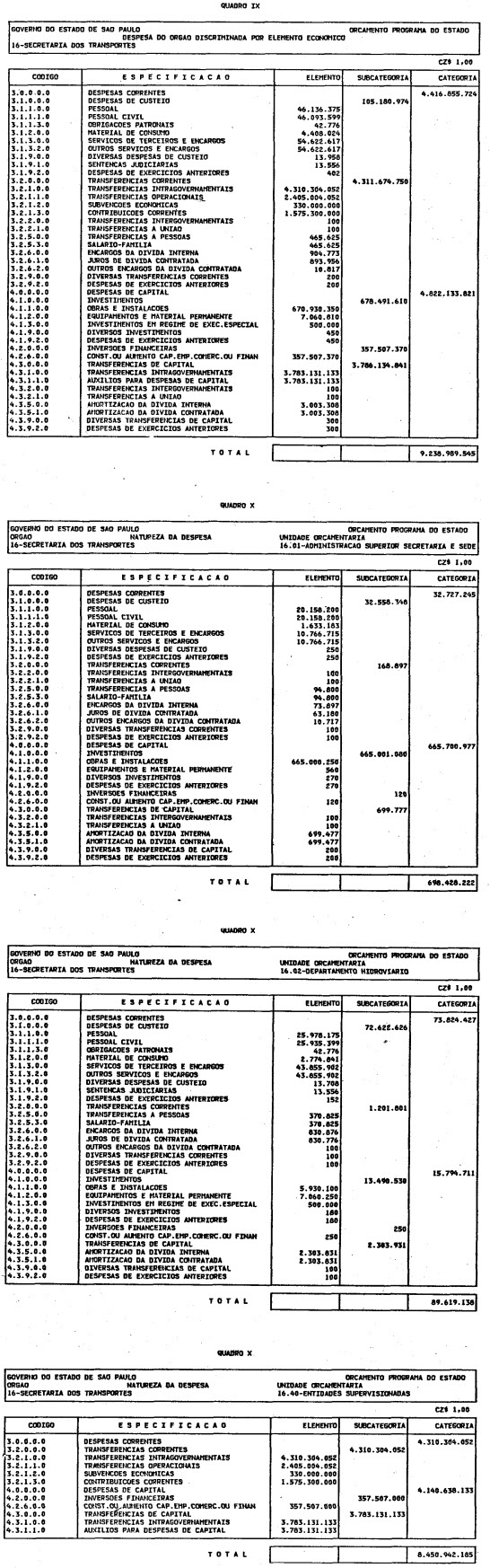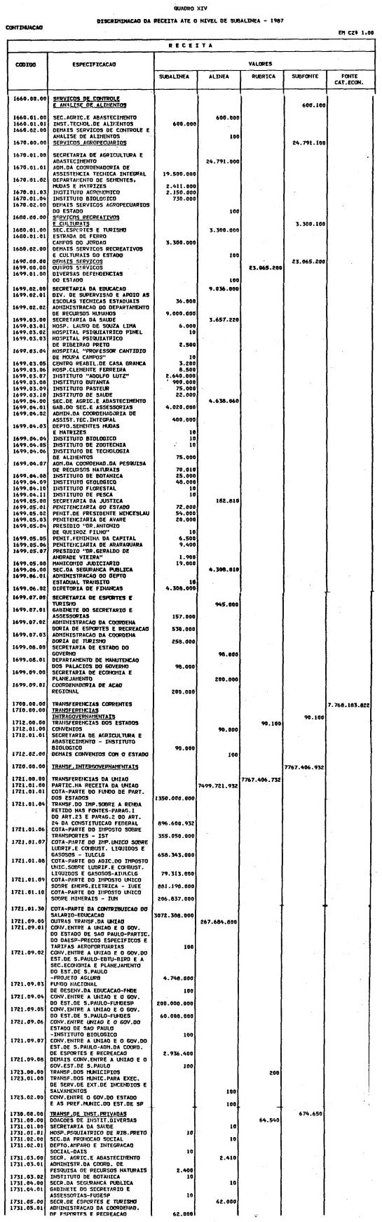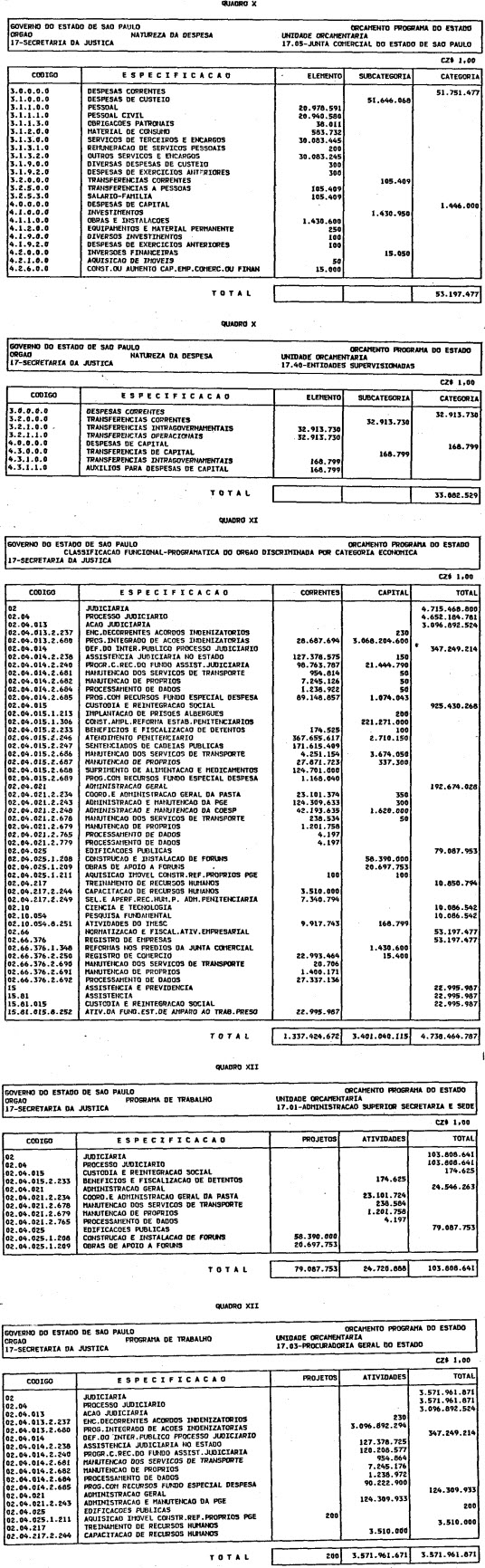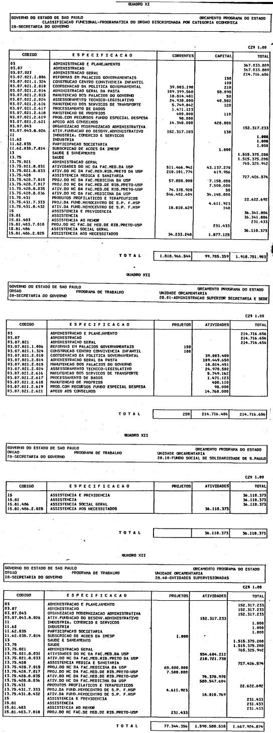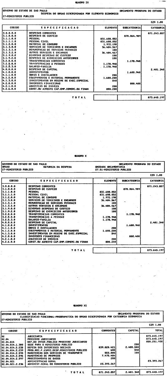 Artigo 1º - O Orçamento-Programa do Estado, para o exercício de 1987, discriminado nas tabelas explicativas que compreendem os quadros I a XII que integram esta lei e os de XIII a XXVII que a acompanham, orça a Receita e fixa a Despesa em valores iguais a Cz$ 138.066.415.735 (cento e trinta e oito bilhões, sessenta e seis milhões, quatrocentos e quinze mil, setecentos e trinta e cinco cruzados).