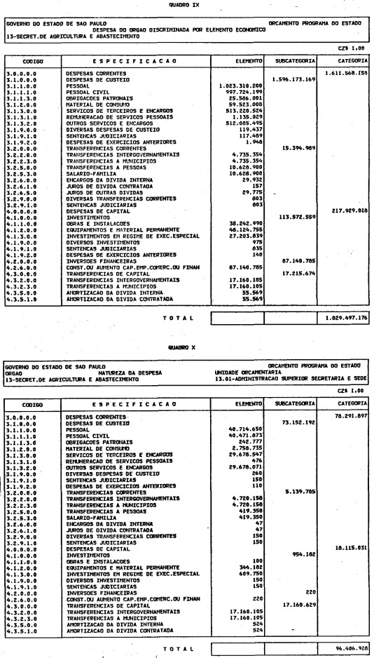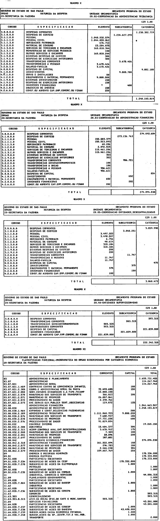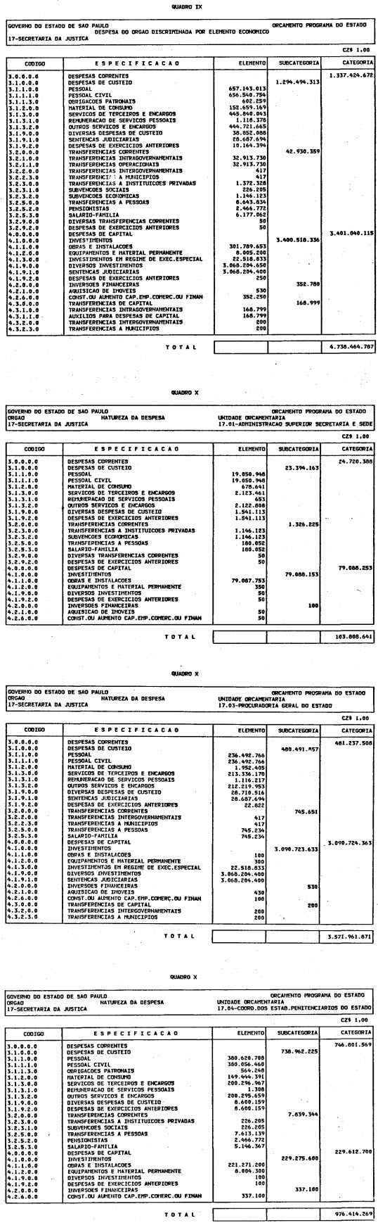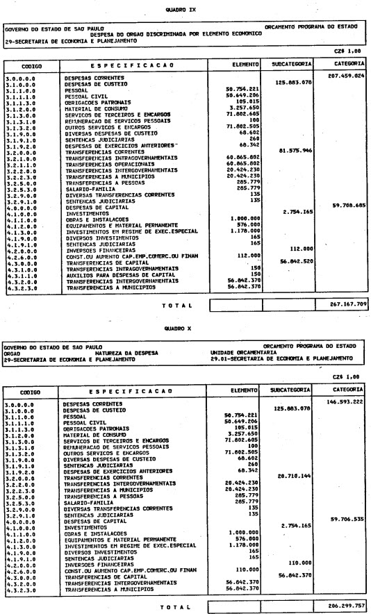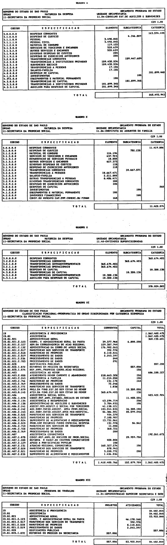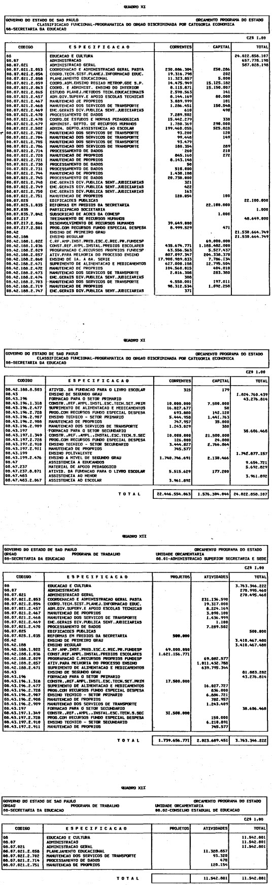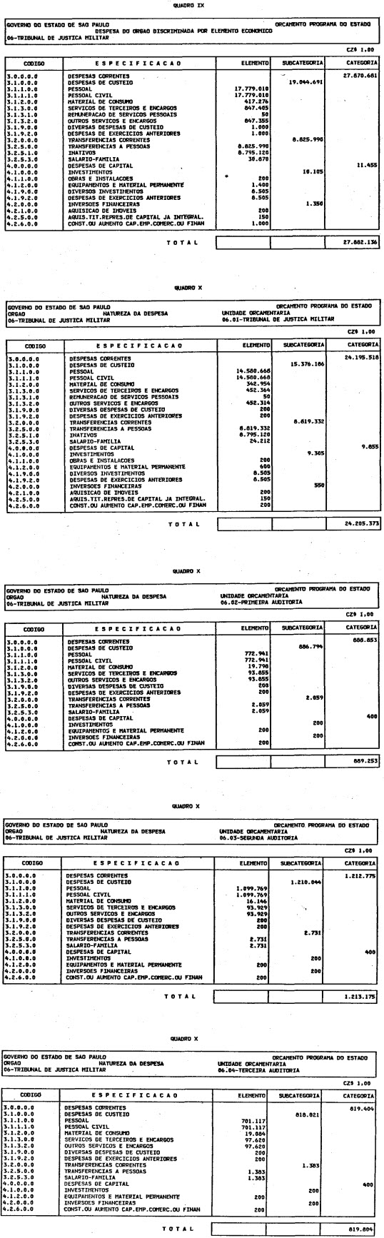 Artigo 1º - O Orçamento-Programa do Estado, para o exercício de 1987, discriminado nas tabelas explicativas que compreendem os quadros I a XII que integram esta lei e os de XIII a XXVII que a acompanham, orça a Receita e fixa a Despesa em valores iguais a Cz$ 138.066.415.735 (cento e trinta e oito bilhões, sessenta e seis milhões, quatrocentos e quinze mil, setecentos e trinta e cinco cruzados).