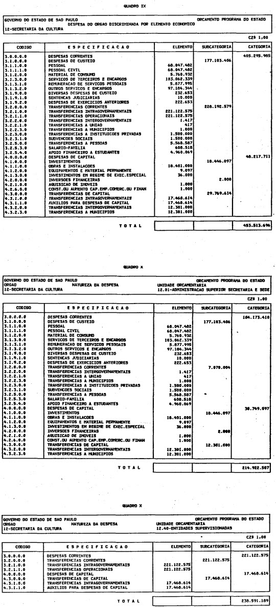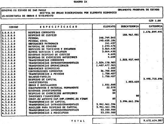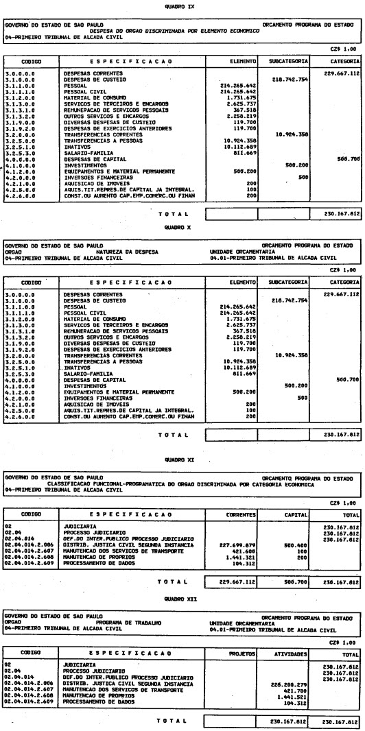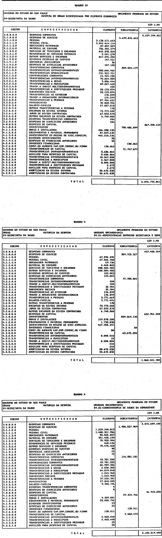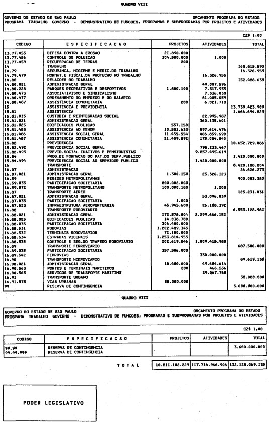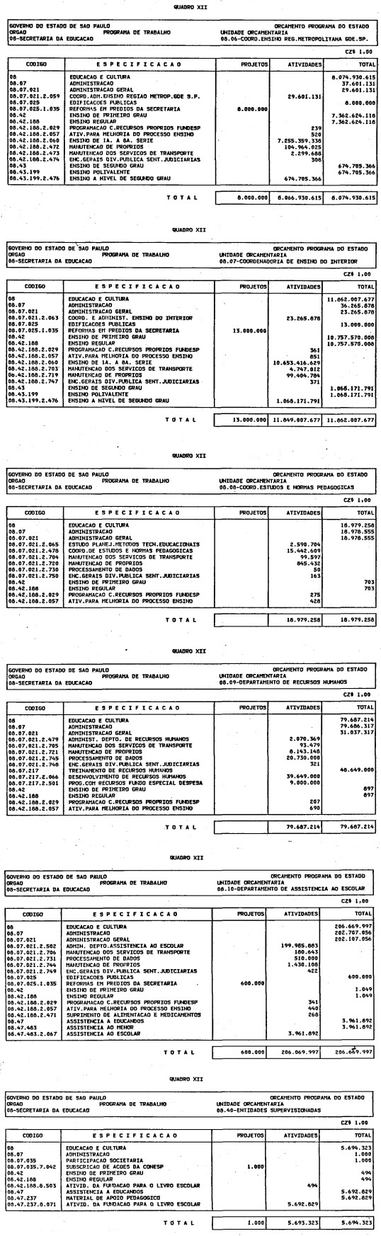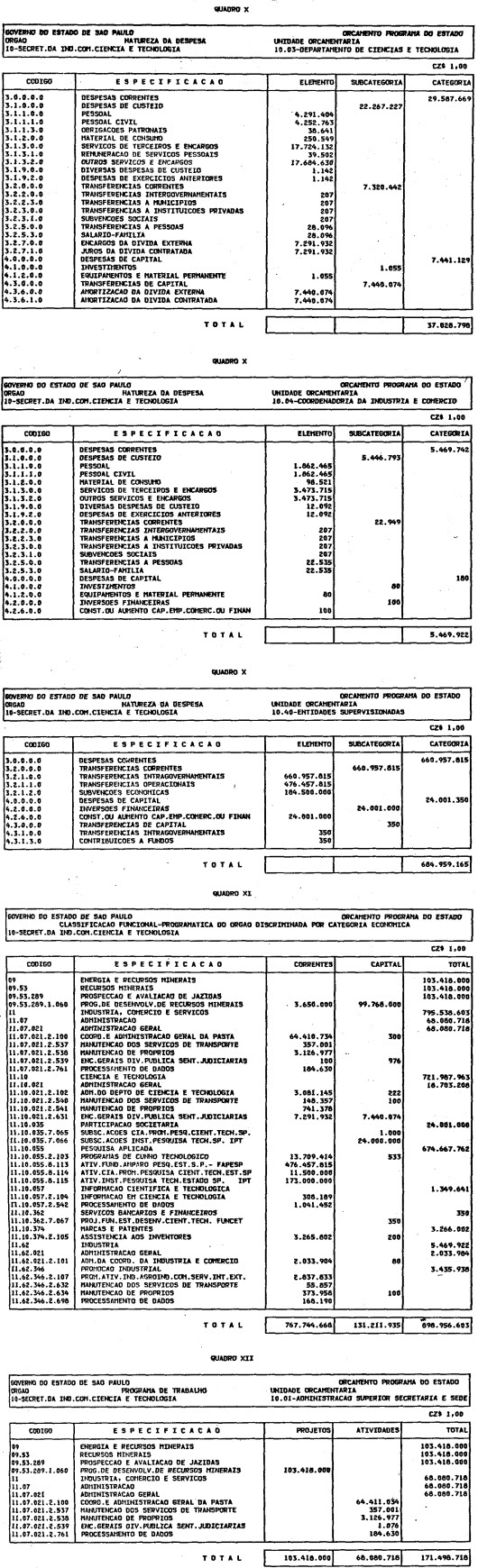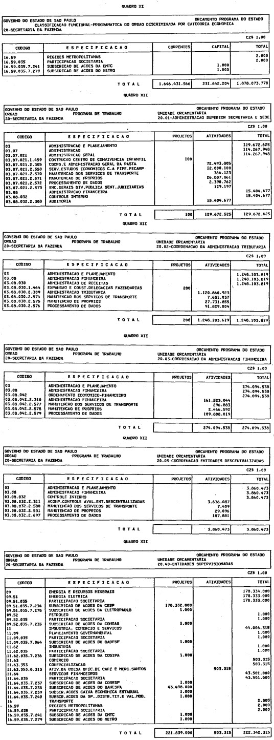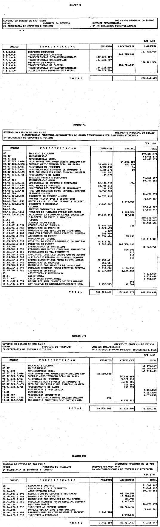 Artigo 1º - O Orçamento-Programa do Estado, para o exercício de 1987, discriminado nas tabelas explicativas que compreendem os quadros I a XII que integram esta lei e os de XIII a XXVII que a acompanham, orça a Receita e fixa a Despesa em valores iguais a Cz$ 138.066.415.735 (cento e trinta e oito bilhões, sessenta e seis milhões, quatrocentos e quinze mil, setecentos e trinta e cinco cruzados).