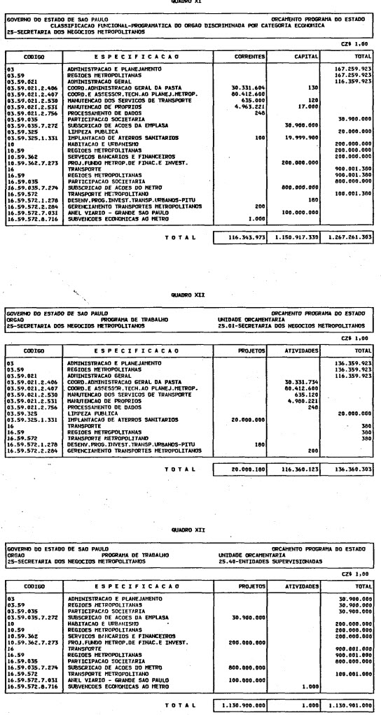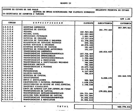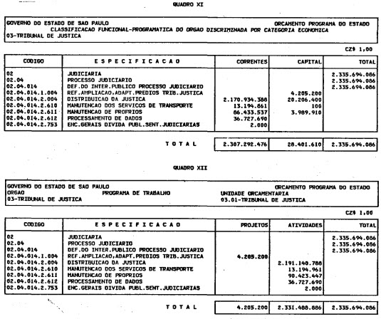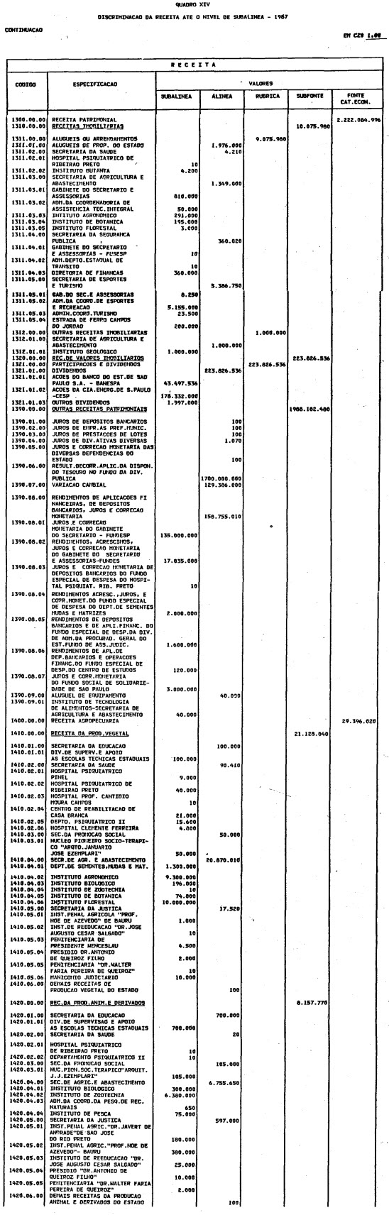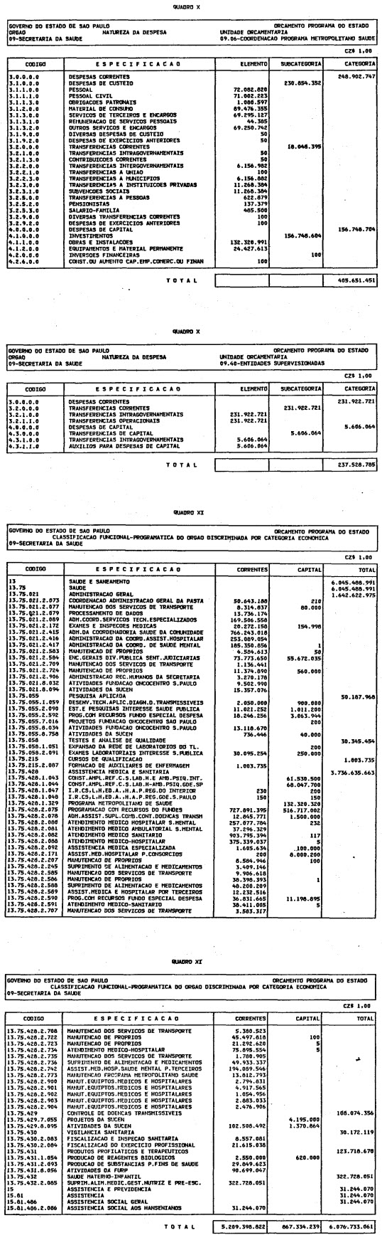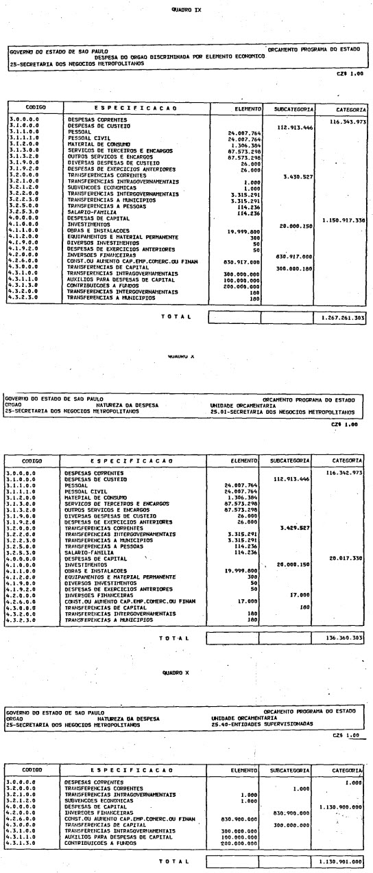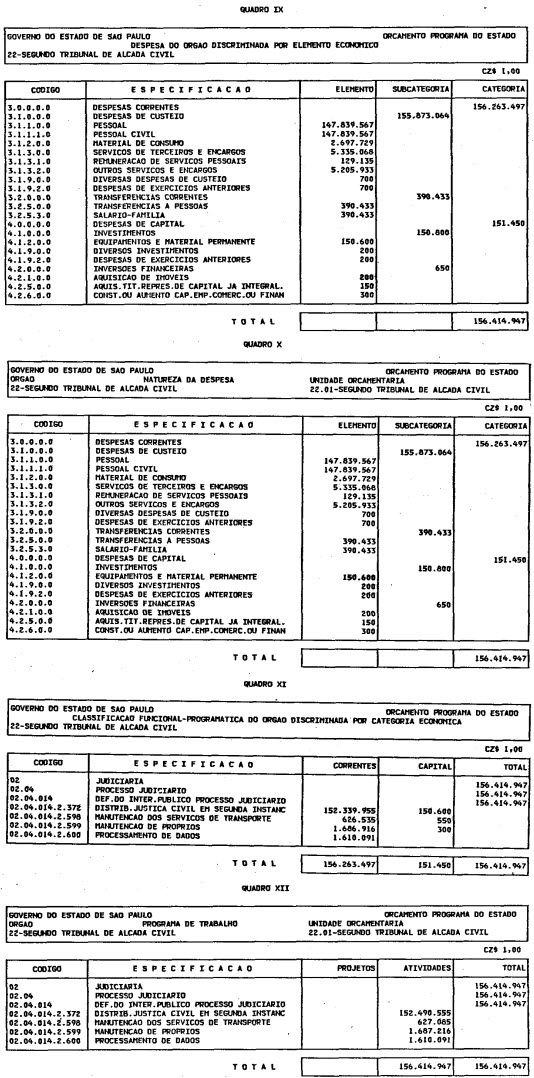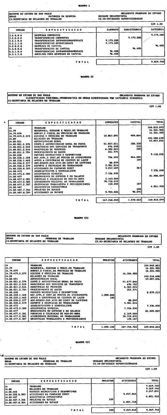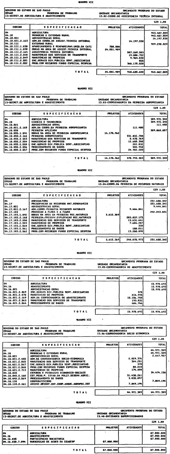 Artigo 1º - O Orçamento-Programa do Estado, para o exercício de 1987, discriminado nas tabelas explicativas que compreendem os quadros I a XII que integram esta lei e os de XIII a XXVII que a acompanham, orça a Receita e fixa a Despesa em valores iguais a Cz$ 138.066.415.735 (cento e trinta e oito bilhões, sessenta e seis milhões, quatrocentos e quinze mil, setecentos e trinta e cinco cruzados).
