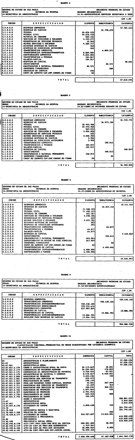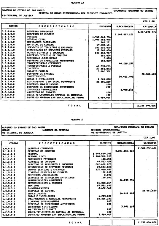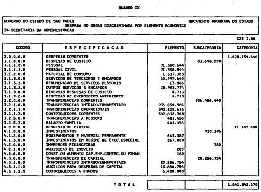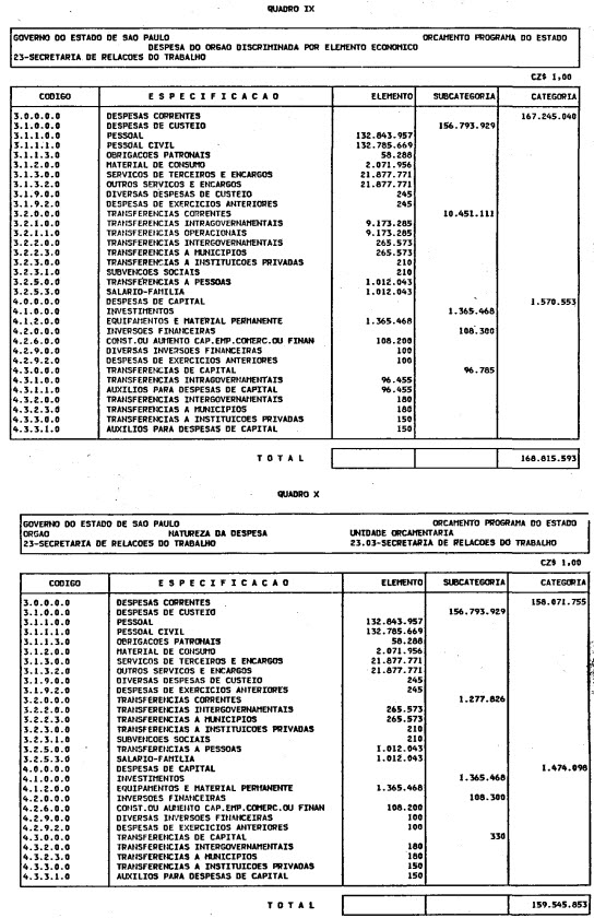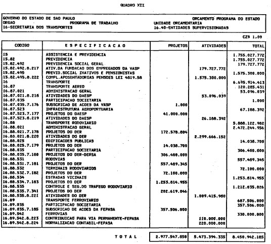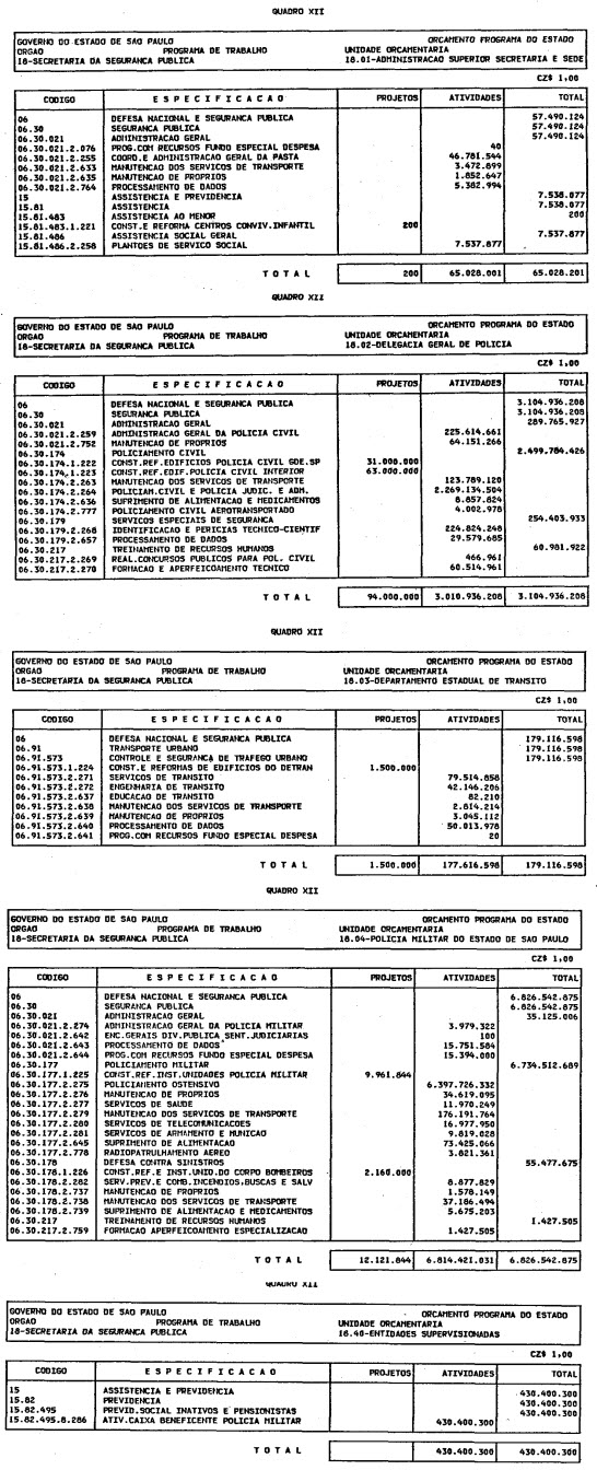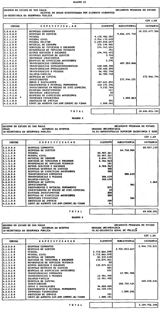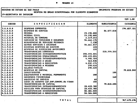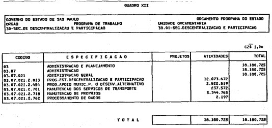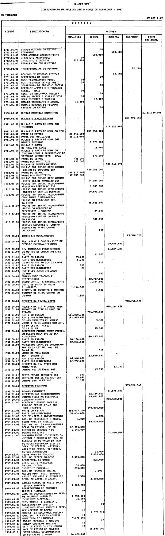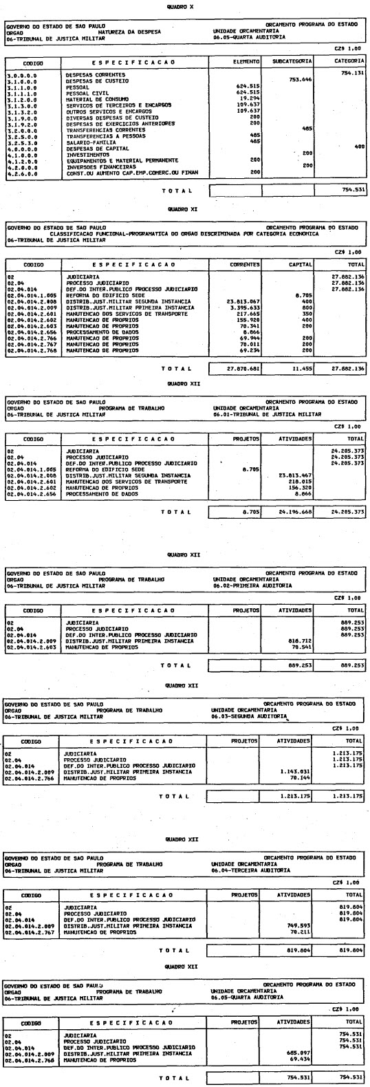 Artigo 1º - O Orçamento-Programa do Estado, para o exercício de 1987, discriminado nas tabelas explicativas que compreendem os quadros I a XII que integram esta lei e os de XIII a XXVII que a acompanham, orça a Receita e fixa a Despesa em valores iguais a Cz$ 138.066.415.735 (cento e trinta e oito bilhões, sessenta e seis milhões, quatrocentos e quinze mil, setecentos e trinta e cinco cruzados).
