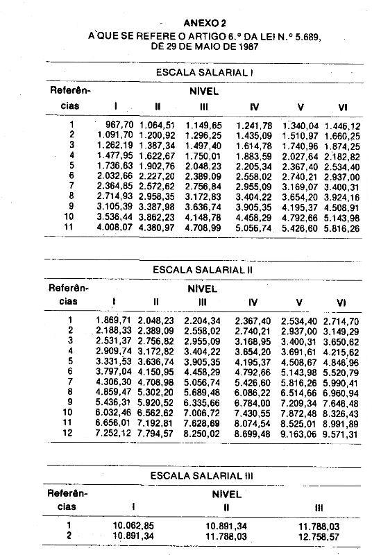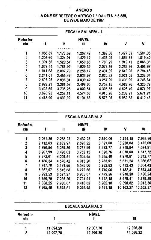 Artigo 7.º - Os valores das escalas salariais a que se refere o Artigo 21 da Lei n.º 4.569, de 16 de maio de 1985, com as alterações efetuadas nos termos do Artigo 2.° da Lei n.º 5.061, de 28 de abril de 1986, ficam reajustados: