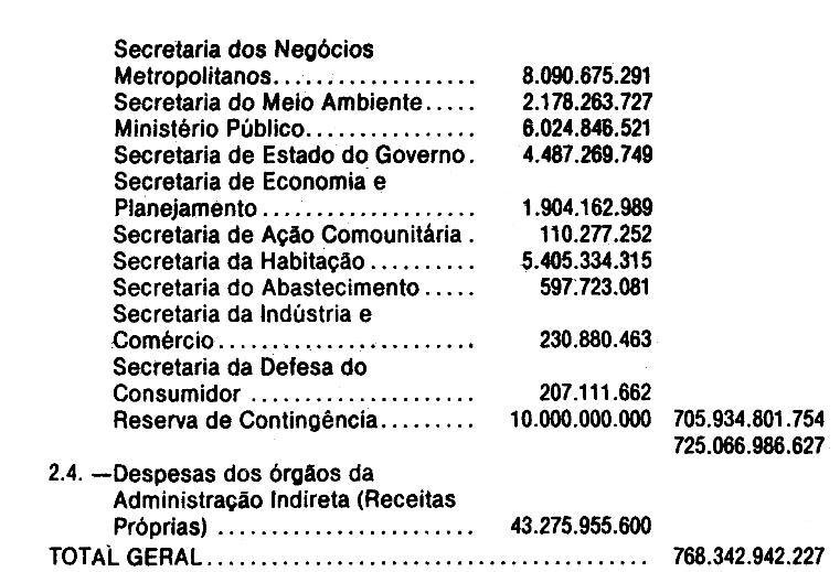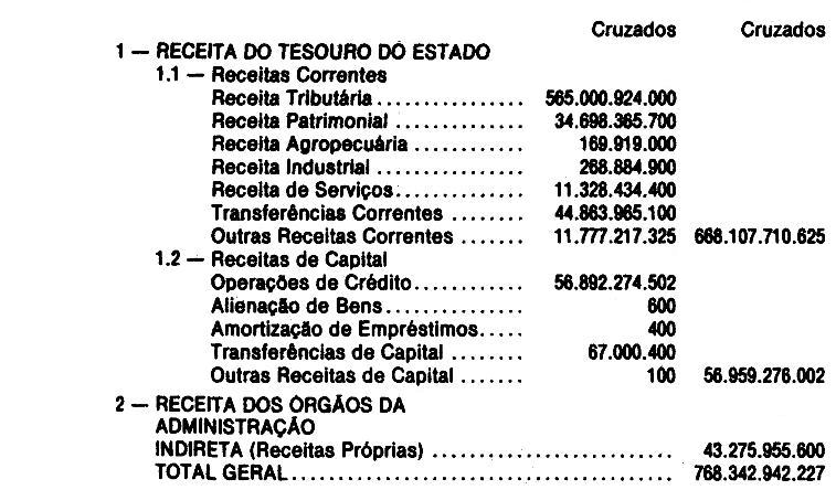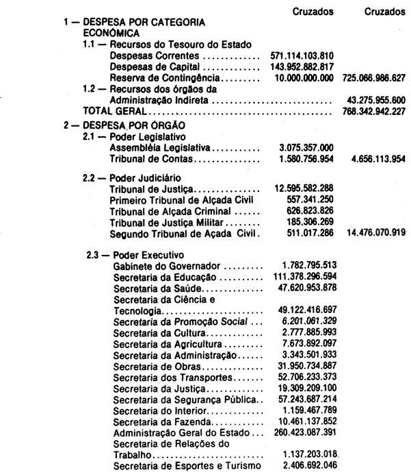 Artigo 1º - O Orçamento-Programa do Estado, para o exercício de 1988, discriminado nas tabelas explicativas que compreendem os quadros I a XXIV, orça a Receita e fixa a Despesa em valores iguais a Cz$ 768.342.942.227 (setecentos e sessenta e oito bilhões, trezentos e quarenta e dois milhões, novecentos e quarenta e dois mil, duzentos e vinte e sete cruzados).