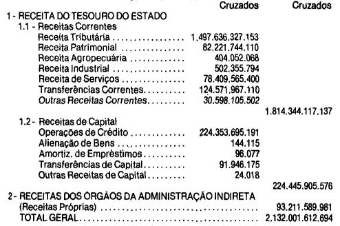 Artigo 1º - O Orçamento-Programa do Estado, para o exercício de 1989, a preços de junho de 1988, orça a Receita e fixa a Despesa em valores iguais a Cz$ 2.132.001.612.694,00 (dois trilhões, cento e trinta e dois bilhões, um milhão, seiscentos e doze mil, seiscentos e noventa e quatro cruzados).