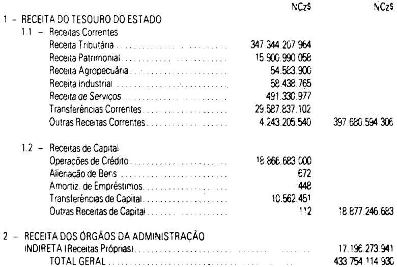 O GOVERNADOR DO ESTADO DE SÃO PAULO:Faço saber que a Assembléia Legislativa decreta e eu promulgo a seguinte lei:Artigo 1° - O Orçamento-Programa do Estado, para o exercício de 1990, discriminado nas tabelas explicativas, que compreendem os quadros I a XXIV, orça a Receita e fixa a Despesa em valores iguais a NCz$ 433.754.114.930,00 (quatrocentos e trinta e três bilhões, setecentos e cincoenta e quatro milhões, cento e quatorze mil, novecentos e trinta cruzados novos).Parágrafo único - Incluem-se no total referido neste artigo os recursos próprios das entidades da Administração Indireta, exceto das que não recebem transferências à conta do Tesouro do Estado.Artigo 2° - A Receita será arrecadada nos termos da legislação vigente e das especificações dos quadros integrantes deste orçamento, observado o seguinte desdobramento: