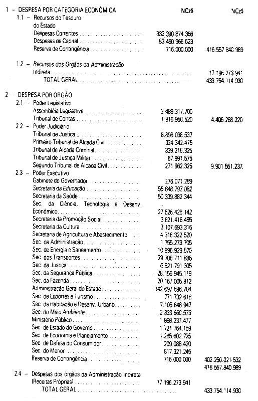 O GOVERNADOR DO ESTADO DE SÃO PAULO:Faço saber que a Assembléia Legislativa decreta e eu promulgo a seguinte lei:Artigo 1° - O Orçamento-Programa do Estado, para o exercício de 1990, discriminado nas tabelas explicativas, que compreendem os quadros I a XXIV, orça a Receita e fixa a Despesa em valores iguais a NCz$ 433.754.114.930,00 (quatrocentos e trinta e três bilhões, setecentos e cincoenta e quatro milhões, cento e quatorze mil, novecentos e trinta cruzados novos).Parágrafo único - Incluem-se no total referido neste artigo os recursos próprios das entidades da Administração Indireta, exceto das que não recebem transferências à conta do Tesouro do Estado.Artigo 2° - A Receita será arrecadada nos termos da legislação vigente e das especificações dos quadros integrantes deste orçamento, observado o seguinte desdobramento: