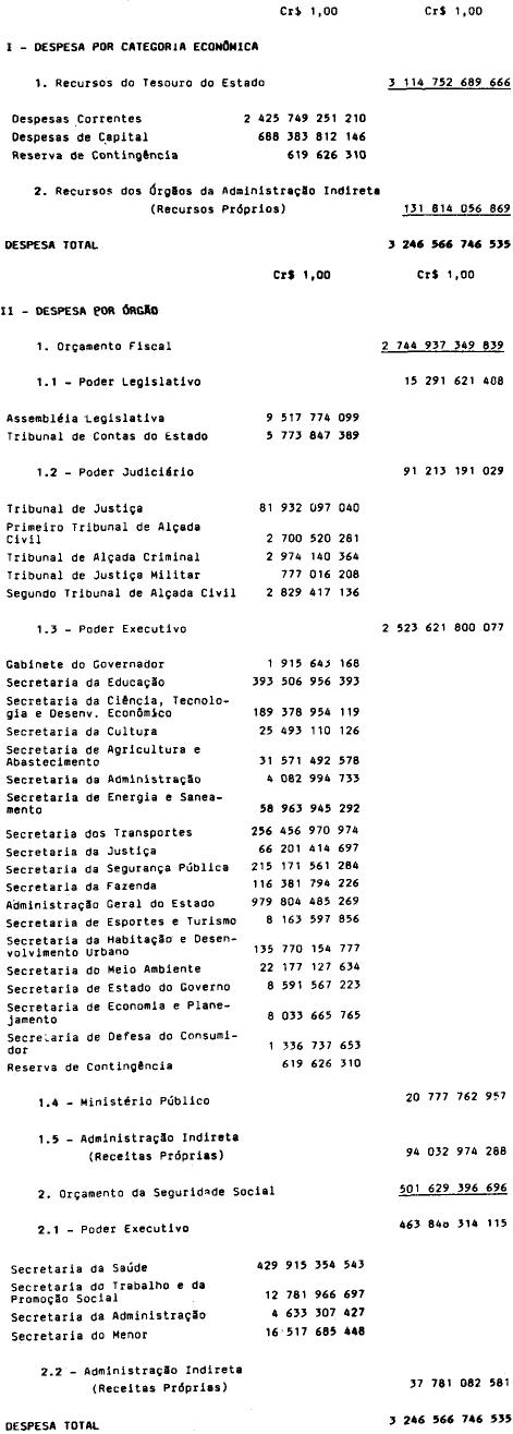 Artigo 4º - A Despesa total, no mesmo valor da Receita total, é fixada em Cr$ 3.246.566.746.535,00 (três trilhões, duzentos e quarenta e seis bilhões, quinhentos e sessenta e seis milhões, setecentos e quarenta e seis mil, quinhentos e trinta e cinco cruzeiros), assim desdobrados: