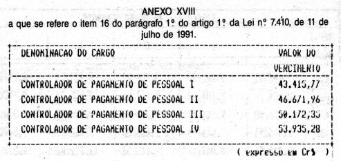 16 - Anexo XVIII - correspondente aos integrantes das classes de Controlador de Pagamento de Pessoal I, II, III e IV, de que trata o § 1.º do Artigo 1.º da Lei Complementar n. 578, de 13 de dezembro de 1988.