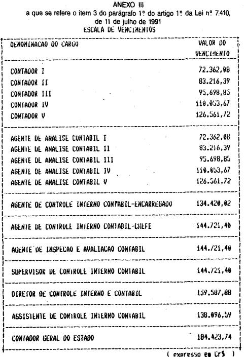 3 - Anexo III - correspondente aos integrantes da série de classes de Contador e dos Cargos em Comissão, de que trata o § 1.º do Artigo 12 da Lei Complementar n. 549, de 24 de junho de 1988;