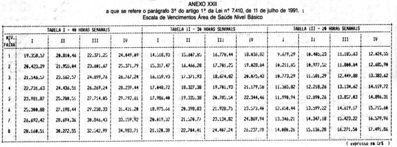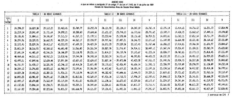 § 3.º - Os valores das Escalas de Vencimentos Nível Básico, Nível Médio, Área Saúde Nível Básico e Área Saúde Nível Médio, instituídas pelo Artigo 7.º da Lei Complementar n. 585, de 21 de dezembro de 1988, são, em decorrência do disposto no "caput", os fixados nos Anexos XX, XXI, XXII e XXIII.