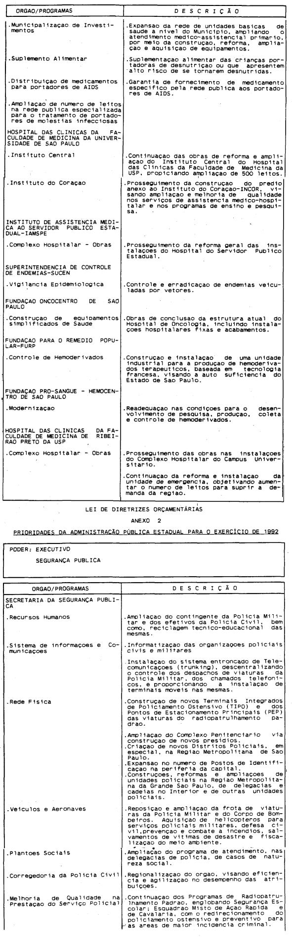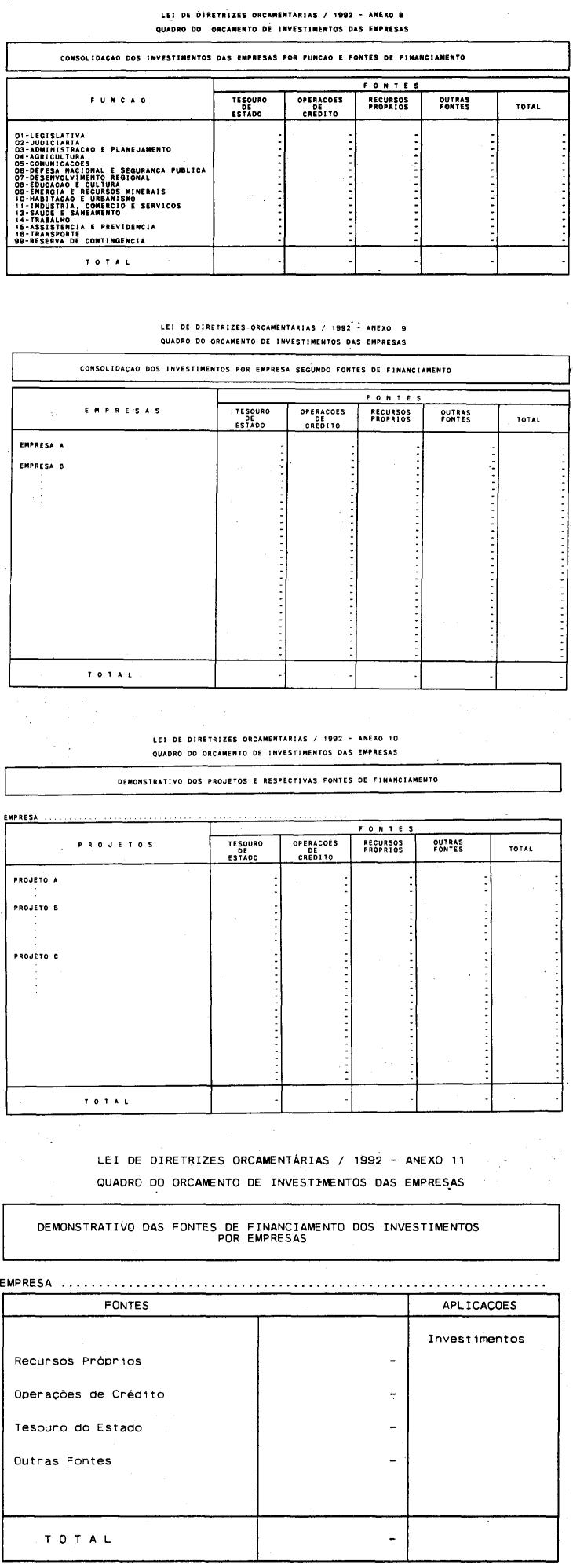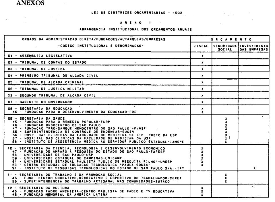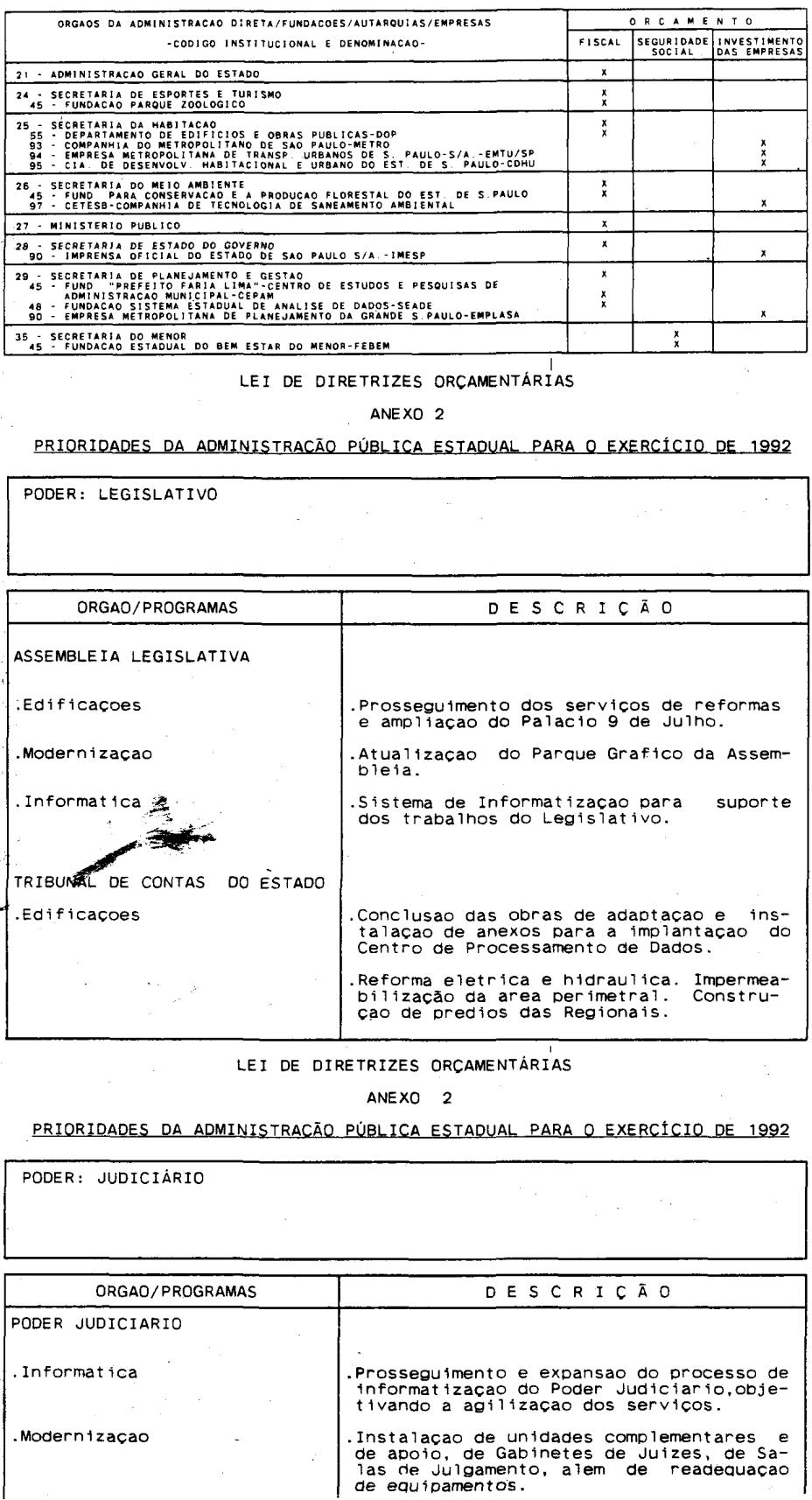 Artigo 3º - A proposta orçamentária do Estado para 1992 será integrada por todos os órgãos dos Poderes Legislativo, Executivo e Judiciário e do Ministério Público, que comporão, nos termos do artigo 2º desta lei, o orçamento fiscal, o orçamento de investimentos das empresas e o orçamento da seguridade social, na forma do Anexo 1 que acompanha esta lei.