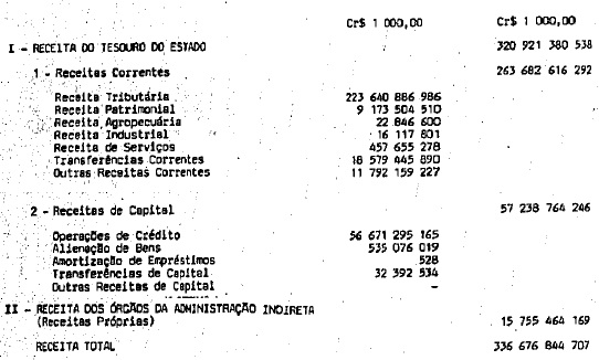 Artigo 2º - A Receita total é orçada e a Despesa total fixada em valores iguais a Cr$ 336.676.844.707.000,00 (trezentos e trinta e seis trilhões, seiscentos e setenta e seis bilhões, oitocentos e quarenta e quatro milhões, setecentos e sete mil cruzeiros).