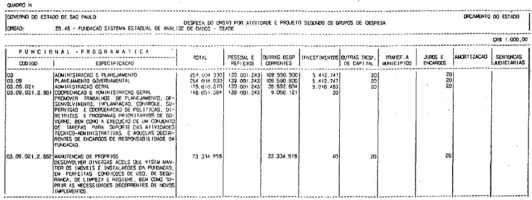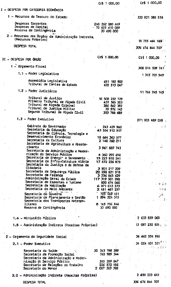 Artigo 4º - A Despesa Total, no mesmo valor da Receita Total, é fixada em Cr$ 336.676.844.741.000,00 (trezentos e trinta e seis trilhões, seiscentos e setenta e seis bilhões, oitocentos e quarenta e quatro milhões, setecentos e quarenta e um mil cruzeiros), assim desdobrados: