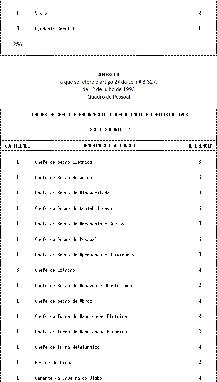 “II — Escala Salarial 2 — constituída de 3 (três) referências, representadas por números arábicos, contendo cada uma 6 (seis) níveis, identificados por algarismos romanos de I a VI, destinada às funções de chefias e encarregaturas operacionais e administrativas;