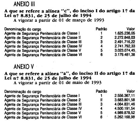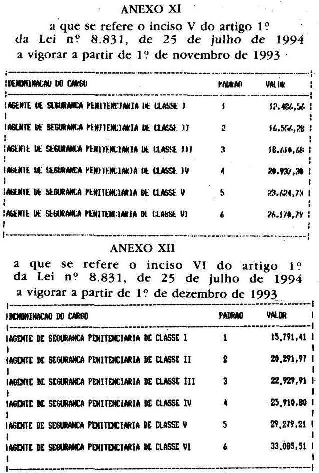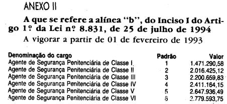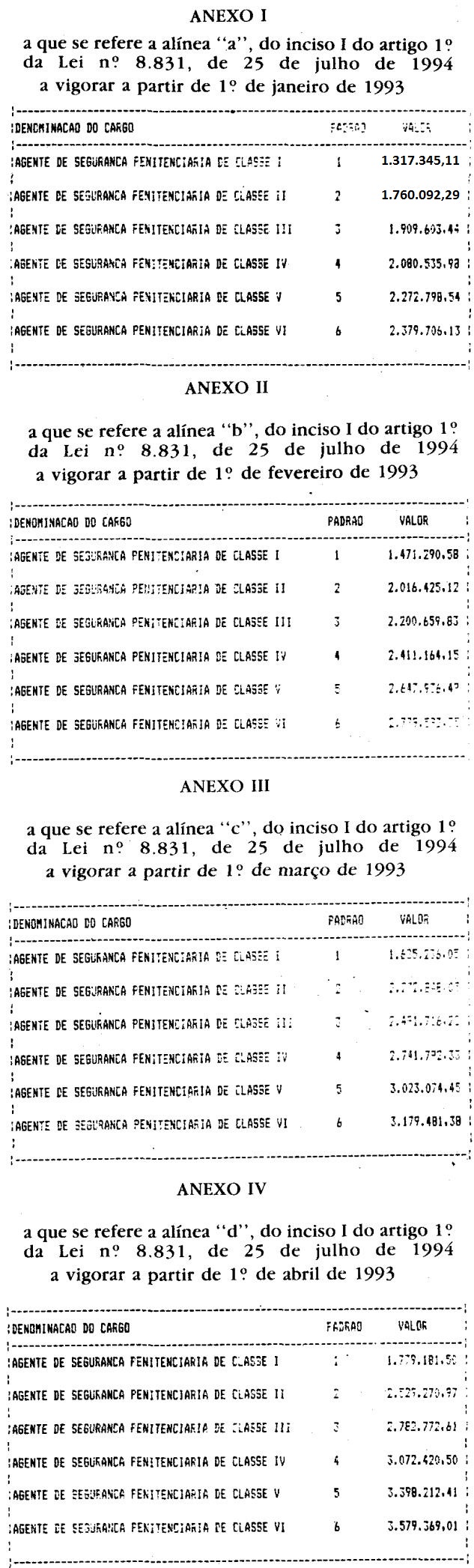 Artigo 1.º - Os valores dos padrões de vencimento dos integrantes da carreira de Agente de Segurança Penitenciária, de que trata o Artigo 2.º da Lei Complementar n. 681, de 22 de julho de 1992, ficam fixados, em decorrência do disposto no parágrafo único do Artigo 1.º da Lei Complementar n. 722, de 1º de julho de 1993, e de reclassificação, na seguinte conformidade: