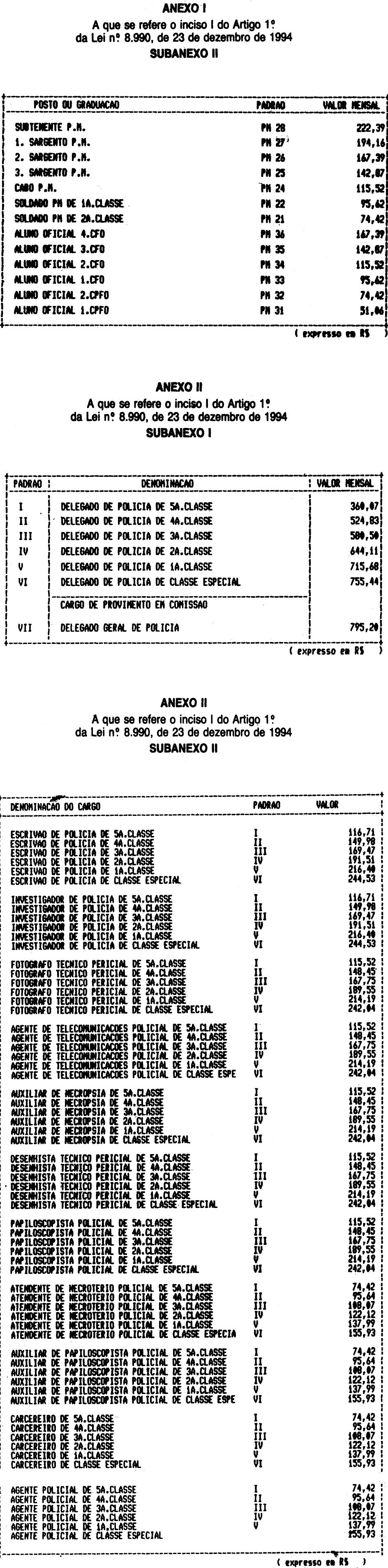 I - Anexos I e II - correspondentes aos integrantes da Polícia Militar e da Polícia Civil, de que trata o Artigo 2.º da Lei Complementar n. 731, de 26 de outubro de 1993;