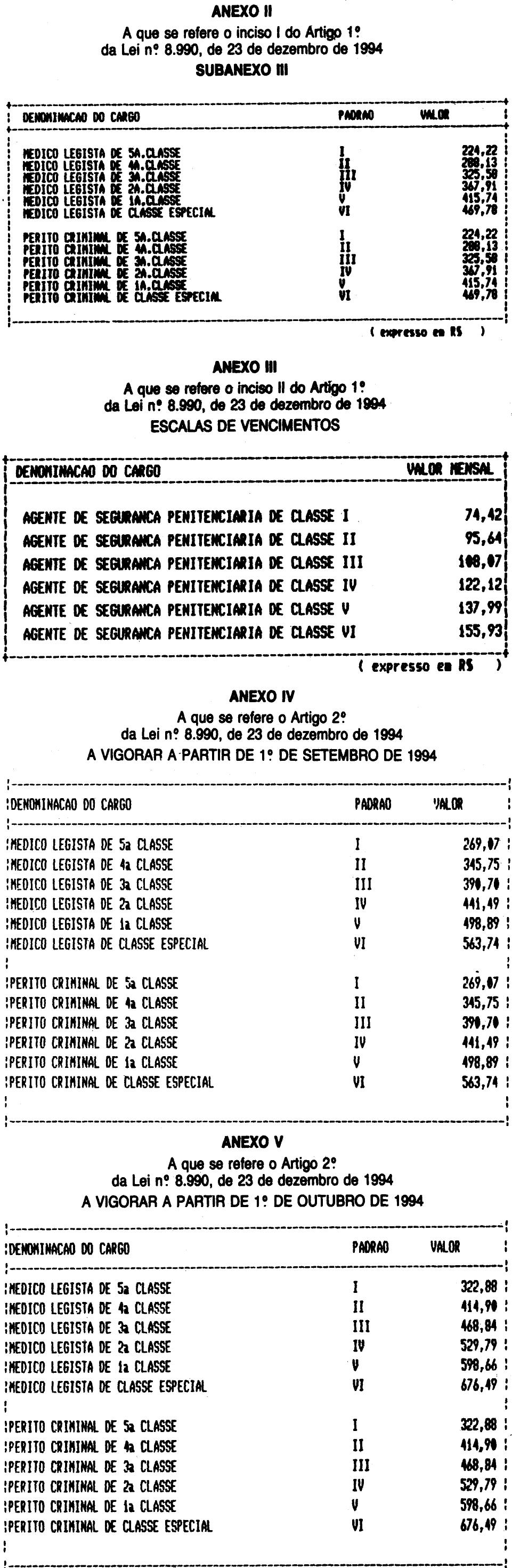 Artigo 2.º - Os vencimentos e os salários dos integrantes das carreiras constantes dos Anexos IV e V ficam fixados, em decorrência de reclassificação, a partir de 1.º de setembro de 1994 e 1.º de outubro de 1994, na conformidade dos referidos anexos.