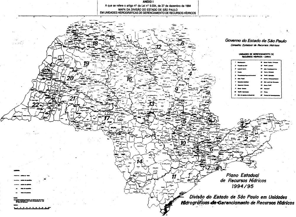 Artigo 4.º - Em atendimento ao que dispõe o Artigo 20, da Lei n. 7.663, de 30 de dezembro de 1991, fica aprovada a divisão do Estado de São Paulo em 22 (vinte e duas) Unidades Hidrográficas de Gerenciamento de Recursos Hídricos — UGRHI, conforme consta do Anexo I.