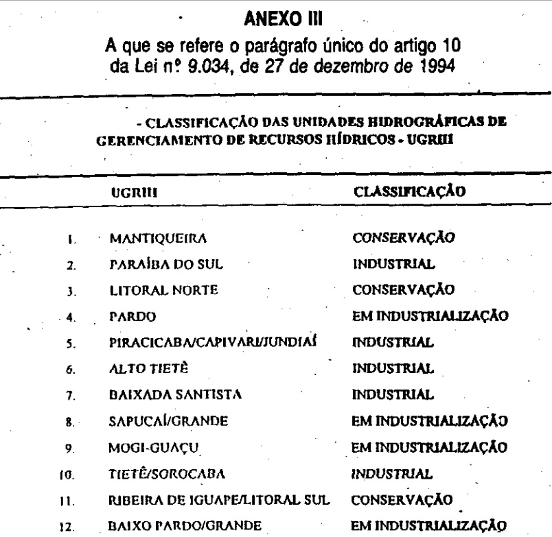 Parágrafo único - As Unidades de Gerenciamento de Recursos Hídricos — UGRHI, estabelecidas por este PERH, ficam classificados em conformidade com o Anexo III.