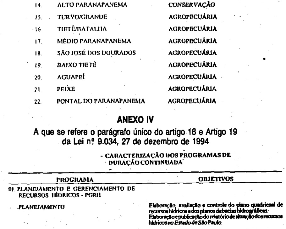 Artigo 19 - Os Programas de Duração Continuada - PDC, integrantes deste Plano, estão especificados e caracterizados no Anexo IV.